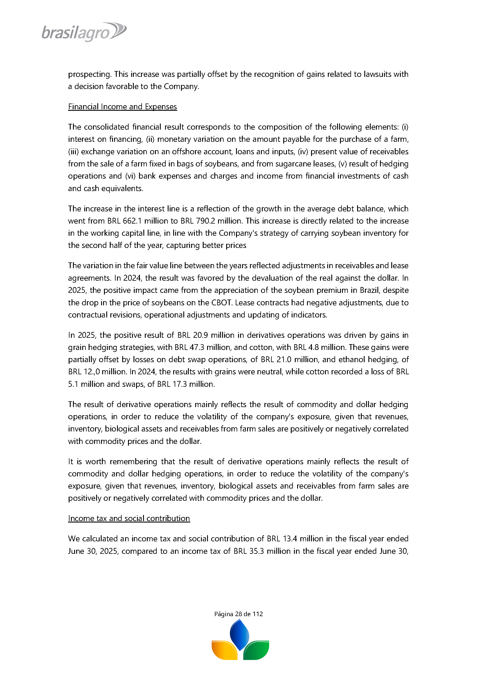 prospecting . This increase was partially offset by the recognition of gains related to lawsuits with a decision favorable to the Company . Financial Income and Expenses The consolidated financial result corresponds to the composition of the following elements : (i) interest on financing, (ii) monetary variation on the amount payable for the purchase of a farm, (iii) exchange variation on an offshore account, loans and inputs, (iv) present value of receivables from the sale of a farm fixed in bags of soybeans, and from sugarcane leases, (v) result of hedging operations and (vi) bank expenses and charges and income from financial investments of cash and cash equivalents . The increase in the interest line is a reflection of the growth in the average debt balance, which went from BRL 662 . 1 million to BRL 790 . 2 million . This increase is directly related to the increase in the working capital line, in line with the Company's strategy of carrying soybean inventory for the second half of the year, capturing better prices The variation in the fair value line between the years reflected adjustments in receivables and lease agreements . In 2024 , the result was favored by the devaluation of the real against the dollar . In 2025 , the positive impact came from the appreciation of the soybean premium in Brazil, despite the drop in the price of soybeans on the CBOT . Lease contracts had negative adjustments, due to contractual revisions, operational adjustments and updating of indicators . In 2025 , the positive result of BRL 20 . 9 million in derivatives operations was driven by gains in grain hedging strategies, with BRL 47 . 3 million, and cotton, with BRL 4 . 8 million . These gains were partially offset by losses on debt swap operations, of BRL 21 . 0 million, and ethanol hedging, of BRL 12 . , 0 million . In 2024 , the results with grains were neutral, while cotton recorded a loss of BRL 5 . 1 million and swaps, of BRL 17 . 3 million . The result of derivative operations mainly reflects the result of commodity and dollar hedging operations, in order to reduce the volatility of the company's exposure, given that revenues, inventory, biological assets and receivables from farm sales are positively or negatively correlated with commodity prices and the dollar . It is worth remembering that the result of derivative operations mainly reflects the result of commodity and dollar hedging operations, in order to reduce the volatility of the company's exposure, given that revenues, inventory, biological assets and receivables from farm sales are positively or negatively correlated with commodity prices and the dollar . Income tax and social contribution We calculated an income tax and social contribution of BRL 13 . 4 million in the fiscal year ended June 30 , 2025 , compared to an income tax of BRL 35 . 3 million in the fiscal year ended June 30 , Página 28 de 112