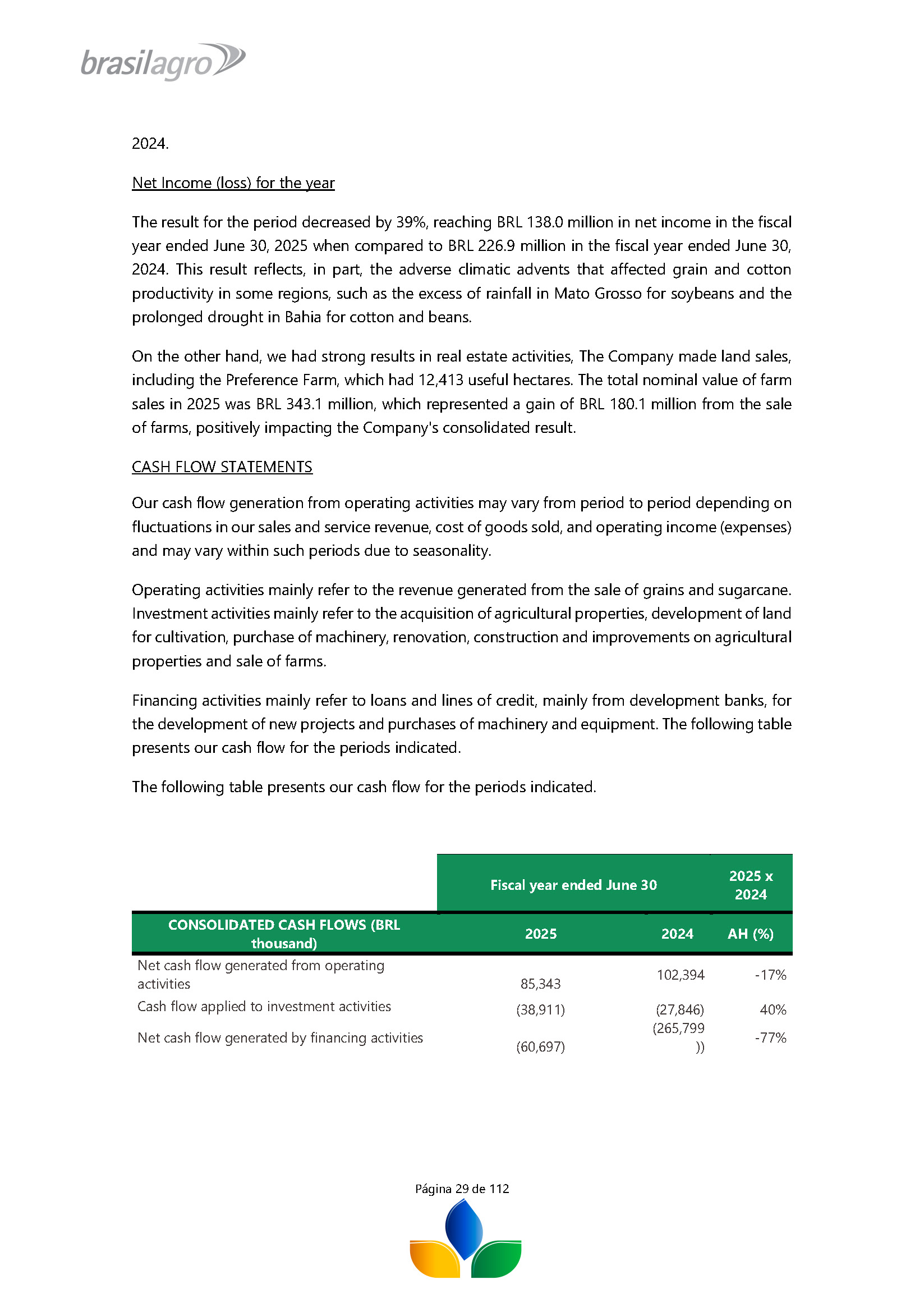 2024. Net Income (loss) for the year The result for the period decreased by 39 % , reaching BRL 138 . 0 million in net income in the fiscal year ended June 30 , 2025 when compared to BRL 226 . 9 million in the fiscal year ended June 30 , 2024 . This result reflects, in part, the adverse climatic advents that affected grain and cotton productivity in some regions, such as the excess of rainfall in Mato Grosso for soybeans and the prolonged drought in Bahia for cotton and beans . On the other hand, we had strong results in real estate activities, The Company made land sales, including the Preference Farm, which had 12 , 413 useful hectares . The total nominal value of farm sales in 2025 was BRL 343 . 1 million, which represented a gain of BRL 180 . 1 million from the sale of farms, positively impacting the Company's consolidated result . CASH FLOW STATEMENTS Our cash flow generation from operating activities may vary from period to period depending on fluctuations in our sales and service revenue, cost of goods sold, and operating income (expenses) and may vary within such periods due to seasonality . Operating activities mainly refer to the revenue generated from the sale of grains and sugarcane . Investment activities mainly refer to the acquisition of agricultural properties, development of land for cultivation, purchase of machinery, renovation, construction and improvements on agricultural properties and sale of farms . Financing activities mainly refer to loans and lines of credit, mainly from development banks, for the development of new projects and purchases of machinery and equipment . The following table presents our cash flow for the periods indicated . The following table presents our cash flow for the periods indicated. Página 29 de 112 2025 x 2024 Fiscal year ended June 30 AH (%) 2024 2025 CONSOLIDATED CASH FLOWS (BRL thousand) - 17% 102,394 85,343 Net cash flow generated from operating activities 40% (27,846) (38,911) Cash flow applied to investment activities - 77% (265,799 )) (60,697) Net cash flow generated by financing activities
