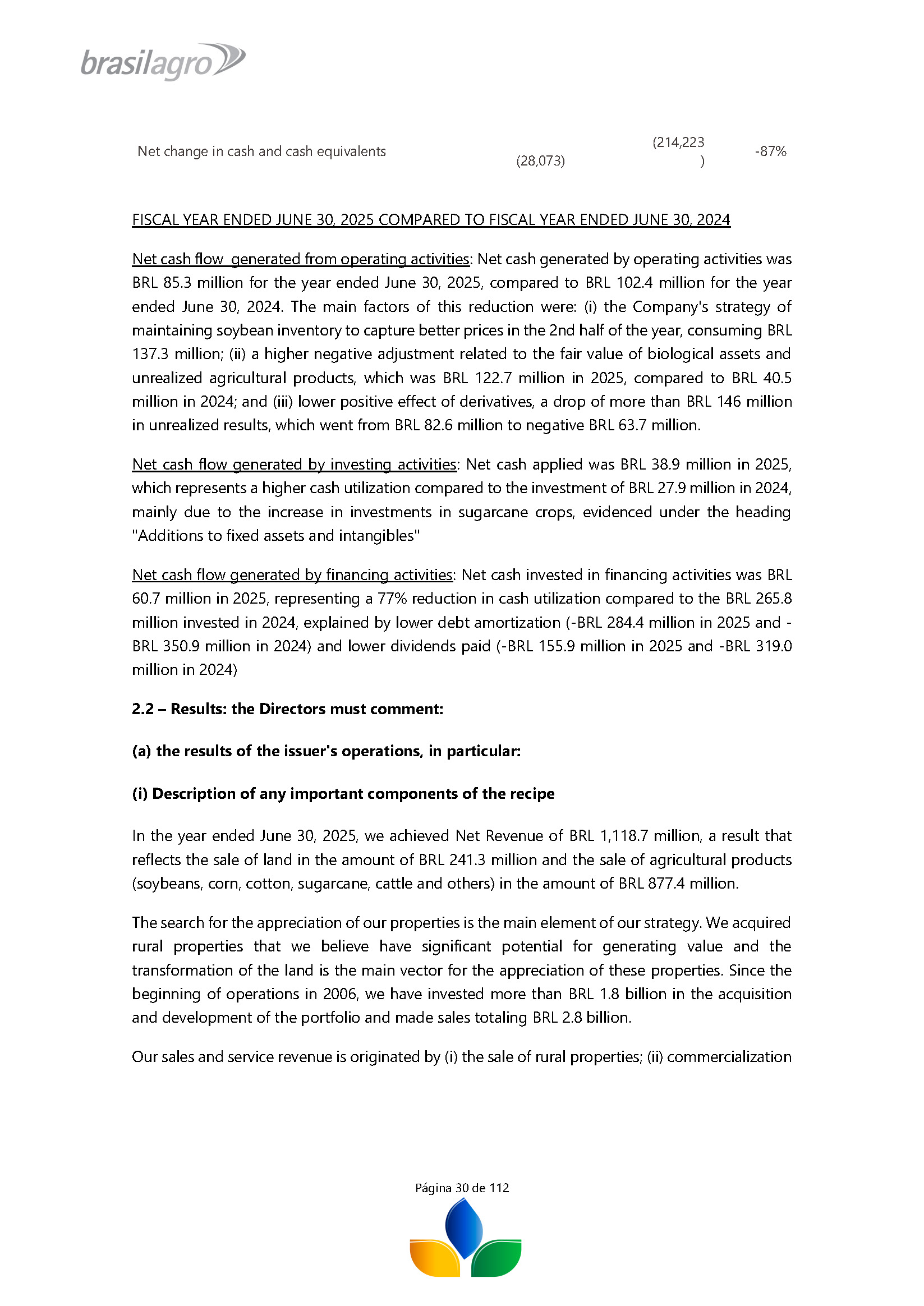 Net change in cash and cash equivalents Página 30 de 112 (28,073) (214,223 ) - 87% FISCAL YEAR ENDED JUNE 30 , 2025 COMPARED TO FISCAL YEAR ENDED JUNE 30 , 2024 Net cash flow generated from operating activities : Net cash generated by operating activities was BRL 85 . 3 million for the year ended June 30 , 2025 , compared to BRL 102 . 4 million for the year ended June 30 , 2024 . The main factors of this reduction were : (i) the Company's strategy of maintaining soybean inventory to capture better prices in the 2 nd half of the year, consuming BRL 137 . 3 million ; (ii) a higher negative adjustment related to the fair value of biological assets and unrealized agricultural products, which was BRL 122 . 7 million in 2025 , compared to BRL 40 . 5 million in 2024 ; and (iii) lower positive effect of derivatives, a drop of more than BRL 146 million in unrealized results, which went from BRL 82 . 6 million to negative BRL 63 . 7 million . Net cash flow generated by investing activities : Net cash applied was BRL 38 . 9 million in 2025 , which represents a higher cash utilization compared to the investment of BRL 27 . 9 million in 2024 , mainly due to the increase in investments in sugarcane crops, evidenced under the heading "Additions to fixed assets and intangibles" Net cash flow generated by financing activities : Net cash invested in financing activities was BRL 60 . 7 million in 2025 , representing a 77 % reduction in cash utilization compared to the BRL 265 . 8 million invested in 2024 , explained by lower debt amortization ( - BRL 284 . 4 million in 2025 and - BRL 350 . 9 million in 2024 ) and lower dividends paid ( - BRL 155 . 9 million in 2025 and - BRL 319 . 0 million in 2024 ) 2.2 – Results: the Directors must comment: (a) the results of the issuer's operations, in particular: (i) Description of any important components of the recipe In the year ended June 30 , 2025 , we achieved Net Revenue of BRL 1 , 118 . 7 million, a result that reflects the sale of land in the amount of BRL 241 . 3 million and the sale of agricultural products (soybeans, corn, cotton, sugarcane, cattle and others) in the amount of BRL 877 . 4 million . The search for the appreciation of our properties is the main element of our strategy . We acquired rural properties that we believe have significant potential for generating value and the transformation of the land is the main vector for the appreciation of these properties . Since the beginning of operations in 2006 , we have invested more than BRL 1 . 8 billion in the acquisition and development of the portfolio and made sales totaling BRL 2 . 8 billion . Our sales and service revenue is originated by (i) the sale of rural properties ; (ii) commercialization