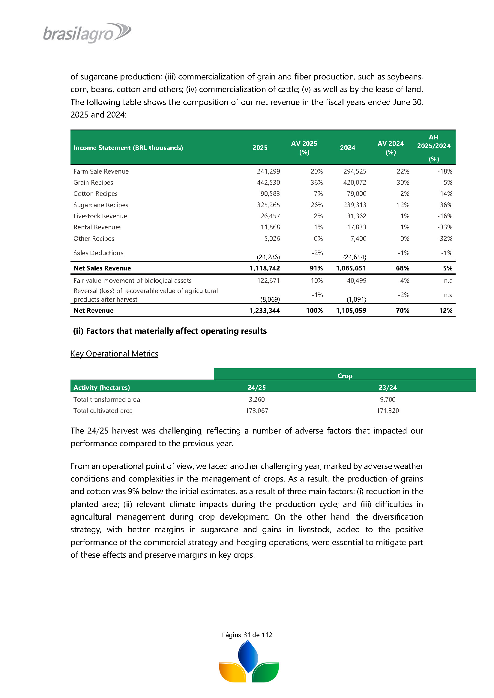 of sugarcane production ; (iii) commercialization of grain and fiber production, such as soybeans, corn, beans, cotton and others ; (iv) commercialization of cattle ; (v) as well as by the lease of land . The following table shows the composition of our net revenue in the fiscal years ended June 30 , 2025 and 2024 : Página 31 de 112 AH 2025/2024 AV 2024 (%) 2024 AV 2025 (%) 2025 Income Statement (BRL thousands) (%) - 18% 22% 294,525 20% 241,299 Farm Sale Revenue 5% 30% 420,072 36% 442,530 Grain Recipes 14% 2% 79,800 7% 90,583 Cotton Recipes 36% 12% 239,313 26% 325,265 Sugarcane Recipes - 16% 1% 31,362 2% 26,457 Livestock Revenue - 33% 1% 17,833 1% 11,868 Rental Revenues - 32% 0% 7,400 0% 5,026 Other Recipes - 1% - 1% (24,654) - 2% (24,286) Sales Deductions 5% 68% 1,065,651 91% 1,118,742 Net Sales Revenue n.a 4% 40,499 10% 122,671 Fair value movement of biological assets n.a - 2% (1,091) - 1% (8,069) Reversal (loss) of recoverable value of agricultural products after harvest 12% 70% 1,105,059 100% 1,233,344 Net Revenue (ii) Factors that materially affect operating results Key Operational Metrics Crop 23/24 24/25 Activity (hectares) 9.700 3.260 Total transformed area 171.320 173.067 Total cultivated area The 24 / 25 harvest was challenging, reflecting a number of adverse factors that impacted our performance compared to the previous year . From an operational point of view, we faced another challenging year, marked by adverse weather conditions and complexities in the management of crops . As a result, the production of grains and cotton was 9 % below the initial estimates, as a result of three main factors : (i) reduction in the planted area ; (ii) relevant climate impacts during the production cycle ; and (iii) difficulties in agricultural management during crop development . On the other hand, the diversification strategy, with better margins in sugarcane and gains in livestock, added to the positive performance of the commercial strategy and hedging operations, were essential to mitigate part of these effects and preserve margins in key crops .