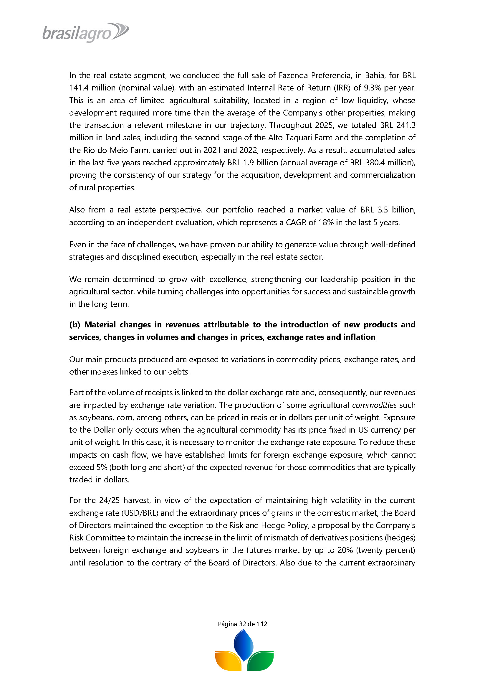 In the real estate segment, we concluded the full sale of Fazenda Preferencia, in Bahia, for BRL 141 . 4 million (nominal value), with an estimated Internal Rate of Return (IRR) of 9 . 3 % per year . This is an area of limited agricultural suitability, located in a region of low liquidity, whose development required more time than the average of the Company's other properties, making the transaction a relevant milestone in our trajectory . Throughout 2025 , we totaled BRL 241 . 3 million in land sales, including the second stage of the Alto Taquari Farm and the completion of the Rio do Meio Farm, carried out in 2021 and 2022 , respectively . As a result, accumulated sales in the last five years reached approximately BRL 1 . 9 billion (annual average of BRL 380 . 4 million), proving the consistency of our strategy for the acquisition, development and commercialization of rural properties . Also from a real estate perspective, our portfolio reached a market value of BRL 3 . 5 billion, according to an independent evaluation, which represents a CAGR of 18 % in the last 5 years . Even in the face of challenges, we have proven our ability to generate value through well - defined strategies and disciplined execution, especially in the real estate sector . We remain determined to grow with excellence, strengthening our leadership position in the agricultural sector, while turning challenges into opportunities for success and sustainable growth in the long term . (b) Material changes in revenues attributable to the introduction of new products and services, changes in volumes and changes in prices, exchange rates and inflation Our main products produced are exposed to variations in commodity prices, exchange rates, and other indexes linked to our debts . Part of the volume of receipts is linked to the dollar exchange rate and, consequently, our revenues are impacted by exchange rate variation . The production of some agricultural commodities such as soybeans, corn, among others, can be priced in reais or in dollars per unit of weight . Exposure to the Dollar only occurs when the agricultural commodity has its price fixed in US currency per unit of weight . In this case, it is necessary to monitor the exchange rate exposure . To reduce these impacts on cash flow, we have established limits for foreign exchange exposure, which cannot exceed 5 % (both long and short) of the expected revenue for those commodities that are typically traded in dollars . For the 24 / 25 harvest, in view of the expectation of maintaining high volatility in the current exchange rate (USD/BRL) and the extraordinary prices of grains in the domestic market, the Board of Directors maintained the exception to the Risk and Hedge Policy, a proposal by the Company's Risk Committee to maintain the increase in the limit of mismatch of derivatives positions (hedges) between foreign exchange and soybeans in the futures market by up to 20 % (twenty percent) until resolution to the contrary of the Board of Directors . Also due to the current extraordinary Página 32 de 112