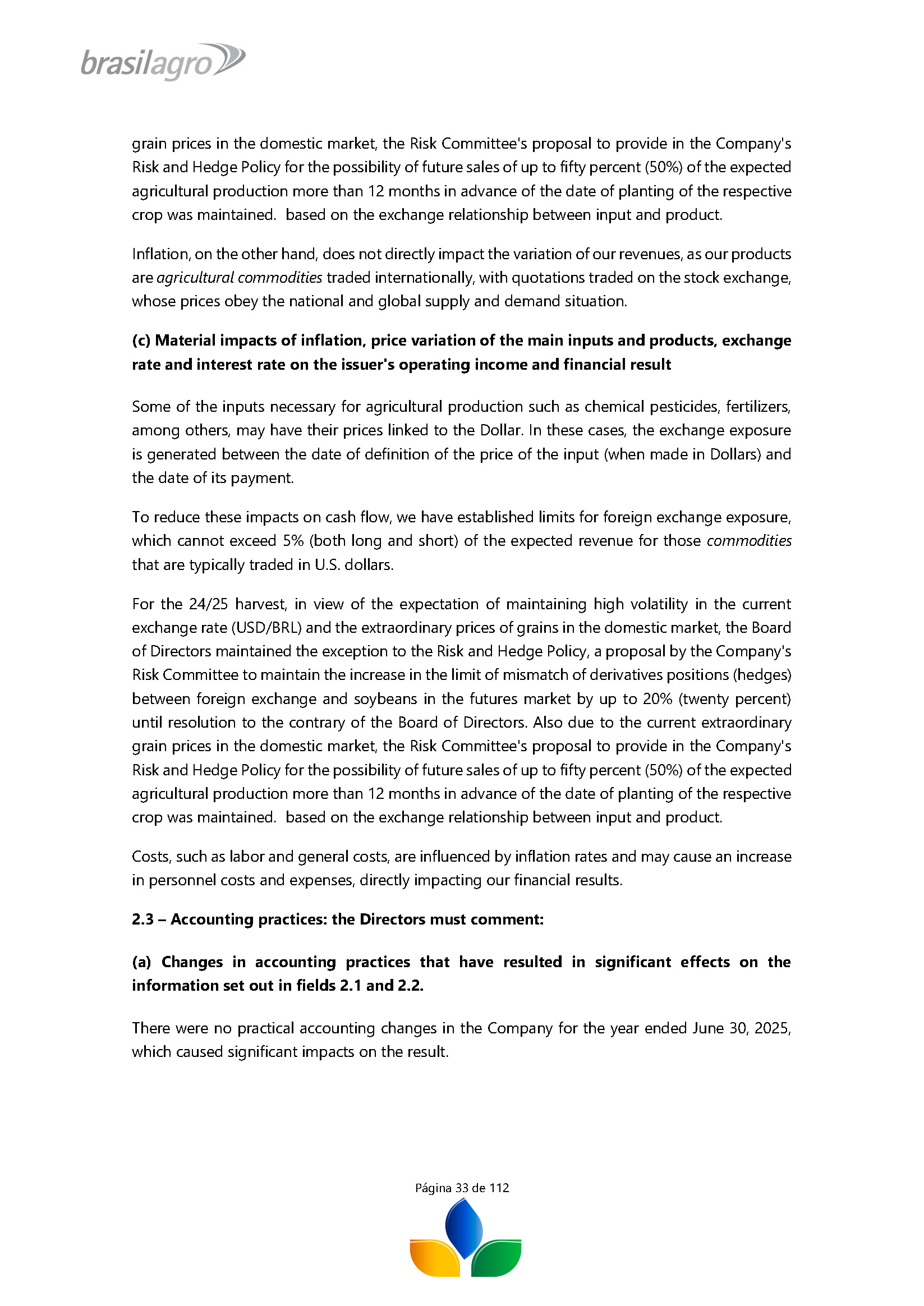 grain prices in the domestic market, the Risk Committee's proposal to provide in the Company's Risk and Hedge Policy for the possibility of future sales of up to fifty percent ( 50 % ) of the expected agricultural production more than 12 months in advance of the date of planting of the respective crop was maintained . based on the exchange relationship between input and product . Inflation, on the other hand, does not directly impact the variation of our revenues, as our products are agricultural commodities traded internationally, with quotations traded on the stock exchange, whose prices obey the national and global supply and demand situation . (c) Material impacts of inflation, price variation of the main inputs and products, exchange rate and interest rate on the issuer's operating income and financial result Some of the inputs necessary for agricultural production such as chemical pesticides, fertilizers, among others, may have their prices linked to the Dollar . In these cases, the exchange exposure is generated between the date of definition of the price of the input (when made in Dollars) and the date of its payment . To reduce these impacts on cash flow, we have established limits for foreign exchange exposure, which cannot exceed 5 % (both long and short) of the expected revenue for those commodities that are typically traded in U . S . dollars . For the 24 / 25 harvest, in view of the expectation of maintaining high volatility in the current exchange rate (USD/BRL) and the extraordinary prices of grains in the domestic market, the Board of Directors maintained the exception to the Risk and Hedge Policy, a proposal by the Company's Risk Committee to maintain the increase in the limit of mismatch of derivatives positions (hedges) between foreign exchange and soybeans in the futures market by up to 20 % (twenty percent) until resolution to the contrary of the Board of Directors . Also due to the current extraordinary grain prices in the domestic market, the Risk Committee's proposal to provide in the Company's Risk and Hedge Policy for the possibility of future sales of up to fifty percent ( 50 % ) of the expected agricultural production more than 12 months in advance of the date of planting of the respective crop was maintained . based on the exchange relationship between input and product . Costs, such as labor and general costs, are influenced by inflation rates and may cause an increase in personnel costs and expenses, directly impacting our financial results . 2.3 – Accounting practices: the Directors must comment: (a) Changes in accounting practices that have resulted in significant effects on the information set out in fields 2.1 and 2.2. There were no practical accounting changes in the Company for the year ended June 30 , 2025 , which caused significant impacts on the result . Página 33 de 112
