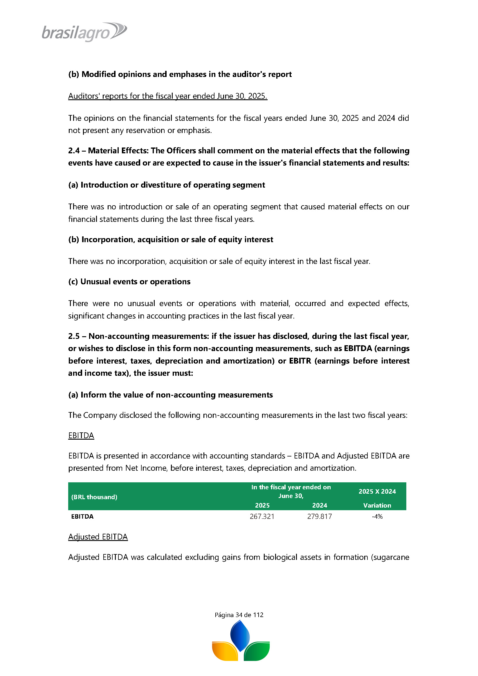 (b) Modified opinions and emphases in the auditor's report Auditors' reports for the fiscal year ended June 30, 2025. The opinions on the financial statements for the fiscal years ended June 30, 2025 and 2024 did not present any reservation or emphasis. 2 . 4 – Material Effects : The Officers shall comment on the material effects that the following events have caused or are expected to cause in the issuer's financial statements and results : (a) Introduction or divestiture of operating segment There was no introduction or sale of an operating segment that caused material effects on our financial statements during the last three fiscal years. (b) Incorporation, acquisition or sale of equity interest There was no incorporation, acquisition or sale of equity interest in the last fiscal year. (c) Unusual events or operations There were no unusual events or operations with material, occurred and expected effects, significant changes in accounting practices in the last fiscal year. 2 . 5 – Non - accounting measurements : if the issuer has disclosed, during the last fiscal year, or wishes to disclose in this form non - accounting measurements, such as EBITDA (earnings before interest, taxes, depreciation and amortization) or EBITR (earnings before interest and income tax), the issuer must : (a) Inform the value of non - accounting measurements The Company disclosed the following non - accounting measurements in the last two fiscal years: EBITDA EBITDA is presented in accordance with accounting standards – EBITDA and Adjusted EBITDA are presented from Net Income, before interest, taxes, depreciation and amortization. Página 34 de 112 2025 X 2024 In the fiscal year ended on June 30, (BRL thousand) Variation 2024 2025 - 4% 279.817 267.321 EBITDA Adjusted EBITDA Adjusted EBITDA was calculated excluding gains from biological assets in formation (sugarcane