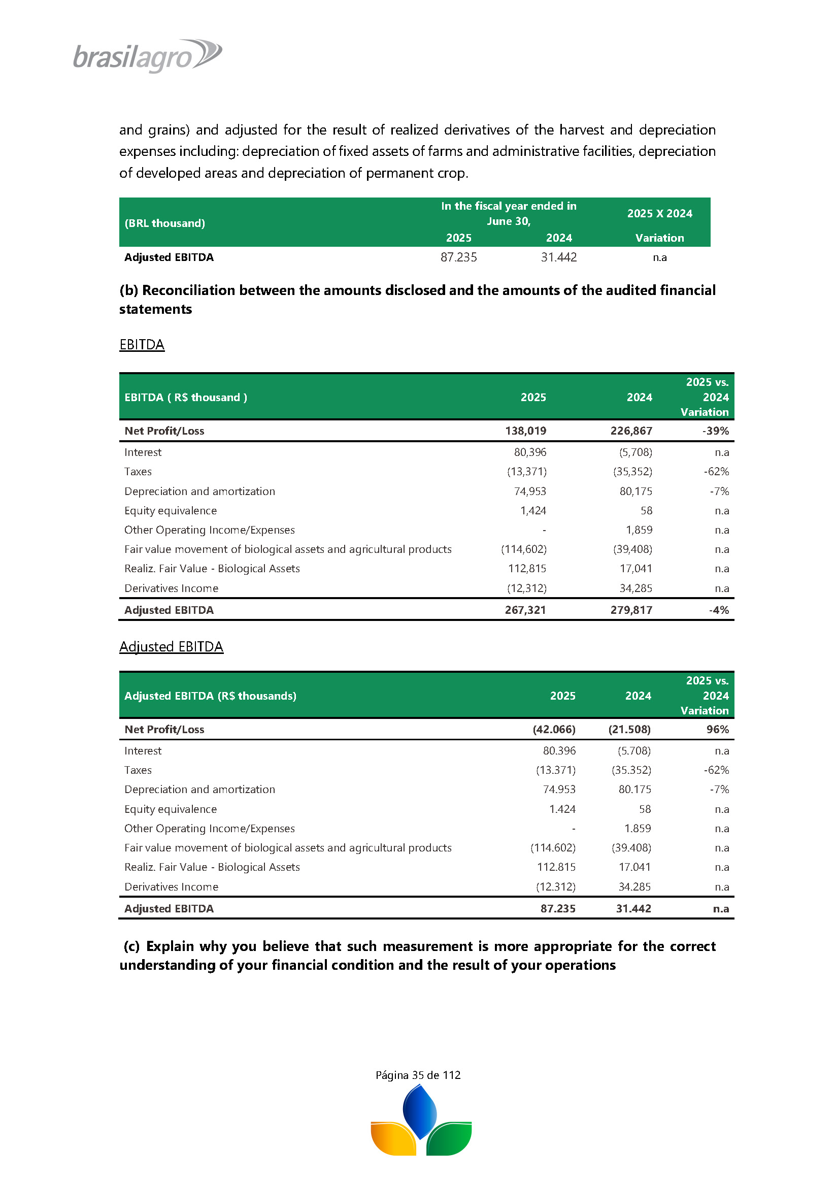 and grains) and adjusted for the result of realized derivatives of the harvest and depreciation expenses including : depreciation of fixed assets of farms and administrative facilities, depreciation of developed areas and depreciation of permanent crop . Página 35 de 112 2025 X 2024 In the fiscal year ended in June 30, (BRL thousand) Variation 2024 2025 n.a 31.442 87.235 Adjusted EBITDA (b) Reconciliation between the amounts disclosed and the amounts of the audited financial statements EBITDA 2025 vs. 2024 Variation 2024 2025 EBITDA ( R$ thousand ) - 39% 226,867 138,019 Net Profit/Loss n.a (5,708) 80,396 Interest - 62% (35,352) (13,371) Taxes - 7% 80,175 74,953 Depreciation and amortization n.a 58 1,424 Equity equivalence n.a 1,859 - Other Operating Income/Expenses n.a (39,408) (114,602) Fair value movement of biological assets and agricultural products n.a 17,041 112,815 Realiz. Fair Value - Biological Assets n.a 34,285 (12,312) Derivatives Income - 4% 279,817 267,321 Adjusted EBITDA Adjusted EBITDA 2025 vs. 2024 Variation 2024 2025 Adjusted EBITDA (R$ thousands) 96% (21.508) (42.066) Net Profit/Loss n.a (5.708) 80.396 Interest - 62% (35.352) (13.371) Taxes - 7% 80.175 74.953 Depreciation and amortization n.a 58 1.424 Equity equivalence n.a 1.859 - Other Operating Income/Expenses n.a (39.408) (114.602) Fair value movement of biological assets and agricultural products n.a 17.041 112.815 Realiz. Fair Value - Biological Assets n.a 34.285 (12.312) Derivatives Income n.a 31.442 87.235 Adjusted EBITDA (c) Explain why you believe that such measurement is more appropriate for the correct understanding of your financial condition and the result of your operations
