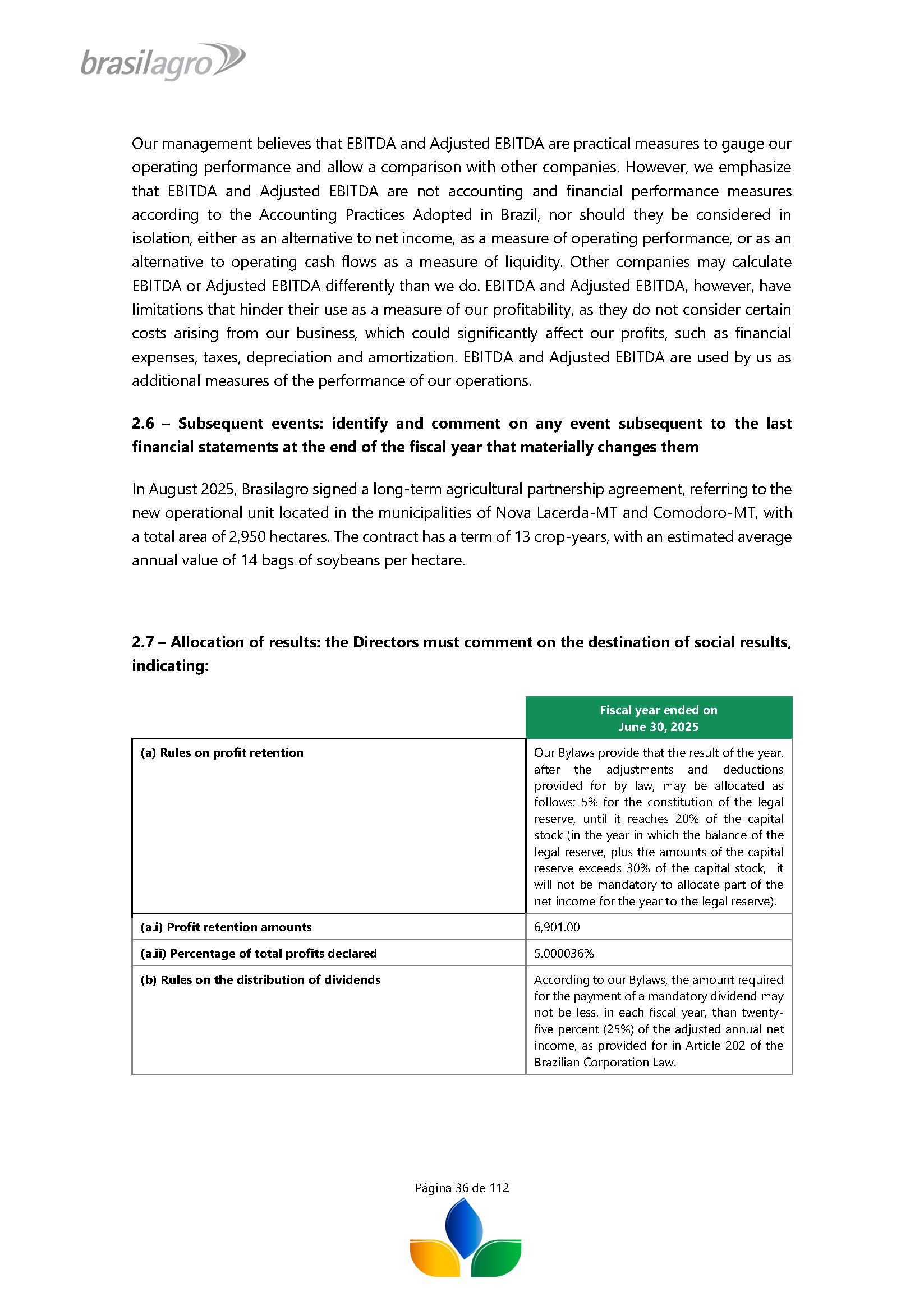 Our management believes that EBITDA and Adjusted EBITDA are practical measures to gauge our operating performance and allow a comparison with other companies . However, we emphasize that EBITDA and Adjusted EBITDA are not accounting and financial performance measures according to the Accounting Practices Adopted in Brazil, nor should they be considered in isolation, either as an alternative to net income, as a measure of operating performance, or as an alternative to operating cash flows as a measure of liquidity . Other companies may calculate EBITDA or Adjusted EBITDA differently than we do . EBITDA and Adjusted EBITDA, however, have limitations that hinder their use as a measure of our profitability, as they do not consider certain costs arising from our business, which could significantly affect our profits, such as financial expenses, taxes, depreciation and amortization . EBITDA and Adjusted EBITDA are used by us as additional measures of the performance of our operations . 2.6 – Subsequent events: identify and comment on any event subsequent to the last financial statements at the end of the fiscal year that materially changes them In August 2025 , Brasilagro signed a long - term agricultural partnership agreement, referring to the new operational unit located in the municipalities of Nova Lacerda - MT and Comodoro - MT, with a total area of 2 , 950 hectares . The contract has a term of 13 crop - years, with an estimated average annual value of 14 bags of soybeans per hectare . Página 36 de 112 2.7 – Allocation of results: the Directors must comment on the destination of social results, indicating: Fiscal year ended on June 30, 2025 Our Bylaws provide that the result of the year, after the adjustments and deductions provided for by law, may be allocated as follows : 5 % for the constitution of the legal reserve, until it reaches 20 % of the capital stock (in the year in which the balance of the legal reserve, plus the amounts of the capital reserve exceeds 30 % of the capital stock, it will not be mandatory to allocate part of the net income for the year to the legal reserve) . (a) Rules on profit retention 6,901.00 (a.i) Profit retention amounts 5.000036% (a.ii) Percentage of total profits declared According to our Bylaws, the amount required for the payment of a mandatory dividend may not be less, in each fiscal year, than twenty - five percent ( 25 % ) of the adjusted annual net income, as provided for in Article 202 of the Brazilian Corporation Law . (b) Rules on the distribution of dividends