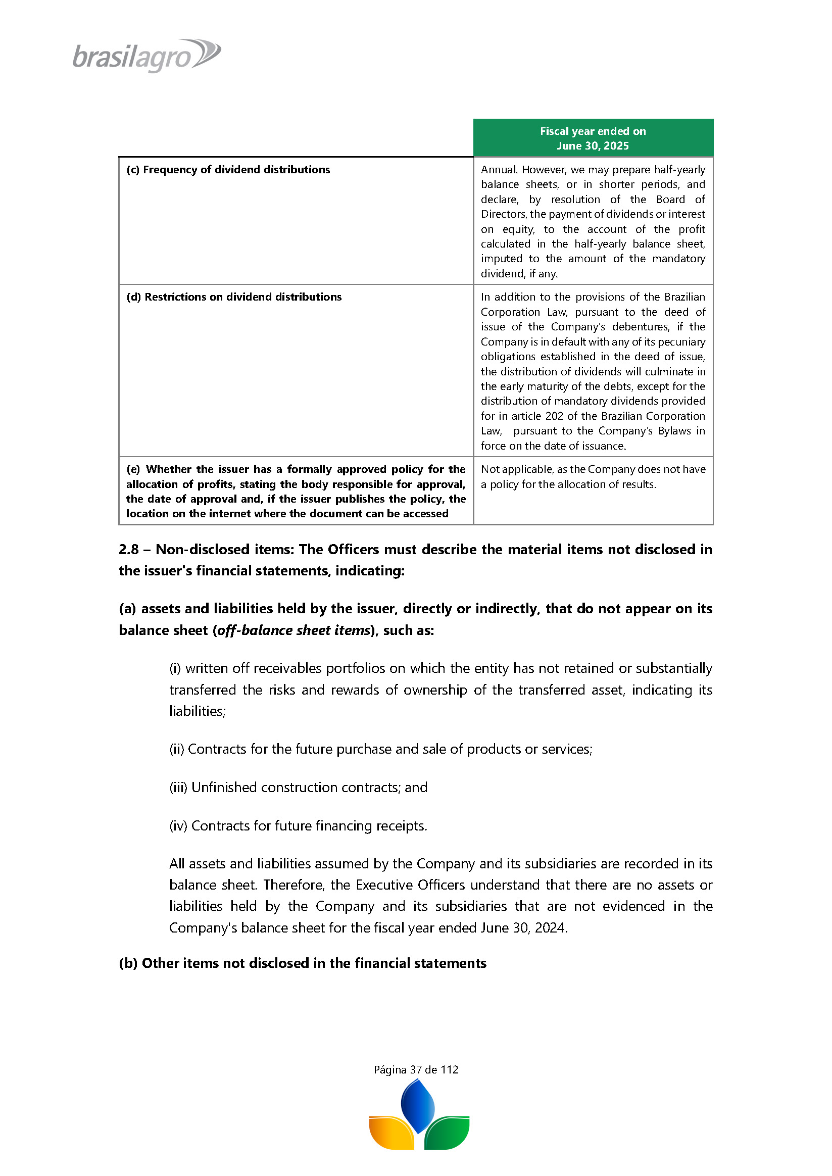 Fiscal year ended on June 30, 2025 Annual . However, we may prepare half - yearly balance sheets, or in shorter periods, and declare, by resolution of the Board of Directors, the payment of dividends or interest on equity, to the account of the profit calculated in the half - yearly balance sheet, imputed to the amount of the mandatory dividend, if any . (c) Frequency of dividend distributions In addition to the provisions of the Brazilian Corporation Law, pursuant to the deed of issue of the Company's debentures, if the Company is in default with any of its pecuniary obligations established in the deed of issue, the distribution of dividends will culminate in the early maturity of the debts, except for the distribution of mandatory dividends provided for in article 202 of the Brazilian Corporation Law, pursuant to the Company's Bylaws in force on the date of issuance . (d) Restrictions on dividend distributions Not applicable, as the Company does not have a policy for the allocation of results. (e) Whether the issuer has a formally approved policy for the allocation of profits, stating the body responsible for approval, the date of approval and, if the issuer publishes the policy, the location on the internet where the document can be accessed Página 37 de 112 2.8 – Non - disclosed items: The Officers must describe the material items not disclosed in the issuer's financial statements, indicating: (a) assets and liabilities held by the issuer, directly or indirectly, that do not appear on its balance sheet ( off - balance sheet items ), such as: (i) written off receivables portfolios on which the entity has not retained or substantially transferred the risks and rewards of ownership of the transferred asset, indicating its liabilities ; (ii) Contracts for the future purchase and sale of products or services; (iii) Unfinished construction contracts; and (iv) Contracts for future financing receipts. All assets and liabilities assumed by the Company and its subsidiaries are recorded in its balance sheet . Therefore, the Executive Officers understand that there are no assets or liabilities held by the Company and its subsidiaries that are not evidenced in the Company's balance sheet for the fiscal year ended June 30 , 2024 . (b) Other items not disclosed in the financial statements