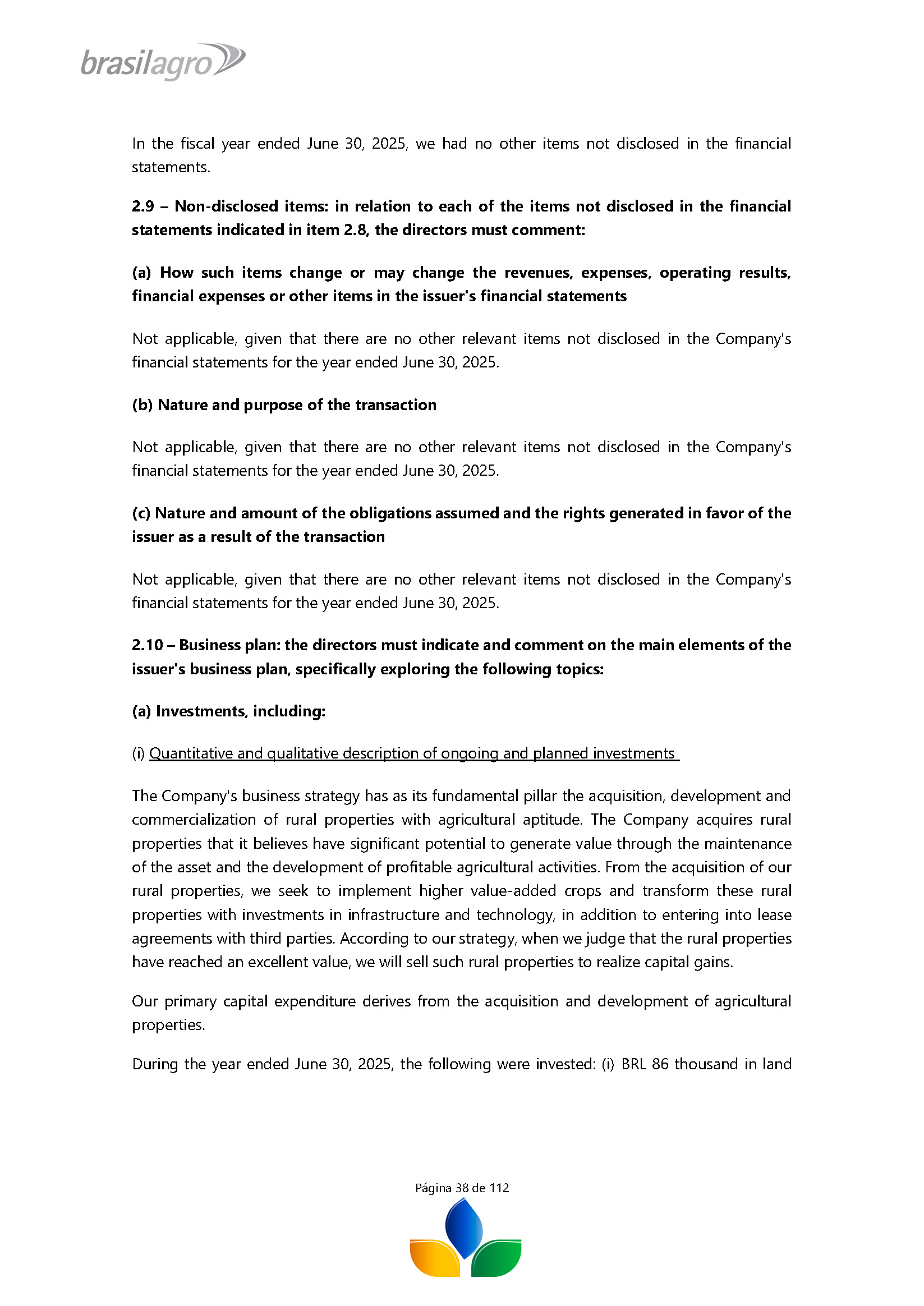 In the fiscal year ended June 30 , 2025 , we had no other items not disclosed in the financial statements . 2.9 – Non - disclosed items: in relation to each of the items not disclosed in the financial statements indicated in item 2.8, the directors must comment: (a) How such items change or may change the revenues, expenses, operating results, financial expenses or other items in the issuer's financial statements Not applicable, given that there are no other relevant items not disclosed in the Company's financial statements for the year ended June 30 , 2025 . (b) Nature and purpose of the transaction Not applicable, given that there are no other relevant items not disclosed in the Company's financial statements for the year ended June 30 , 2025 . (c) Nature and amount of the obligations assumed and the rights generated in favor of the issuer as a result of the transaction Not applicable, given that there are no other relevant items not disclosed in the Company's financial statements for the year ended June 30 , 2025 . 2.10 – Business plan: the directors must indicate and comment on the main elements of the issuer's business plan, specifically exploring the following topics: (a) Investments, including: (i) Quantitative and qualitative description of ongoing and planned investments The Company's business strategy has as its fundamental pillar the acquisition, development and commercialization of rural properties with agricultural aptitude . The Company acquires rural properties that it believes have significant potential to generate value through the maintenance of the asset and the development of profitable agricultural activities . From the acquisition of our rural properties, we seek to implement higher value - added crops and transform these rural properties with investments in infrastructure and technology, in addition to entering into lease agreements with third parties . According to our strategy, when we judge that the rural properties have reached an excellent value, we will sell such rural properties to realize capital gains . Our primary capital expenditure derives from the acquisition and development of agricultural properties . During the year ended June 30 , 2025 , the following were invested : (i) BRL 86 thousand in land Página 38 de 112