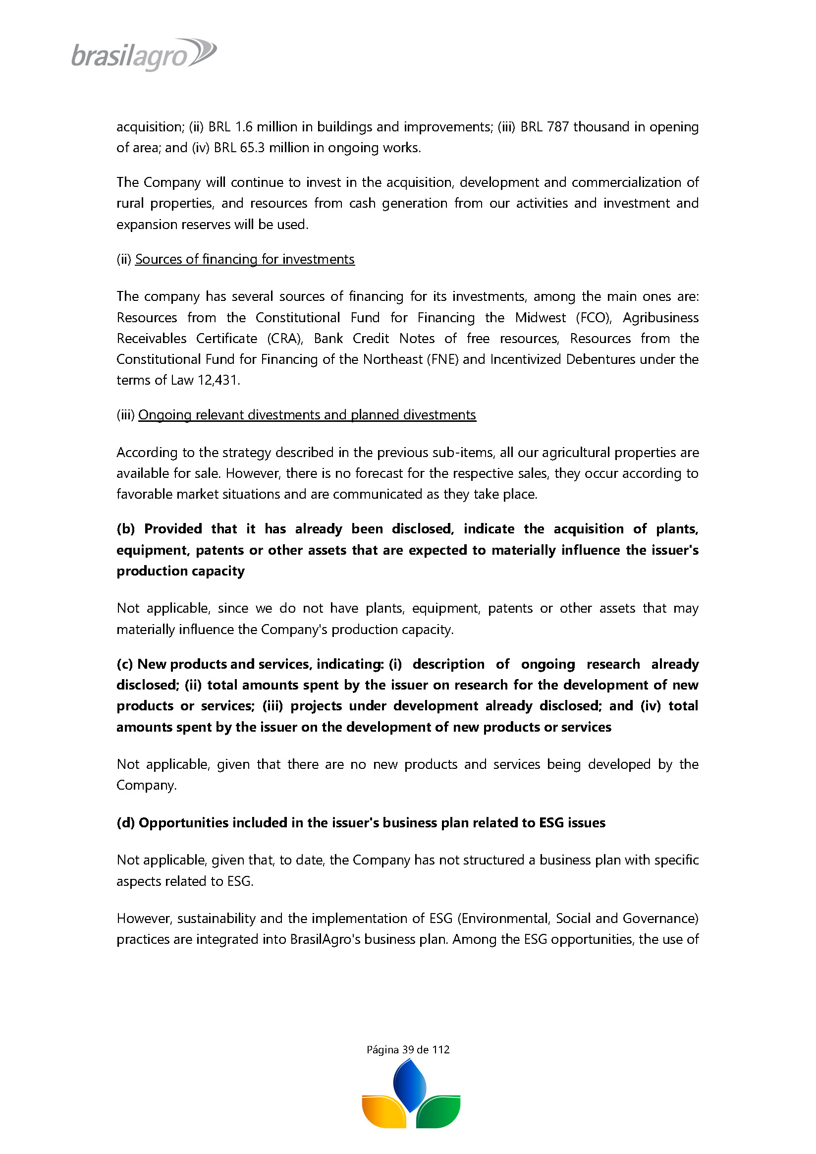 acquisition ; (ii) BRL 1 . 6 million in buildings and improvements ; (iii) BRL 787 thousand in opening of area ; and (iv) BRL 65 . 3 million in ongoing works . The Company will continue to invest in the acquisition, development and commercialization of rural properties, and resources from cash generation from our activities and investment and expansion reserves will be used . (ii) Sources of financing for investments The company has several sources of financing for its investments, among the main ones are : Resources from the Constitutional Fund for Financing the Midwest (FCO), Agribusiness Receivables Certificate (CRA), Bank Credit Notes of free resources, Resources from the Constitutional Fund for Financing of the Northeast (FNE) and Incentivized Debentures under the terms of Law 12 , 431 . (iii) Ongoing relevant divestments and planned divestments According to the strategy described in the previous sub - items, all our agricultural properties are available for sale . However, there is no forecast for the respective sales, they occur according to favorable market situations and are communicated as they take place . (b) Provided that it has already been disclosed, indicate the acquisition of plants, equipment, patents or other assets that are expected to materially influence the issuer's production capacity Not applicable, since we do not have plants, equipment, patents or other assets that may materially influence the Company's production capacity . (c) New products and services, indicating : (i) description of ongoing research already disclosed ; (ii) total amounts spent by the issuer on research for the development of new products or services ; (iii) projects under development already disclosed ; and (iv) total amounts spent by the issuer on the development of new products or services Not applicable, given that there are no new products and services being developed by the Company . (d) Opportunities included in the issuer's business plan related to ESG issues Not applicable, given that, to date, the Company has not structured a business plan with specific aspects related to ESG . However, sustainability and the implementation of ESG (Environmental, Social and Governance) practices are integrated into BrasilAgro's business plan . Among the ESG opportunities, the use of Página 39 de 112