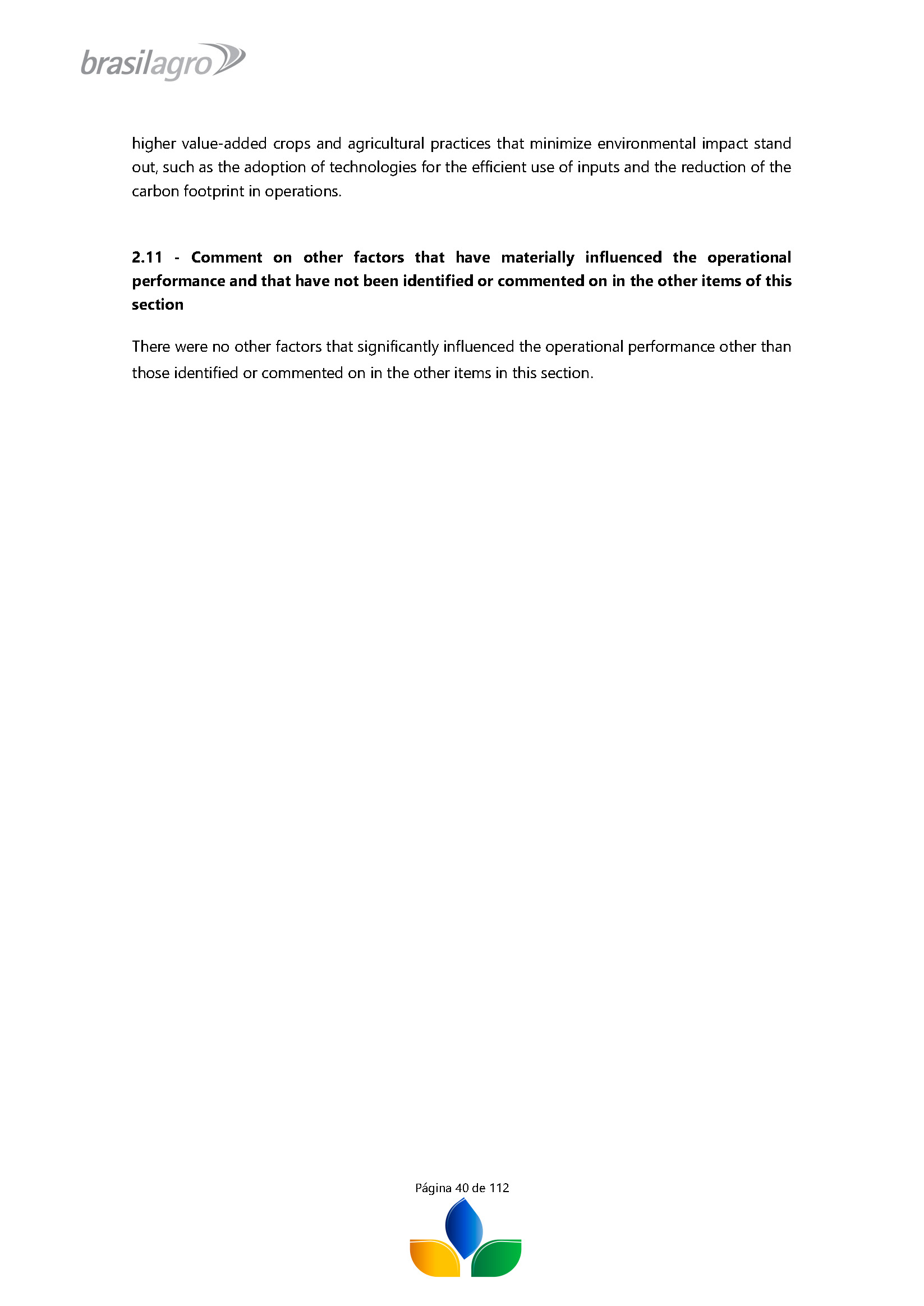 higher value - added crops and agricultural practices that minimize environmental impact stand out, such as the adoption of technologies for the efficient use of inputs and the reduction of the carbon footprint in operations . 2 . 11 - Comment on other factors that have materially influenced the operational performance and that have not been identified or commented on in the other items of this section There were no other factors that significantly influenced the operational performance other than those identified or commented on in the other items in this section . Página 40 de 112