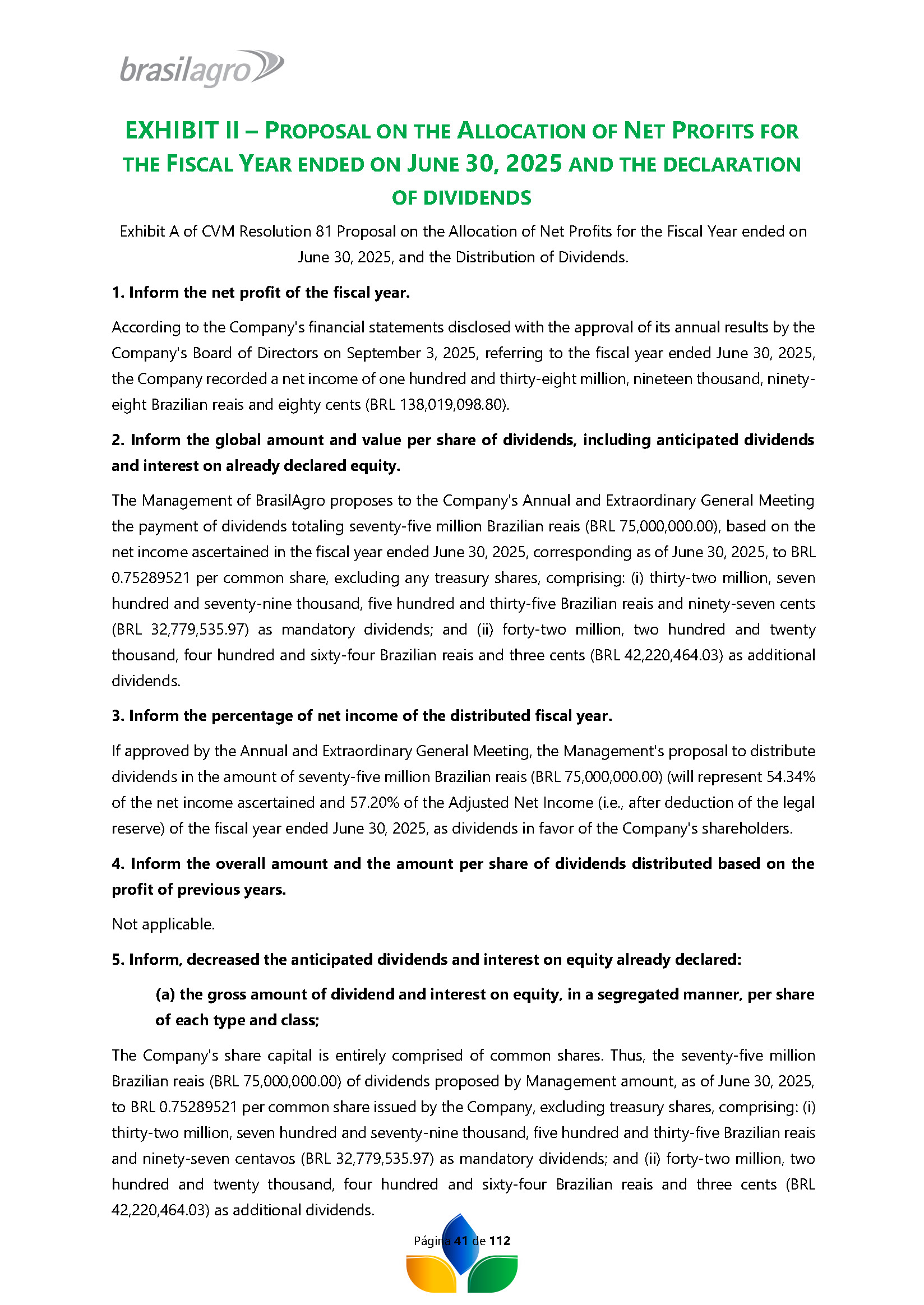 EXHIBIT II – P ROPOSAL ON THE A LLOCATION OF N ET P ROFITS FOR THE F ISCAL Y EAR ENDED ON J UNE 30, 2025 AND THE DECLARATION OF DIVIDENDS Exhibit A of CVM Resolution 81 Proposal on the Allocation of Net Profits for the Fiscal Year ended on June 30, 2025, and the Distribution of Dividends. 1. Inform the net profit of the fiscal year . According to the Company's financial statements disclosed with the approval of its annual results by the Company's Board of Directors on September 3 , 2025 , referring to the fiscal year ended June 30 , 2025 , the Company recorded a net income of one hundred and thirty - eight million, nineteen thousand, ninety - eight Brazilian reais and eighty cents (BRL 138 , 019 , 098 . 80 ) . 2. Inform the global amount and value per share of dividends, including anticipated dividends and interest on already declared equity . The Management of BrasilAgro proposes to the Company's Annual and Extraordinary General Meeting the payment of dividends totaling seventy - five million Brazilian reais (BRL 75 , 000 , 000 . 00 ), based on the net income ascertained in the fiscal year ended June 30 , 2025 , corresponding as of June 30 , 2025 , to BRL 0 . 75289521 per common share, excluding any treasury shares, comprising : (i) thirty - two million, seven hundred and seventy - nine thousand, five hundred and thirty - five Brazilian reais and ninety - seven cents (BRL 32 , 779 , 535 . 97 ) as mandatory dividends ; and (ii) forty - two million, two hundred and twenty thousand, four hundred and sixty - four Brazilian reais and three cents (BRL 42 , 220 , 464 . 03 ) as additional dividends . 3. Inform the percentage of net income of the distributed fiscal year . If approved by the Annual and Extraordinary General Meeting, the Management's proposal to distribute dividends in the amount of seventy - five million Brazilian reais (BRL 75 , 000 , 000 . 00 ) (will represent 54 . 34 % of the net income ascertained and 57 . 20 % of the Adjusted Net Income (i . e . , after deduction of the legal reserve) of the fiscal year ended June 30 , 2025 , as dividends in favor of the Company's shareholders . 4. Inform the overall amount and the amount per share of dividends distributed based on the profit of previous years . Not applicable . 5. Inform, decreased the anticipated dividends and interest on equity already declared : (a) the gross amount of dividend and interest on equity, in a segregated manner, per share of each type and class ; The Company's share capital is entirely comprised of common shares . Thus, the seventy - five million Brazilian reais (BRL 75 , 000 , 000 . 00 ) of dividends proposed by Management amount, as of June 30 , 2025 , to BRL 0 . 75289521 per common share issued by the Company, excluding treasury shares, comprising : (i) thirty - two million, seven hundred and seventy - nine thousand, five hundred and thirty - five Brazilian reais and ninety - seven centavos (BRL 32 , 779 , 535 . 97 ) as mandatory dividends ; and (ii) forty - two million, two hundred and twenty thousand, four hundred and sixty - four Brazilian reais and three cents (BRL 42 , 220 , 464 . 03 ) as additional dividends . Página 41 de 112