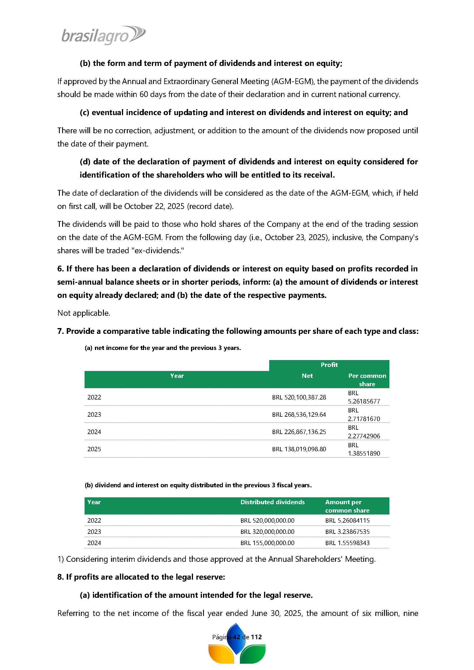 (b) the form and term of payment of dividends and interest on equity ; If approved by the Annual and Extraordinary General Meeting (AGM - EGM), the payment of the dividends should be made within 60 days from the date of their declaration and in current national currency . (c) eventual incidence of updating and interest on dividends and interest on equity ; and There will be no correction, adjustment, or addition to the amount of the dividends now proposed until the date of their payment . (d) date of the declaration of payment of dividends and interest on equity considered for identification of the shareholders who will be entitled to its receival . The date of declaration of the dividends will be considered as the date of the AGM - EGM, which, if held on first call, will be October 22 , 2025 (record date) . The dividends will be paid to those who hold shares of the Company at the end of the trading session on the date of the AGM - EGM . From the following day (i . e . , October 23 , 2025 ), inclusive, the Company's shares will be traded "ex - dividends . " 6. If there has been a declaration of dividends or interest on equity based on profits recorded in semi - annual balance sheets or in shorter periods, inform : (a) the amount of dividends or interest on equity already declared ; and (b) the date of the respective payments . Not applicable . 7. Provide a comparative table indicating the following amounts per share of each type and class : (a) net income for the year and the previous 3 years. Página 42 de 112 Profit Per common share Net Year BRL 5.26185677 BRL 520,100,387.28 2022 BRL 2.71781670 BRL 268,536,129.64 2023 BRL 2.27742906 BRL 226,867,136.25 2024 BRL 1.38551890 BRL 138,019,098.80 2025 (b) dividend and interest on equity distributed in the previous 3 fiscal years. Amount per common share Distributed dividends Year BRL 5.26084115 BRL 520,000,000.00 2022 BRL 3.23867535 BRL 320,000,000.00 2023 BRL 1.55598343 BRL 155,000,000.00 2024 1) Considering interim dividends and those approved at the Annual Shareholders' Meeting. 8. If profits are allocated to the legal reserve: (a) identification of the amount intended for the legal reserve. Referring to the net income of the fiscal year ended June 30, 2025, the amount of six million, nine