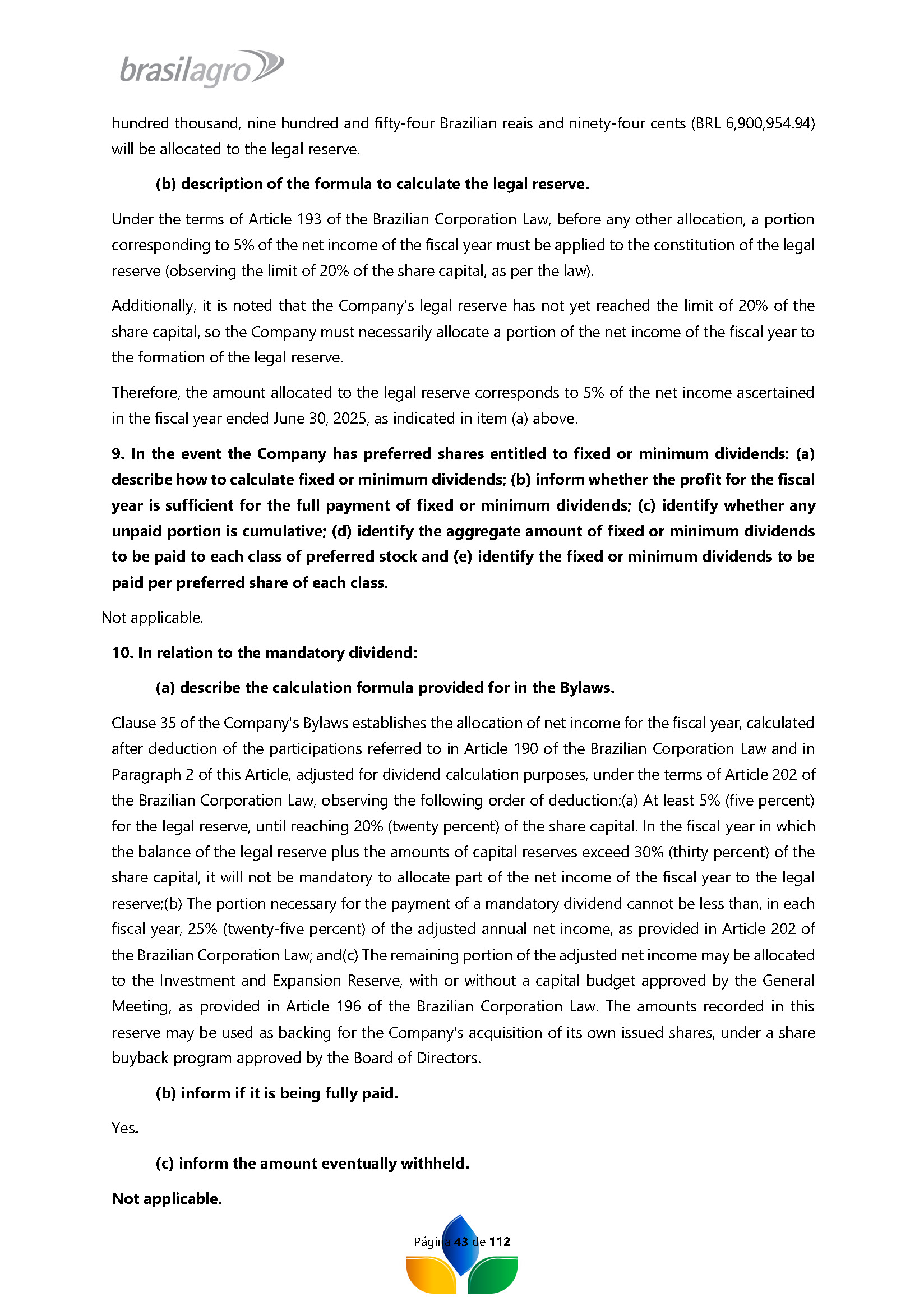 hundred thousand, nine hundred and fifty - four Brazilian reais and ninety - four cents (BRL 6 , 900 , 954 . 94 ) will be allocated to the legal reserve . (b) description of the formula to calculate the legal reserve . Under the terms of Article 193 of the Brazilian Corporation Law, before any other allocation, a portion corresponding to 5 % of the net income of the fiscal year must be applied to the constitution of the legal reserve (observing the limit of 20 % of the share capital, as per the law) . Additionally, it is noted that the Company's legal reserve has not yet reached the limit of 20 % of the share capital, so the Company must necessarily allocate a portion of the net income of the fiscal year to the formation of the legal reserve . Therefore, the amount allocated to the legal reserve corresponds to 5 % of the net income ascertained in the fiscal year ended June 30 , 2025 , as indicated in item (a) above . 9. In the event the Company has preferred shares entitled to fixed or minimum dividends : (a) describe how to calculate fixed or minimum dividends ; (b) inform whether the profit for the fiscal year is sufficient for the full payment of fixed or minimum dividends ; (c) identify whether any unpaid portion is cumulative ; (d) identify the aggregate amount of fixed or minimum dividends to be paid to each class of preferred stock and (e) identify the fixed or minimum dividends to be paid per preferred share of each class . Not applicable. 10. In relation to the mandatory dividend : (a) describe the calculation formula provided for in the Bylaws . Clause 35 of the Company's Bylaws establishes the allocation of net income for the fiscal year, calculated after deduction of the participations referred to in Article 190 of the Brazilian Corporation Law and in Paragraph 2 of this Article, adjusted for dividend calculation purposes, under the terms of Article 202 of the Brazilian Corporation Law, observing the following order of deduction : (a) At least 5 % (five percent) for the legal reserve, until reaching 20 % (twenty percent) of the share capital . In the fiscal year in which the balance of the legal reserve plus the amounts of capital reserves exceed 30 % (thirty percent) of the share capital, it will not be mandatory to allocate part of the net income of the fiscal year to the legal reserve ; (b) The portion necessary for the payment of a mandatory dividend cannot be less than, in each fiscal year, 25 % (twenty - five percent) of the adjusted annual net income, as provided in Article 202 of the Brazilian Corporation Law ; and(c) The remaining portion of the adjusted net income may be allocated to the Investment and Expansion Reserve, with or without a capital budget approved by the General Meeting, as provided in Article 196 of the Brazilian Corporation Law . The amounts recorded in this reserve may be used as backing for the Company's acquisition of its own issued shares, under a share buyback program approved by the Board of Directors . (b) inform if it is being fully paid . Yes . (c) inform the amount eventually withheld. Not applicable. Página 43 de 112