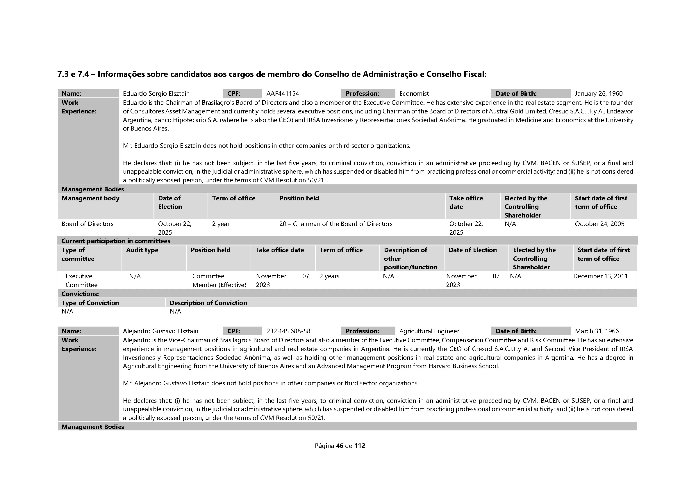 Página 46 de 112 7.3 e 7.4 – Informações sobre candidatos aos cargos de membro do Conselho de Administração e Conselho Fiscal: Name : Eduardo Sergio Elsztain CPF : AAF 441154 Profession : Economist Date of Birth : January 26 , 1960 Work Eduardo is the Chairman of Brasilagro's Board of Directors and also a member of the Executive Committee. He has extensive experience in the real estate segment. He is the founder Experience: of Consultores Asset Management and currently holds several executive positions, including Chairman of the Board of Directors of Austral Gold Limited, Cresud S.A.C.I.F.y A., Endeavor Argentina, Banco Hipotecario S.A. (where he is also the CEO) and IRSA Invesriones y Representaciones Sociedad Anónima. He graduated in Medicine and Economics at the University of Buenos Aires. Mr. Eduardo Sergio Elsztain does not hold positions in other companies or third sector organizations. He declares that : (i) he has not been subject, in the last five years, to criminal conviction, conviction in an administrative proceeding by CVM, BACEN or SUSEP, or a final and unappealable conviction, in the judicial or administrative sphere, which has suspended or disabled him from practicing professional or commercial activity ; and (ii) he is not considered a politically exposed person, under the terms of CVM Resolution 50 / 21 . Management Bodies Start date of first term of office Elected by the Controlling Shareholder Take office date Position held Term of office Date of Election Management body October 24, 2005 N/A October 22, 2025 20 – Chairman of the Board of Directors 2 year October 22, 2025 Board of Directors Current participation in committees Start date of first term of office Elected by the Controlling Shareholder Date of Election Description of other position/function Term of office Take office date Position held Audit type Type of committee Executive N/A Committee November 07, 2 years N/A November 07, N/A December 13, 2011 Committee Member (Effective) 2023 2023 Convictions: Description of Conviction Type of Conviction N/A N/A March 31, 1966 Date of Birth: Agricultural Engineer Profession: 232.445.688 - 58 CPF: Alejandro Gustavo Elsztain Name: Alejandro is the Vice - Chairman of Brasilagro's Board of Directors and also a member of the Executive Committee, Compensation Committee and Risk Committee . He has an extensive experience in management positions in agricultural and real estate companies in Argentina . He is currently the CEO of Cresud S . A . C . I . F . y A . and Second Vice President of IRSA Invesriones y Representaciones Sociedad Anónima, as well as holding other management positions in real estate and agricultural companies in Argentina . He has a degree in Agricultural Engineering from the University of Buenos Aires and an Advanced Management Program from Harvard Business School . Mr . Alejandro Gustavo Elsztain does not hold positions in other companies or third sector organizations . He declares that : (i) he has not been subject, in the last five years, to criminal conviction, conviction in an administrative proceeding by CVM, BACEN or SUSEP, or a final and unappealable conviction, in the judicial or administrative sphere, which has suspended or disabled him from practicing professional or commercial activity ; and (ii) he is not considered a politically exposed person, under the terms of CVM Resolution 50 / 21 . Work Experience: Management Bodies