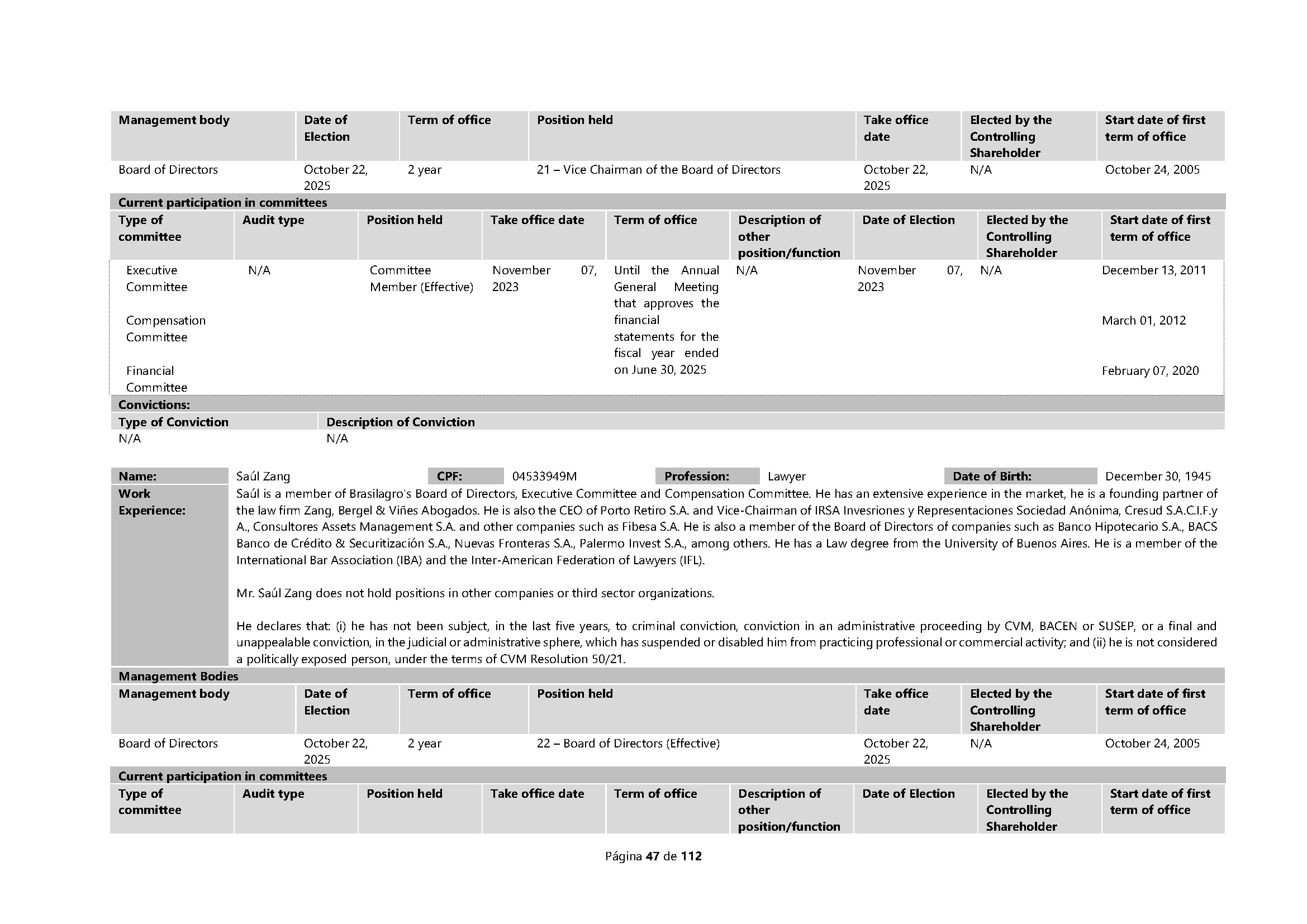 Start date of first term of office Elected by the Controlling Shareholder Take office date Position held Term of office Date of Election Management body October 24, 2005 N/A October 22, 21 – Vice Chairman of the Board of Directors 2 year October 22, Board of Directors 2025 2025 Current participation in committees Start date of first term of office Elected by the Controlling Shareholder Date of Election Description of other position/function Term of office Take office date Position held Audit type Type of committee Executive N/A Committee November 07, Until the Annual N/A November 07, N/A December 13, 2011 Committee Member (Effective) 2023 General Meeting 2023 that approves the Compensation financial March 01, 2012 Committee statements for the fiscal year ended Financial on June 30, 2025 February 07, 2020 Committee Convictions: Description of Conviction Type of Conviction N/A Name: Work Experience: N/A Saúl Zang CPF: 04533949M Profession: Lawyer Date of Birth: December 30, 1945 Saúl is a member of Brasilagro's Board of Directors, Executive Committee and Compensation Committee. He has an extensive experience in the market, he is a founding partner of the law firm Zang, Bergel & Viñes Abogados. He is also the CEO of Porto Retiro S.A. and Vice - Chairman of IRSA Invesriones y Representaciones Sociedad Anónima, Cresud S.A.C.I.F.y A., Consultores Assets Management S.A. and other companies such as Fibesa S.A. He is also a member of the Board of Directors of companies such as Banco Hipotecario S.A., BACS Banco de Crédito & Securitización S.A., Nuevas Fronteras S.A., Palermo Invest S.A., among others. He has a Law degree from the University of Buenos Aires. He is a member of the International Bar Association (IBA) and the Inter - American Federation of Lawyers (IFL). Mr . Saúl Zang does not hold positions in other companies or third sector organizations . He declares that : (i) he has not been subject, in the last five years, to criminal conviction, conviction in an administrative proceeding by CVM, BACEN or SUSEP, or a final and unappealable conviction, in the judicial or administrative sphere, which has suspended or disabled him from practicing professional or commercial activity ; and (ii) he is not considered a politically exposed person, under the terms of CVM Resolution 50 / 21 . Management Bodies Management body Take office date Elected by the Controlling Shareholder Start date of first term of office Board of Directors Date of Term of office Position held Election October 22, 2 year 22 – Board of Directors (Effective) 2025 October 22, N/A October 24, 2005 2025 Current participation in committees Type of Audit type Position held Take office date Term of office committee Description of Date of Election other position/function Elected by the Controlling Shareholder Start date of first term of office Página 47 de 112