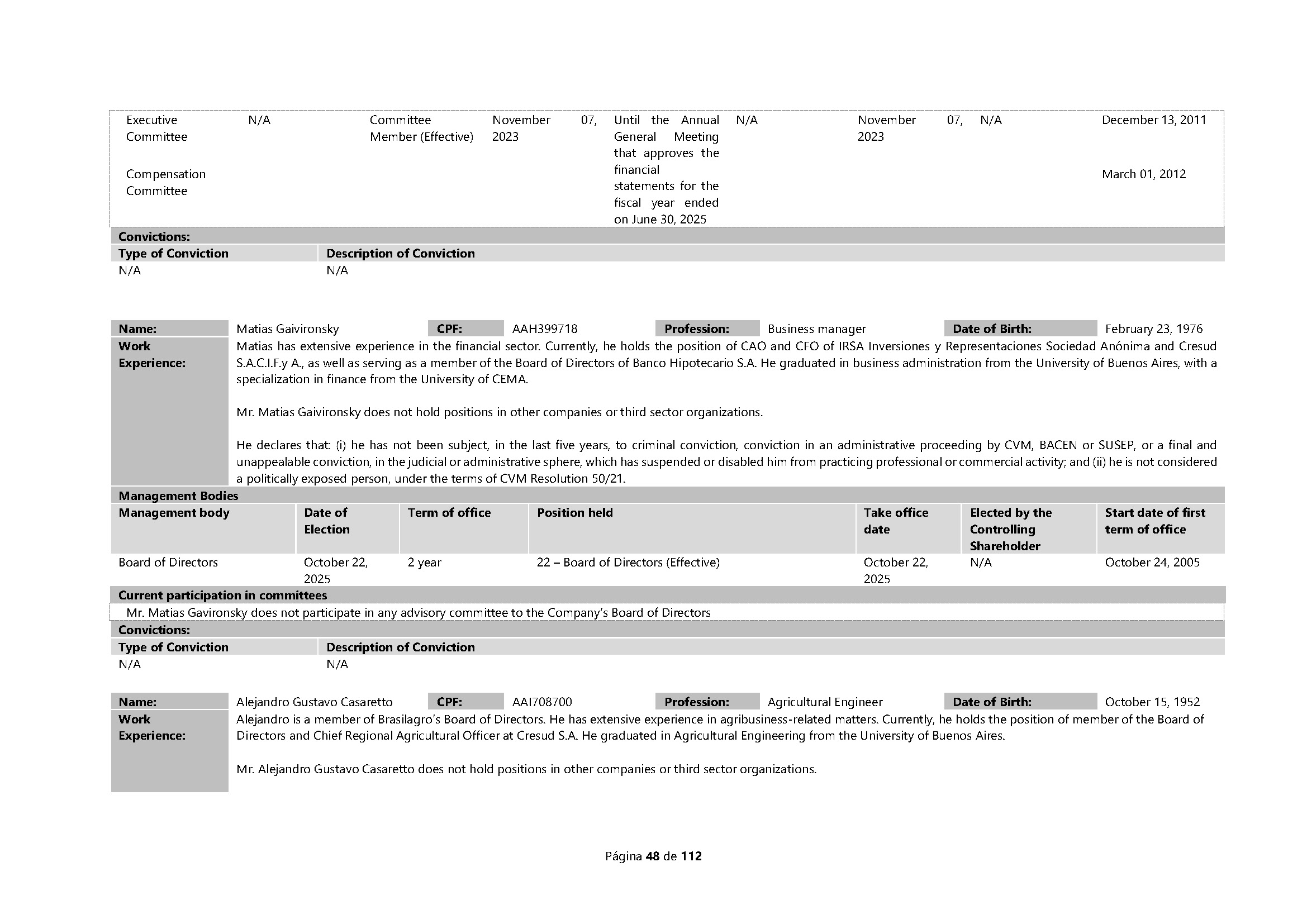 Página 48 de 112 December 13, 2011 N/A November 07, 2023 N/A Until the Annual General Meeting that approves the financial statements for the fiscal year ended on June 30, 2025 November 07, 2023 Committee Member (Effective) N/A Executive Committee March 01, 2012 Compensation Committee Convictions: Description of Conviction Type of Conviction N/A N/A Name: Matias Gaivironsky CPF: AAH399718 Profession: Business manager Date of Birth: February 23, 1976 Work Matias has extensive experience in the financial sector. Currently, he holds the position of CAO and CFO of IRSA Inversiones y Representaciones Sociedad Anónima and Cresud Experience: S.A.C.I.F.y A., as well as serving as a member of the Board of Directors of Banco Hipotecario S.A. He graduated in business administration from the University of Buenos Aires, with a specialization in finance from the University of CEMA. Mr . Matias Gaivironsky does not hold positions in other companies or third sector organizations . He declares that : (i) he has not been subject, in the last five years, to criminal conviction, conviction in an administrative proceeding by CVM, BACEN or SUSEP, or a final and unappealable conviction, in the judicial or administrative sphere, which has suspended or disabled him from practicing professional or commercial activity ; and (ii) he is not considered a politically exposed person, under the terms of CVM Resolution 50 / 21 . Management Bodies Start date of first term of office Elected by the Controlling Shareholder Take office date Position held Term of office Date of Election Management body October 24, 2005 N/A October 22, 2025 22 – Board of Directors (Effective) 2 year October 22, 2025 Board of Directors Current participation in committees Mr. Matias Gavironsky does not participate in any advisory committee to the Company’s Board of Directors Convictions: Description of Conviction Type of Conviction N/A N/A October 15, 1952 Date of Birth: Agricultural Engineer Profession: AAI708700 CPF: Alejandro Gustavo Casaretto Name: Alejandro is a member of Brasilagro’s Board of Directors. He has extensive experience in agribusiness - related matters. Currently, he holds the position of member of the Board of Directors and Chief Regional Agricultural Officer at Cresud S.A. He graduated in Agricultural Engineering from the University of Buenos Aires. Mr. Alejandro Gustavo Casaretto does not hold positions in other companies or third sector organizations. Work Experience: