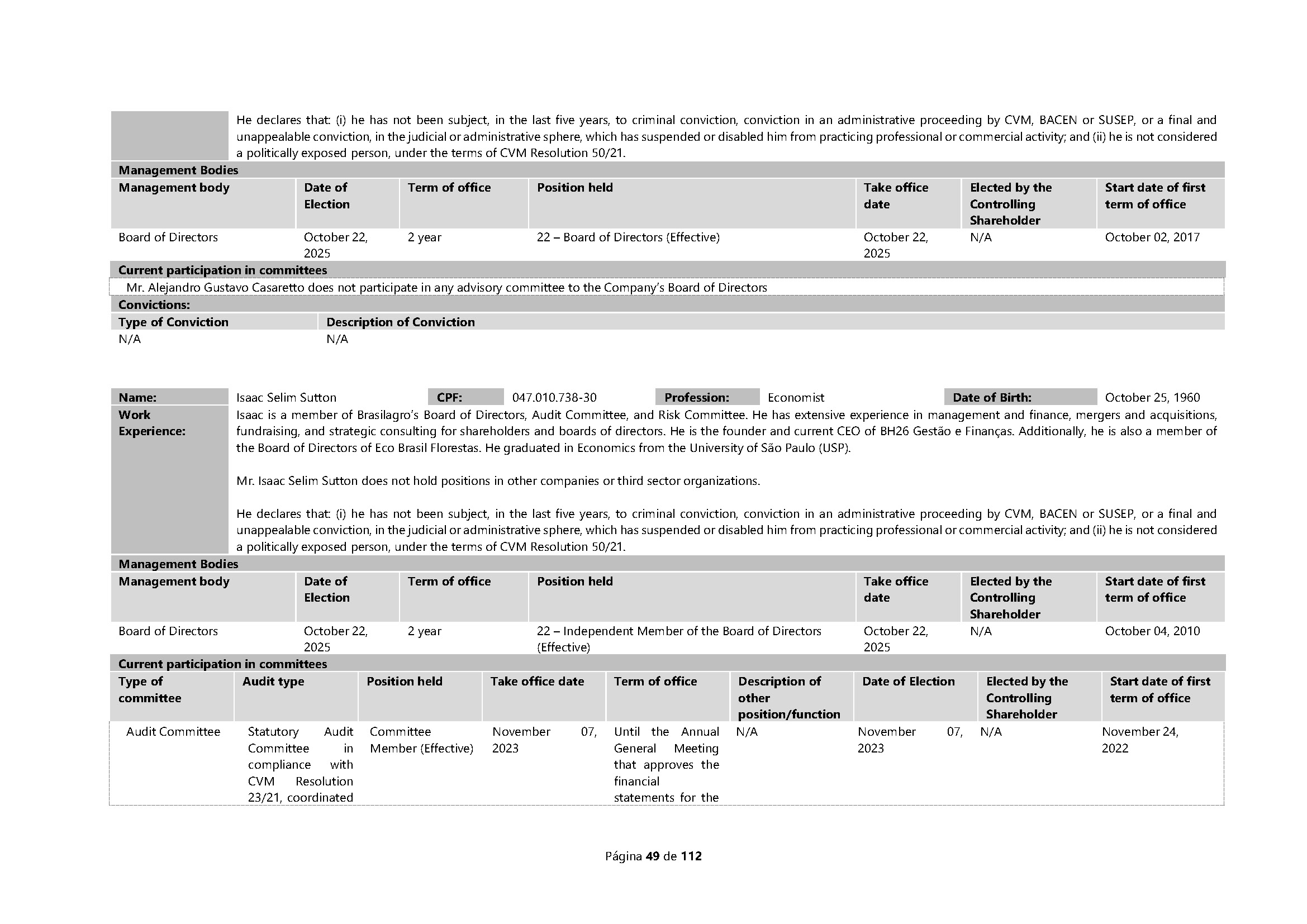 He declares that : (i) he has not been subject, in the last five years, to criminal conviction, conviction in an administrative proceeding by CVM, BACEN or SUSEP, or a final and unappealable conviction, in the judicial or administrative sphere, which has suspended or disabled him from practicing professional or commercial activity ; and (ii) he is not considered a politically exposed person, under the terms of CVM Resolution 50 / 21 . Página 49 de 112 Management Bodies Start date of first term of office Elected by the Controlling Shareholder Take office date Position held Term of office Date of Election Management body October 02, 2017 N/A October 22, 22 – Board of Directors (Effective) 2 year October 22, Board of Directors 2025 2025 Current participation in committees Mr. Alejandro Gustavo Casaretto does not participate in any advisory committee to the Company’s Board of Directors Convictions: Description of Conviction Type of Conviction N/A N/A Name: Isaac Selim Sutton CPF: 047.010.738 - 30 Profession: Economist Date of Birth: October 25, 1960 Work Isaac is a member of Brasilagro’s Board of Directors, Audit Committee, and Risk Committee. He has extensive experience in management and finance, mergers and acquisitions, Experience: fundraising, and strategic consulting for shareholders and boards of directors. He is the founder and current CEO of BH26 Gestão e Finanças. Additionally, he is also a member of the Board of Directors of Eco Brasil Florestas. He graduated in Economics from the University of São Paulo (USP). Mr . Isaac Selim Sutton does not hold positions in other companies or third sector organizations . He declares that : (i) he has not been subject, in the last five years, to criminal conviction, conviction in an administrative proceeding by CVM, BACEN or SUSEP, or a final and unappealable conviction, in the judicial or administrative sphere, which has suspended or disabled him from practicing professional or commercial activity ; and (ii) he is not considered a politically exposed person, under the terms of CVM Resolution 50 / 21 . Management Bodies Start date of first term of office Elected by the Controlling Shareholder Take office date Position held Term of office Date of Election Management body October 04, 2010 N/A October 22, 2025 22 – Independent Member of the Board of Directors (Effective) 2 year October 22, 2025 Board of Directors Current participation in committees Start date of first term of office Elected by the Controlling Shareholder Date of Election Description of other position/function Term of office Take office date Position held Audit type Type of committee Audit Committee Statutory Audit Committee November 07, Until the Annual N/A November 07, N/A November 24, Committee in Member (Effective) 2023 General Meeting 2023 2022 compliance with that approves the CVM Resolution financial 23/21, coordinated statements for the