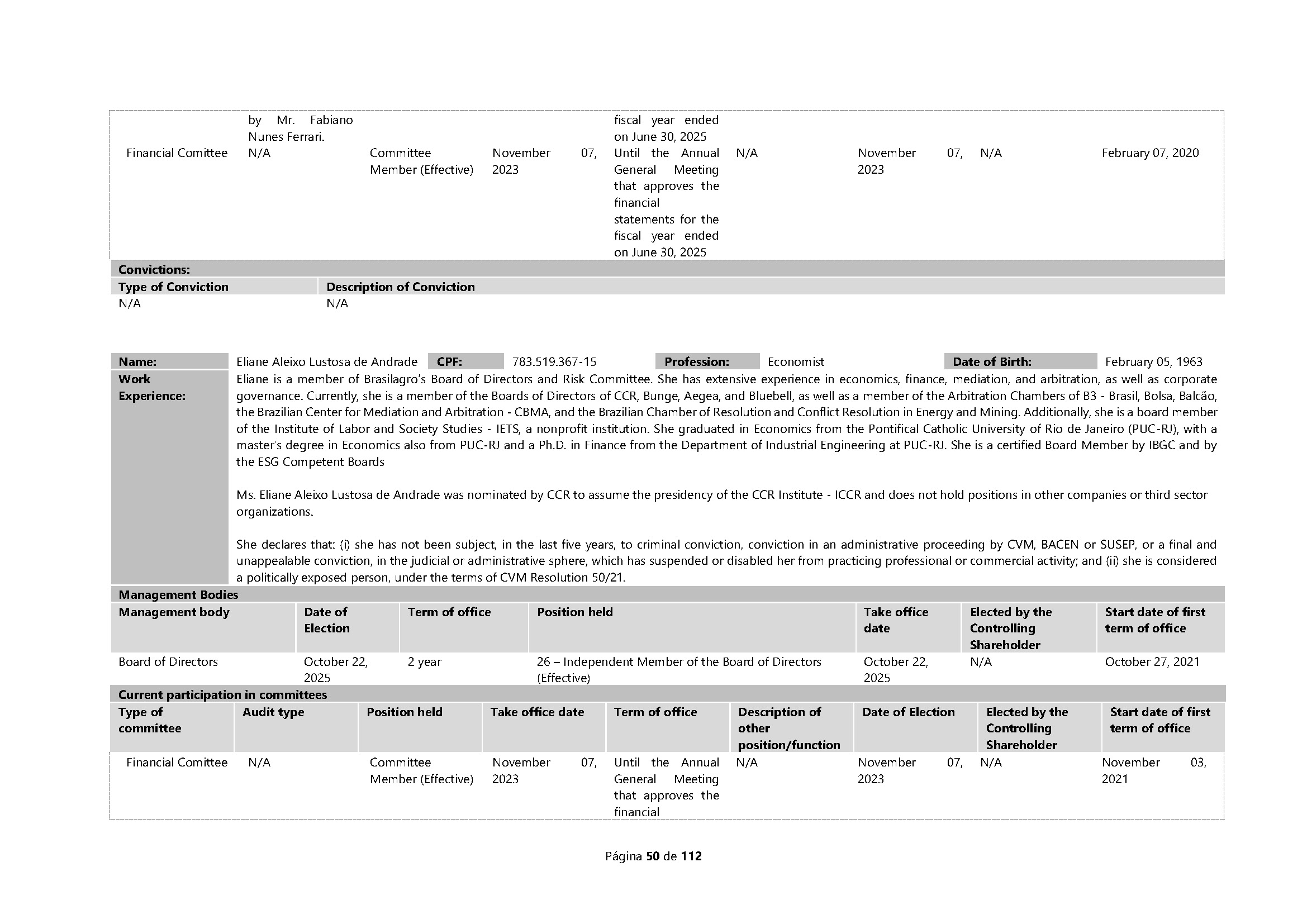 fiscal year ended on June 30, 2025 by Mr. Fabiano Nunes Ferrari. February 07, 2020 N/A November 07, 2023 N/A Until the Annual General Meeting that approves the financial statements for the fiscal year ended on June 30, 2025 November 07, 2023 Committee Member (Effective) N/A Financial Comittee Convictions: Description of Conviction Type of Conviction N/A N/A February 05, 1963 Date of Birth: Economist Profession: 783.519.367 - 15 CPF: Eliane Aleixo Lustosa de Andrade Name: Eliane is a member of Brasilagro’s Board of Directors and Risk Committee . She ha s extensive experience in economics, finance, mediation, and arbitration, a s well a s corporate governance . Currently, she is a member of the Boards of Directors of CCR, Bunge, Aegea, and Bluebell, a s well a s a member of the Arbitration Chambers of B 3 - Brasil, Bolsa, Balcão, the Brazilian Center for Mediation and Arbitration - CBMA, and the Brazilian Chamber of Resolution and Conflict Resolution in Energy and Mining . Additionally, she is a board member of the Institute of Labor and Society Studies - IETS, a nonprofit institution . She graduated in Economics from the Pontifical Catholic University of Rio de Janeiro (PUC - RJ), with a master's degree in Economics also from PUC - RJ and a Ph . D . in Finance from the Department of Industrial Engineering at PUC - RJ . She is a certified Board Member by IBGC and by the ESG Competent Boards Ms. Eliane Aleixo Lustosa de Andrade was nominated by CCR to assume the presidency of the CCR Institute - ICCR and does not hold positions in other companies or third sector organizations. She declares that : (i) she has not been subject, in the last five years, to criminal conviction, conviction in an administrative proceeding by CVM, BACEN or SUSEP, or a final and unappealable conviction, in the judicial or administrative sphere, which has suspended or disabled her from practicing professional or commercial activity ; and (ii) she is considered a politically exposed person, under the terms of CVM Resolution 50 / 21 . Work Experience: Management Bodies Start date of first term of office Elected by the Controlling Shareholder Take office date Position held Term of office Date of Election Management body Página 50 de 112 October 27, 2021 N/A October 22, 26 – Independent Member of the Board of Directors 2 year October 22, Board of Directors 2025 (Effective) 2025 Current participation in committees Start date of first term of office Elected by the Controlling Shareholder Date of Election Description of other position/function Term of office Take office date Position held Audit type Type of committee Financial Comittee N/A Committee November 07, Until the Annual N/A November 07, N/A November 03, Member (Effective) 2023 General Meeting 2023 2021 that approves the financial