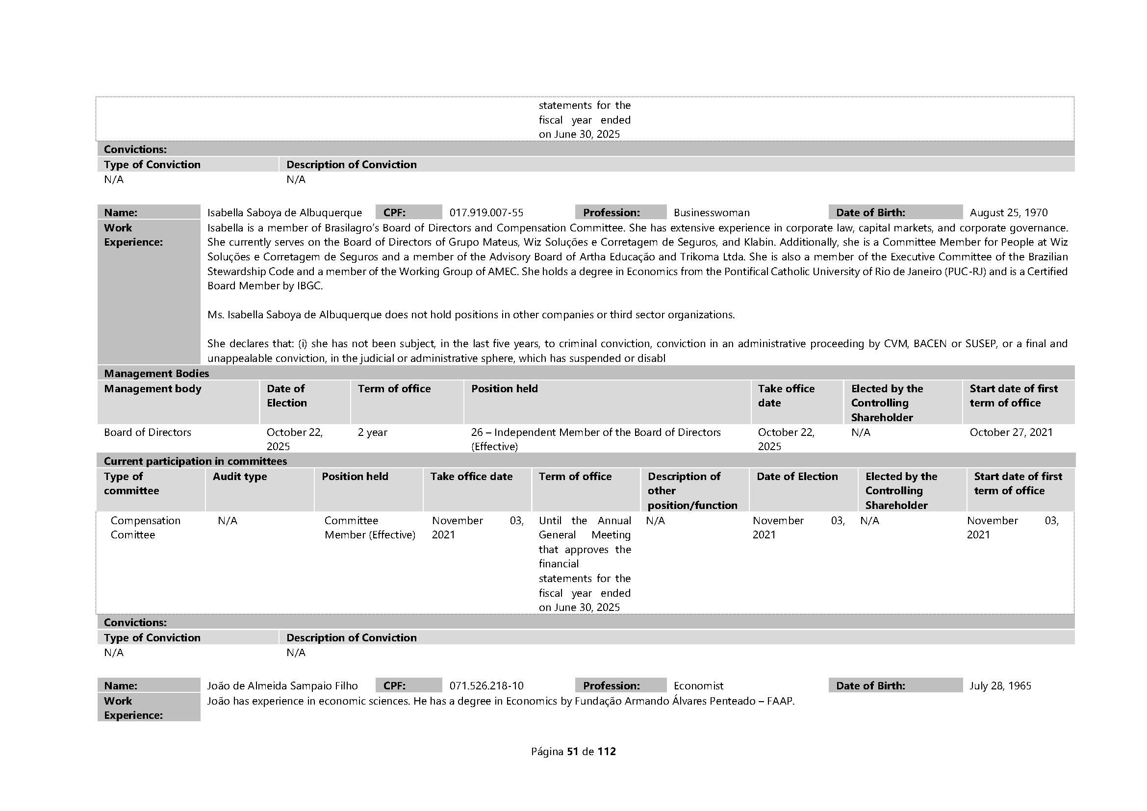 Página 51 de 112 statements for the fiscal year ended on June 30, 2025 Convictions: Description of Conviction Type of Conviction N/A N/A Name: Isabella Saboya de Albuquerque CPF: 017.919.007 - 55 Profession: Businesswoman Date of Birth: August 25, 1970 Work Isabella is a member of Brasilagro’s Board of Directors and Compensation Committee. She has extensive experience in corporate law, capital markets, and corporate governance. Experience: She currently serves on the Board of Directors of Grupo Mateus, Wiz Soluções e Corretagem de Seguros, and Klabin. Additionally, she is a Committee Member for People at Wiz Soluções e Corretagem de Seguros and a member of the Advisory Board of Artha Educação and Trikoma Ltda. She is also a member of the Executive Committee of the Brazilian Stewardship Code and a member of the Working Group of AMEC. She holds a degree in Economics from the Pontifical Catholic University of Rio de Janeiro (PUC - RJ) and is a Certified Board Member by IBGC. Ms. Isabella Saboya de Albuquerque does not hold positions in other companies or third sector organizations. She declares that: (i) she has not been subject, in the last five years, to criminal conviction, conviction in an administrative proceeding by CVM, BACEN or SUSEP, or a final and unappealable conviction, in the judicial or administrative sphere, which has suspended or disabl Management Bodies Start date of first term of office Elected by the Controlling Shareholder Take office date Position held Term of office Date of Election Management body October 27, 2021 N/A October 22, 2025 26 – Independent Member of the Board of Directors (Effective) 2 year October 22, 2025 Board of Directors Current participation in committees Start date of first term of office Elected by the Controlling Shareholder Date of Election Description of other position/function Term of office Take office date Position held Audit type Type of committee Compensation N/A Committee November 03, Until the Annual N/A November 03, N/A November 03, Comittee Member (Effective) 2021 General Meeting 2021 2021 that approves the financial statements for the fiscal year ended on June 30, 2025 Convictions: Description of Conviction Type of Conviction N/A N/A July 28, 1965 Date of Birth: Economist Profession: 071.526.218 - 10 CPF: João de Almeida Sampaio Filho Name: João has experience in economic sciences. He has a degree in Economics by Fundação Armando Álvares Penteado – FAAP. Work Experience: