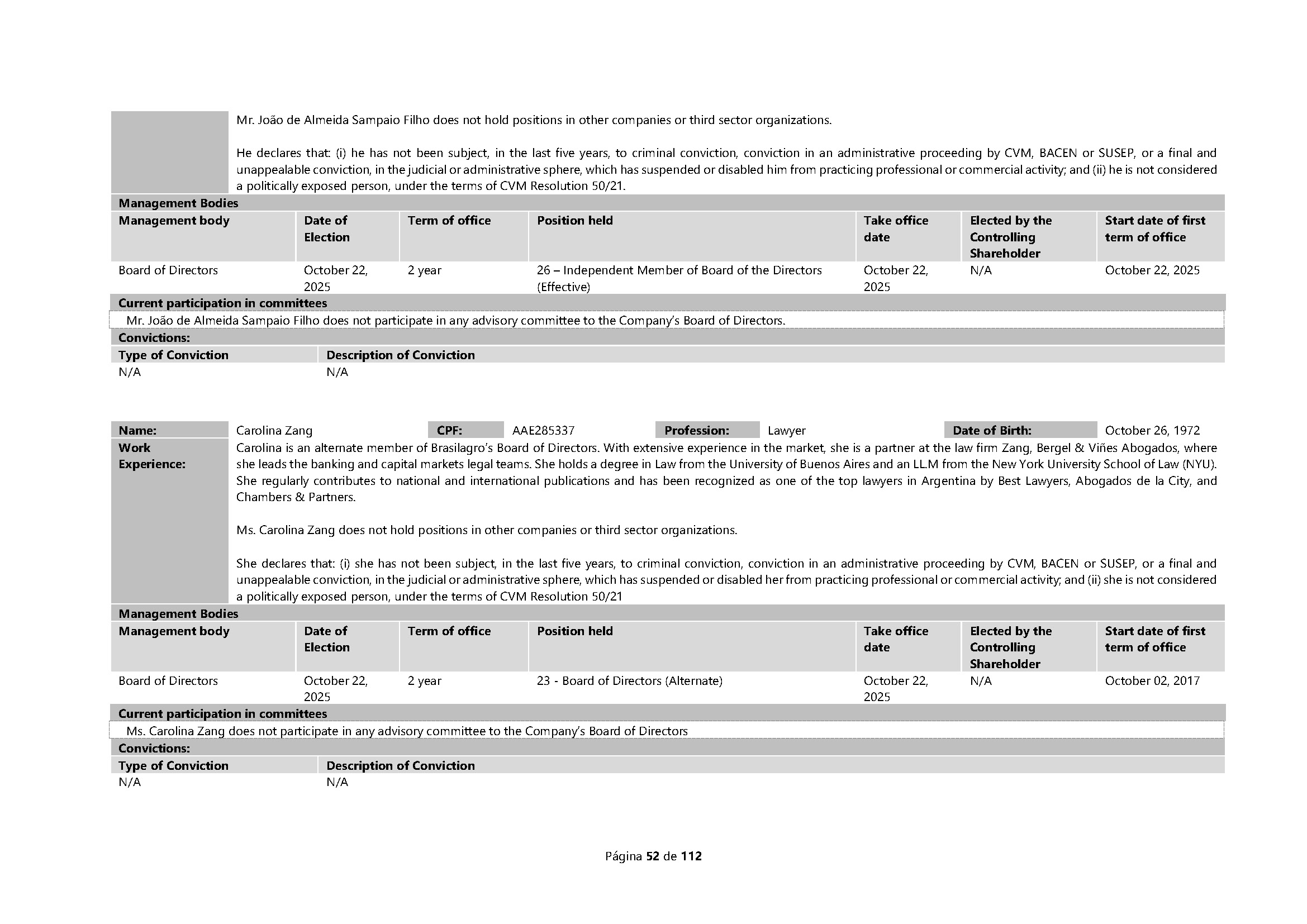Mr . João de Almeida Sampaio Filho does not hold positions in other companies or third sector organizations . He declares that : (i) he has not been subject, in the last five years, to criminal conviction, conviction in an administrative proceeding by CVM, BACEN or SUSEP, or a final and unappealable conviction, in the judicial or administrative sphere, which has suspended or disabled him from practicing professional or commercial activity ; and (ii) he is not considered a politically exposed person, under the terms of CVM Resolution 50 / 21 . Current participation in committees Mr. João de Almeida Sampaio Filho does not participate in any advisory committee to the Company’s Board of Directors. Convictions: Description of Conviction Type of Conviction Management Bodies Start date of first term of office Elected by the Controlling Shareholder Take office date Position held Term of office Date of Election Management body October 22, 2025 N/A October 22, 2025 26 – Independent Member of Board of the Directors (Effective) 2 year October 22, 2025 Board of Directors N/A N/A October 26, 1972 Date of Birth: AAE285337 Profession: Lawyer CPF: Carolina Zang Name: Work Carolina is an alternate member of Brasilagro’s Board of Directors . With extensive experience in the market, she is a partner at the law firm Zang, Bergel & Viñes Abogados, where Experience : she leads the banking and capital markets legal teams . She holds a degree in Law from the University of Buenos Aires and an LL . M from the New York University School of Law (NYU) . She regularly contributes to national and international publications and has been recognized as one of the top lawyers in Argentina by Best Lawyers, Abogados de la City, and Chambers & Partners . Ms . Carolina Zang does not hold positions in other companies or third sector organizations . She declares that : (i) she has not been subject, in the last five years, to criminal conviction, conviction in an administrative proceeding by CVM, BACEN or SUSEP, or a final and unappealable conviction, in the judicial or administrative sphere, which has suspended or disabled her from practicing professional or commercial activity ; and (ii) she is not considered a politically exposed person, under the terms of CVM Resolution 50 / 21 Management Bodies Start date of first term of office Elected by the Controlling Shareholder Take office date Position held Term of office Date of Election Management body October 02, 2017 N/A October 22, 2025 23 - Board of Directors (Alternate) 2 year October 22, 2025 Board of Directors Current participation in committees Ms. Carolina Zang does not participate in any advisory committee to the Company’s Board of Directors Convictions: Type of Conviction Description of Conviction N/A N/A Página 52 de 112