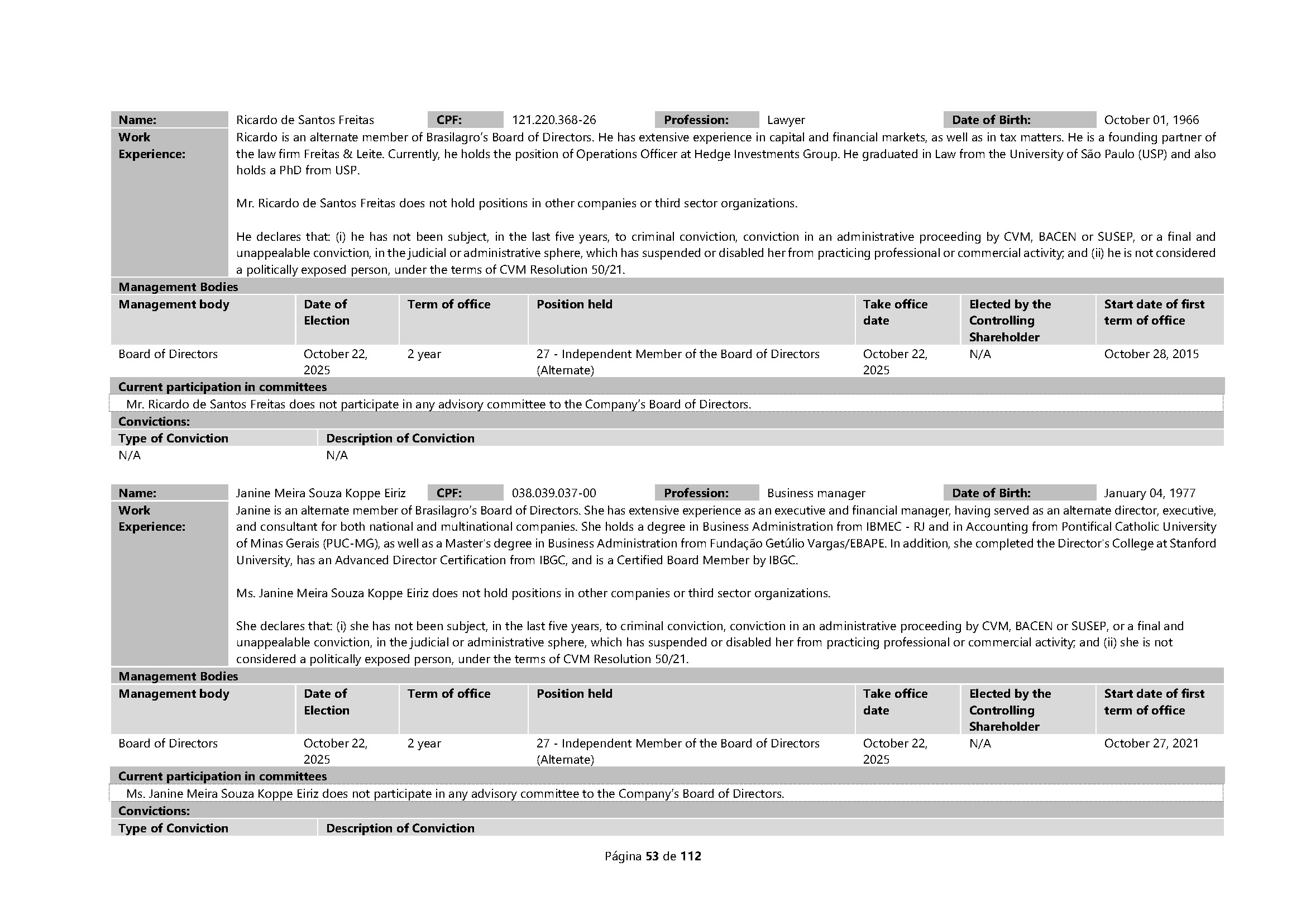 Name: Ricardo de Santos Freitas CPF: 121.220.368 - 26 Profession: Lawyer Date of Birth: October 01, 1966 Work Ricardo is an alternate member of Brasilagro’s Board of Directors. He has extensive experience in capital and financial markets, as well as in tax matters. He is a founding partner of Experience: the law firm Freitas & Leite. Currently, he holds the position of Operations Officer at Hedge Investments Group. He graduated in Law from the University of São Paulo (USP) and also holds a PhD from USP. Mr . Ricardo de Santos Freitas does not hold positions in other companies or third sector organizations . He declares that : (i) he has not been subject, in the last five years, to criminal conviction, conviction in an administrative proceeding by CVM, BACEN or SUSEP, or a final and unappealable conviction, in the judicial or administrative sphere, which has suspended or disabled her from practicing professional or commercial activity ; and (ii) he is not considered a politically exposed person, under the terms of CVM Resolution 50 / 21 . Management Bodies Start date of first term of office Elected by the Controlling Shareholder Take office date Position held Term of office Date of Election Management body October 28, 2015 N/A October 22, 2025 27 - Independent Member of the Board of Directors (Alternate) 2 year October 22, 2025 Board of Directors Current participation in committees Mr. Ricardo de Santos Freitas does not participate in any advisory committee to the Company’s Board of Directors. Convictions: Description of Conviction Type of Conviction N/A Name: Work Experience: N/A Janine Meira Souza Koppe Eiriz CPF : 038 . 039 . 037 - 00 Profession : Business manager Date of Birth : January 04 , 1977 Janine is an alternate member of Brasilagro’s Board of Directors . She has extensive experience as an executive and financial manager, having served as an alternate director, executive, and consultant for both national and multinational companies . She holds a degree in Business Administration from IBMEC - RJ and in Accounting from Pontifical Catholic University of Minas Gerais (PUC - MG), as well as a Master's degree in Business Administration from Fundação Getúlio Vargas/EBAPE . In addition, she completed the Director's College at Stanford University, has an Advanced Director Certification from IBGC, and is a Certified Board Member by IBGC . Ms. Janine Meira Souza Koppe Eiriz does not hold positions in other companies or third sector organizations. She declares that: (i) she has not been subject, in the last five years, to criminal conviction, conviction in an administrative proceeding by CVM, BACEN or SUSEP, or a final and unappealable conviction, in the judicial or administrative sphere, which has suspended or disabled her from practicing professional or commercial activity; and (ii) she is not considered a politically exposed person, under the terms of CVM Resolution 50/21. Management Bodies Start date of first term of office Elected by the Controlling Shareholder Take office date Position held Term of office Date of Election Management body October 27, 2021 N/A October 22, 2025 27 - Independent Member of the Board of Directors (Alternate) 2 year October 22, 2025 Board of Directors Current participation in committees Ms. Janine Meira Souza Koppe Eiriz does not participate in any advisory committee to the Company’s Board of Directors. Convictions: Type of Conviction Description of Conviction Página 53 de 112