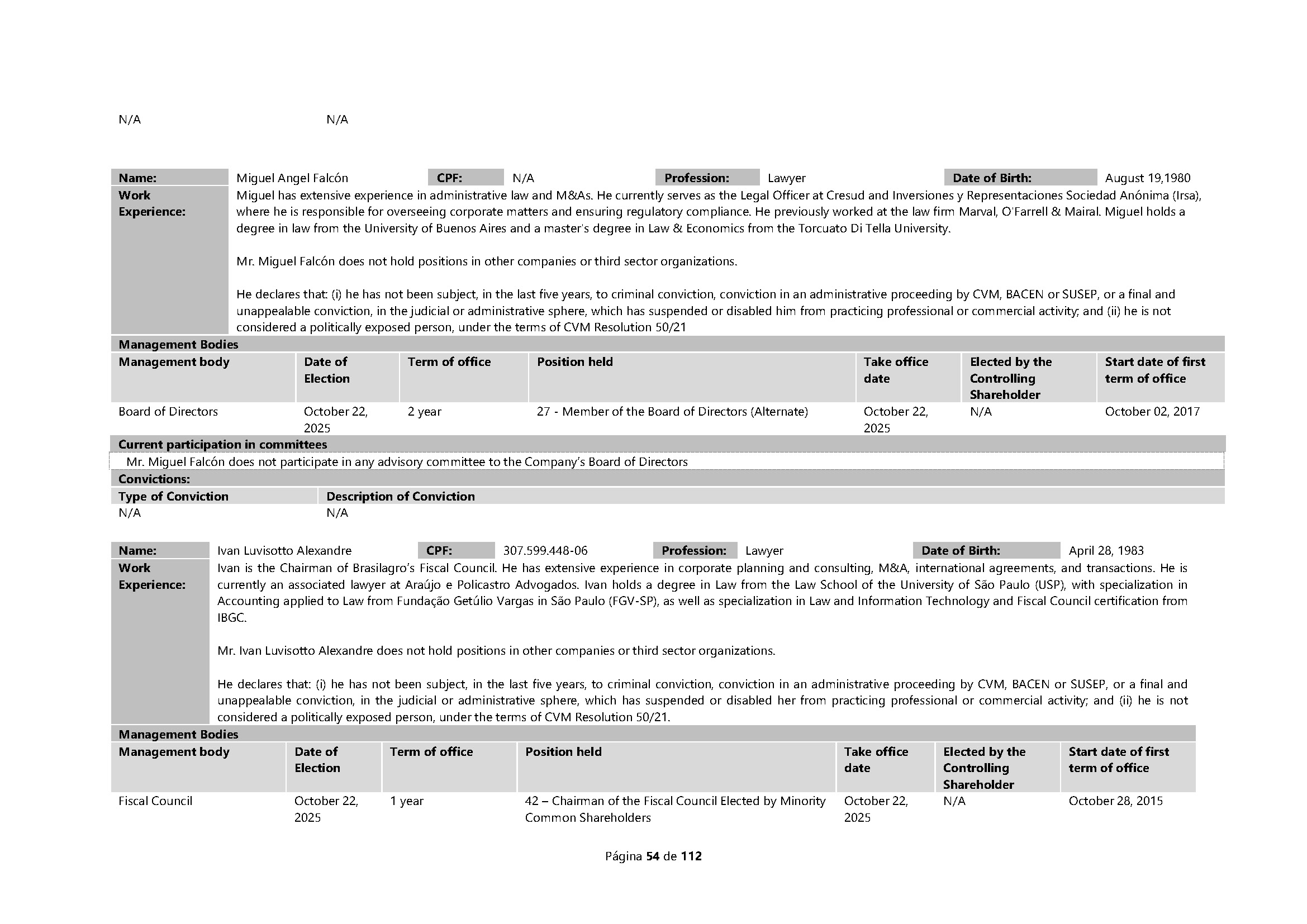 N/A N/A Name: Work Experience: Miguel Angel Falcón CPF: N/A Profession: Lawyer Date of Birth: August 19,1980 Miguel has extensive experience in administrative law and M&As. He currently serves as the Legal Officer at Cresud and Inversiones y Representaciones Sociedad Anónima (Irsa), where he is responsible for overseeing corporate matters and ensuring regulatory compliance. He previously worked at the law firm Marval, O'Farrell & Mairal. Miguel holds a degree in law from the University of Buenos Aires and a master's degree in Law & Economics from the Torcuato Di Tella University. Mr. Miguel Falcón does not hold positions in other companies or third sector organizations. He declares that: (i) he has not been subject, in the last five years, to criminal conviction, conviction in an administrative proceeding by CVM, BACEN or SUSEP, or a final and unappealable conviction, in the judicial or administrative sphere, which has suspended or disabled him from practicing professional or commercial activity; and (ii) he is not considered a politically exposed person, under the terms of CVM Resolution 50/21 Management Bodies Management body Take office date Elected by the Controlling Shareholder Start date of first term of office Board of Directors Date of Term of office Position held Election October 22, 2 year 27 - Member of the Board of Directors (Alternate) 2025 October 22, 2025 N/A October 02, 2017 Current participation in committees Mr. Miguel Falcón does not participate in any advisory committee to the Company’s Board of Directors Convictions: Description of Conviction Type of Conviction N/A N/A April 28, 1983 Date of Birth: Lawyer Profession: 307.599.448 - 06 CPF: Ivan Luvisotto Alexandre Name: Ivan is the Chairman of Brasilagro’s Fiscal Council . He has extensive experience in corporate planning and consulting, M&A, international agreements, and transactions . He is currently an associated lawyer at Araújo e Policastro Advogados . Ivan holds a degree in Law from the Law School of the University of São Paulo (USP), with specialization in Accounting applied to Law from Fundação Getúlio Vargas in São Paulo (FGV - SP), as well as specialization in Law and Information Technology and Fiscal Council certification from IBGC . Mr . Ivan Luvisotto Alexandre does not hold positions in other companies or third sector organizations . He declares that : (i) he has not been subject, in the last five years, to criminal conviction, conviction in an administrative proceeding by CVM, BACEN or SUSEP, or a final and unappealable conviction, in the judicial or administrative sphere, which has suspended or disabled her from practicing professional or commercial activity ; and (ii) he is not considered a politically exposed person, under the terms of CVM Resolution 50 / 21 . Work Experience: Management Bodies Start date of first term of office Elected by the Controlling Shareholder Take office date Position held Term of office Date of Election Management body Página 54 de 112 October 28, 2015 N/A October 22, 42 – Chairman of the Fiscal Council Elected by Minority 1 year October 22, Fiscal Council 2025 Common Shareholders 2025