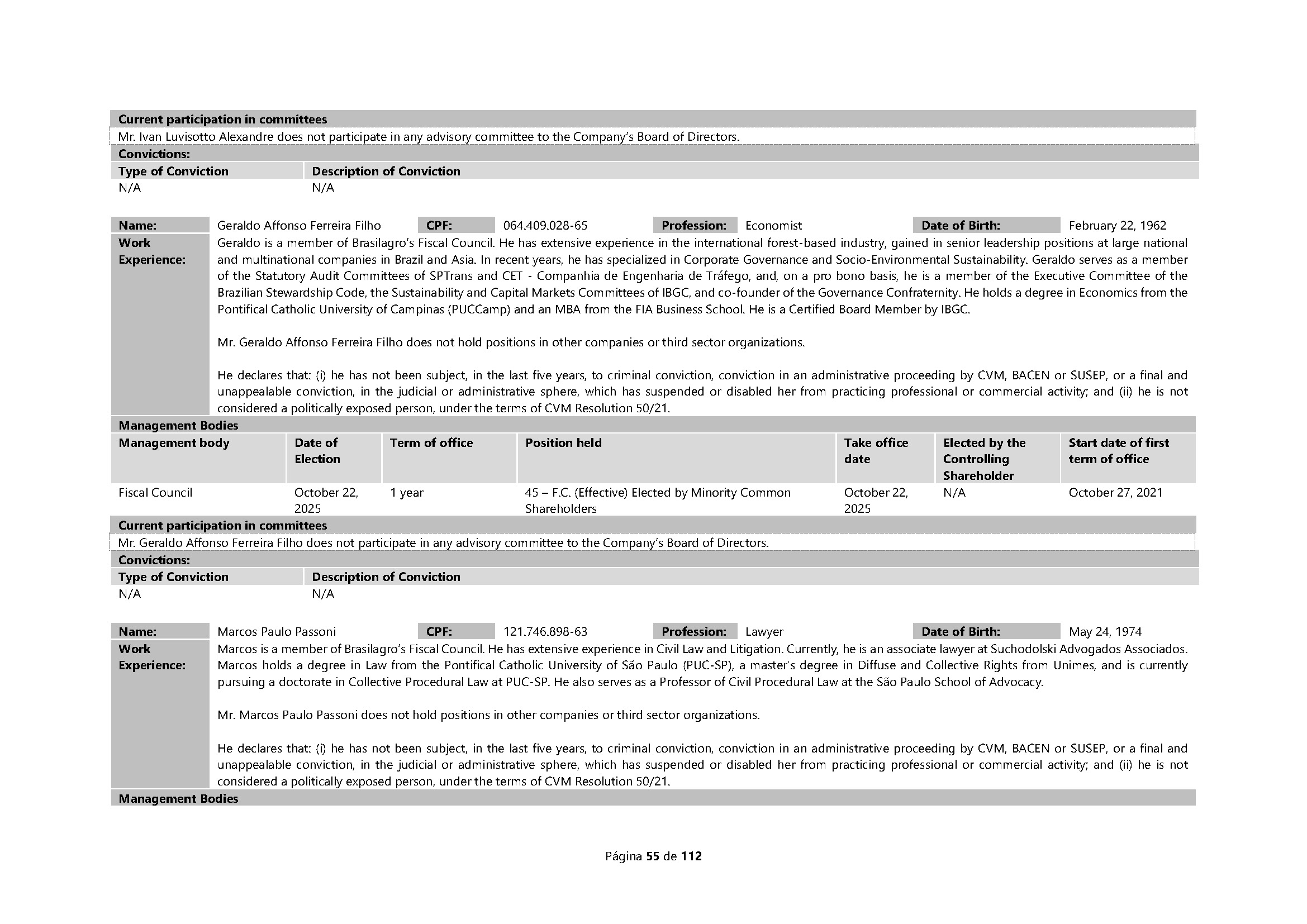 Current participation in committees Mr. Ivan Luvisotto Alexandre does not participate in any advisory committee to the Company’s Board of Directors. Convictions: Description of Conviction Type of Conviction N/A N/A February 22, 1962 Date of Birth: Economist Profession: 064.409.028 - 65 CPF: Geraldo Affonso Ferreira Filho Name: Geraldo is a member of Brasilagro’s Fiscal Council . He has extensive experience in the international forest - based industry, gained in senior leadership positions at large national and multinational companies in Brazil and Asia . In recent years, he has specialized in Corporate Governance and Socio - Environmental Sustainability . Geraldo serves as a member of the Statutory Audit Committees of SPTrans and CET - Companhia de Engenharia de Tráfego, and, on a pro bono basis, he is a member of the Executive Committee of the Brazilian Stewardship Code, the Sustainability and Capital Markets Committees of IBGC, and co - founder of the Governance Confraternity . He holds a degree in Economics from the Pontifical Catholic University of Campinas (PUCCamp) and an MBA from the FIA Business School . He is a Certified Board Member by IBGC . Mr . Geraldo Affonso Ferreira Filho does not hold positions in other companies or third sector organizations . He declares that : (i) he has not been subject, in the last five years, to criminal conviction, conviction in an administrative proceeding by CVM, BACEN or SUSEP, or a final and unappealable conviction, in the judicial or administrative sphere, which has suspended or disabled her from practicing professional or commercial activity ; and (ii) he is not considered a politically exposed person, under the terms of CVM Resolution 50 / 21 . Work Experience: Management Bodies Start date of first term of office Elected by the Controlling Shareholder Take office date Position held Term of office Date of Election Management body Página 55 de 112 Fiscal Council October 22, 2025 1 year 45 – F.C. (Effective) Elected by Minority Common Shareholders October 22, N/A 2025 October 27, 2021 Current participation in committees Mr. Geraldo Affonso Ferreira Filho does not participate in any advisory committee to the Company’s Board of Directors. Convictions: Description of Conviction Type of Conviction N/A N/A May 24, 1974 Date of Birth: Lawyer Profession: 121.746.898 - 63 CPF: Marcos Paulo Passoni Name: Marcos is a member of Brasilagro’s Fiscal Council . He has extensive experience in Civil Law and Litigation . Currently, he is an associate lawyer at Suchodolski Advogados Associados . Marcos holds a degree in Law from the Pontifical Catholic University of São Paulo (PUC - SP), a master's degree in Diffuse and Collective Rights from Unimes, and is currently pursuing a doctorate in Collective Procedural Law at PUC - SP . He also serves as a Professor of Civil Procedural Law at the São Paulo School of Advocacy . Mr . Marcos Paulo Passoni does not hold positions in other companies or third sector organizations . He declares that : (i) he has not been subject, in the last five years, to criminal conviction, conviction in an administrative proceeding by CVM, BACEN or SUSEP, or a final and unappealable conviction, in the judicial or administrative sphere, which has suspended or disabled her from practicing professional or commercial activity ; and (ii) he is not considered a politically exposed person, under the terms of CVM Resolution 50 / 21 . Work Experience: Management Bodies