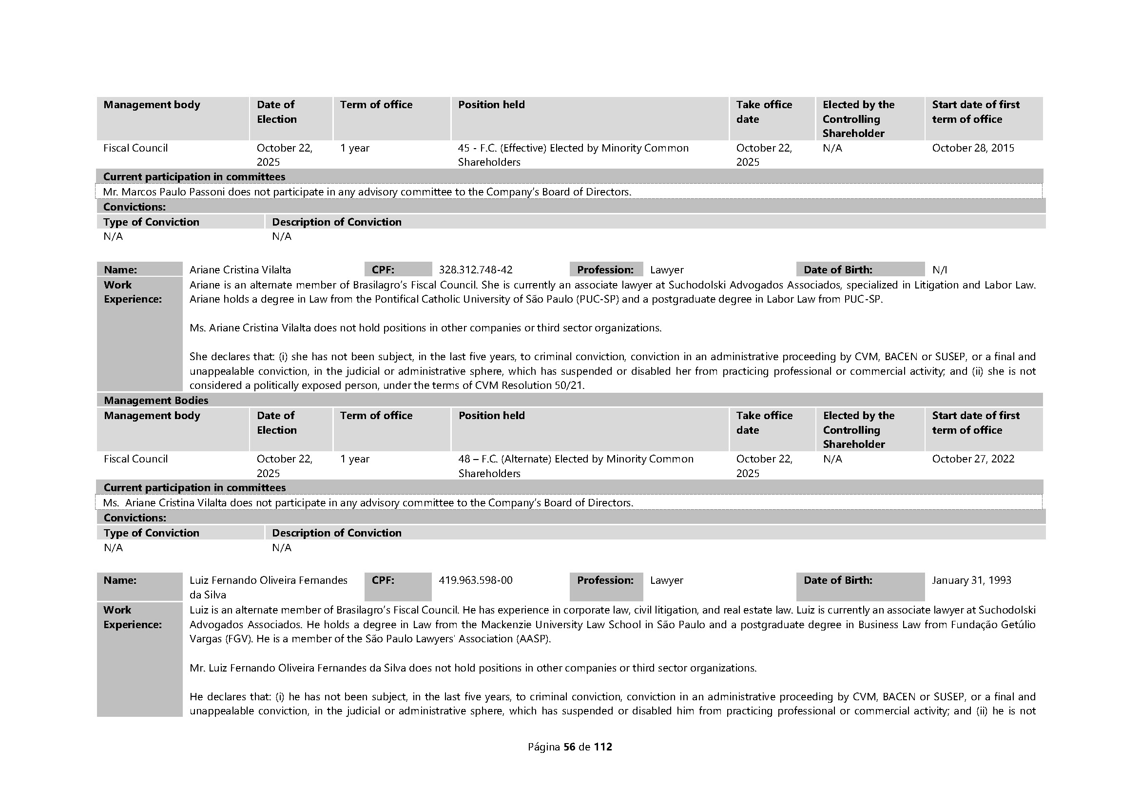 Página 56 de 112 Start date of first term of office Elected by the Controlling Shareholder Take office date Position held Term of office Date of Election Management body Fiscal Council October 22, 1 year 2025 45 - F.C. (Effective) Elected by Minority Common Shareholders October 22, N/A 2025 October 28, 2015 Current participation in committees Mr. Marcos Paulo Passoni does not participate in any advisory committee to the Company’s Board of Directors. Convictions: Description of Conviction Type of Conviction N/A N/A N/I Date of Birth: Lawyer Profession: 328.312.748 - 42 CPF: Ariane Cristina Vilalta Name: Work Ariane is an alternate member of Brasilagro’s Fiscal Council . She is currently an associate lawyer at Suchodolski Advogados Associados, specialized in Litigation and Labor Law . Experience : Ariane holds a degree in Law from the Pontifical Catholic University of São Paulo (PUC - SP) and a postgraduate degree in Labor Law from PUC - SP . Ms . Ariane Cristina Vilalta does not hold positions in other companies or third sector organizations . She declares that : (i) she has not been subject, in the last five years, to criminal conviction, conviction in an administrative proceeding by CVM, BACEN or SUSEP, or a final and unappealable conviction, in the judicial or administrative sphere, which has suspended or disabled her from practicing professional or commercial activity ; and (ii) she is not considered a politically exposed person, under the terms of CVM Resolution 50 / 21 . Management Bodies Start date of first term of office Elected by the Controlling Shareholder Take office date Position held Term of office Date of Election Management body October 27, 2022 N/A October 22, 2025 48 – F.C. (Alternate) Elected by Minority Common Shareholders 1 year October 22, 2025 Fiscal Council Current participation in committees Ms. Ariane Cristina Vilalta does not participate in any advisory committee to the Company’s Board of Directors. Convictions: Description of Conviction Type of Conviction N/A N/A January 31, 1993 Date of Birth: Lawyer Profession: 419.963.598 - 00 CPF: Luiz Fernando Oliveira Fernandes da Silva Name: Luiz is an alternate member of Brasilagro’s Fiscal Council . He has experience in corporate law, civil litigation, and real estate law . Luiz is currently an associate lawyer at Suchodolski Advogados Associados . He holds a degree in Law from the Mackenzie University Law School in São Paulo and a postgraduate degree in Business Law from Fundação Getúlio Vargas (FGV) . He is a member of the São Paulo Lawyers' Association (AASP) . Mr . Luiz Fernando Oliveira Fernandes da Silva does not hold positions in other companies or third sector organizations . He declares that : (i) he has not been subject, in the last five years, to criminal conviction, conviction in an administrative proceeding by CVM, BACEN or SUSEP, or a final and unappealable conviction, in the judicial or administrative sphere, which has suspended or disabled him from practicing professional or commercial activity ; and (ii) he is not Work Experience: