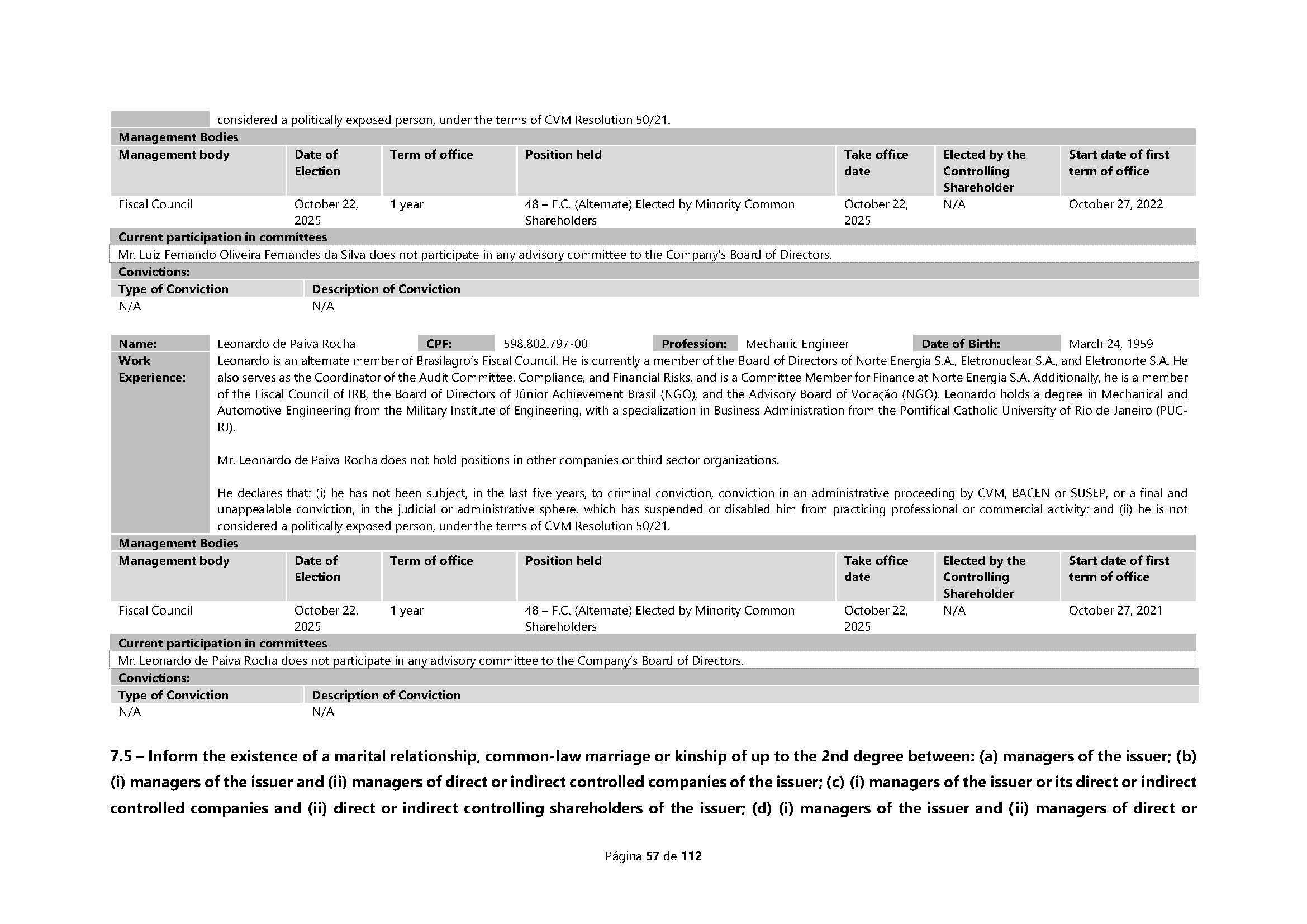considered a politically exposed person, under the terms of CVM Resolution 50/21. Management Bodies Start date of first term of office Elected by the Controlling Shareholder Take office date Position held Term of office Date of Election Management body Fiscal Council October 22, 1 year 2025 48 – F.C. (Alternate) Elected by Minority Common Shareholders October 22, N/A 2025 October 27, 2022 Current participation in committees Mr. Luiz Fernando Oliveira Fernandes da Silva does not participate in any advisory committee to the Company’s Board of Directors. Convictions: Description of Conviction Type of Conviction N/A N/A March 24, 1959 Date of Birth: Mechanic Engineer Profession: 598.802.797 - 00 CPF: Leonardo de Paiva Rocha Name: Leonardo is an alternate member of Brasilagro’s Fiscal Council . He is currently a member of the Board of Directors of Norte Energia S . A . , Eletronuclear S . A . , and Eletronorte S . A . He also serves as the Coordinator of the Audit Committee, Compliance, and Financial Risks, and is a Committee Member for Finance at Norte Energia S . A . Additionally, he is a member of the Fiscal Council of IRB, the Board of Directors of Júnior Achievement Brasil (NGO), and the Advisory Board of Vocação (NGO) . Leonardo holds a degree in Mechanical and Automotive Engineering from the Military Institute of Engineering, with a specialization in Business Administration from the Pontifical Catholic University of Rio de Janeiro (PUC - RJ). Mr . Leonardo de Paiva Rocha does not hold positions in other companies or third sector organizations . He declares that : (i) he has not been subject, in the last five years, to criminal conviction, conviction in an administrative proceeding by CVM, BACEN or SUSEP, or a final and unappealable conviction, in the judicial or administrative sphere, which has suspended or disabled him from practicing professional or commercial activity ; and (ii) he is not considered a politically exposed person, under the terms of CVM Resolution 50 / 21 . Work Experience: Management Bodies Start date of first term of office Elected by the Controlling Shareholder Take office date Position held Term of office Date of Election Management body Página 57 de 112 October 27, 2021 N/A October 22, 48 – F.C. (Alternate) Elected by Minority Common 1 year October 22, Fiscal Council 2025 Shareholders 2025 Current participation in committees Mr. Leonardo de Paiva Rocha does not participate in any advisory committee to the Company’s Board of Directors. Convictions: Description of Conviction Type of Conviction N/A N/A 7.5 – Inform the existence of a marital relationship, common - law marriage or kinship of up to the 2nd degree between: (a) managers of the issuer; (b) (i) managers of the issuer and (ii) managers of direct or indirect controlled companies of the issuer; (c) (i) managers of the issuer or its direct or indirect controlled companies and (ii) direct or indirect controlling shareholders of the issuer; (d) (i) managers of the issuer and ( ii) managers of direct or