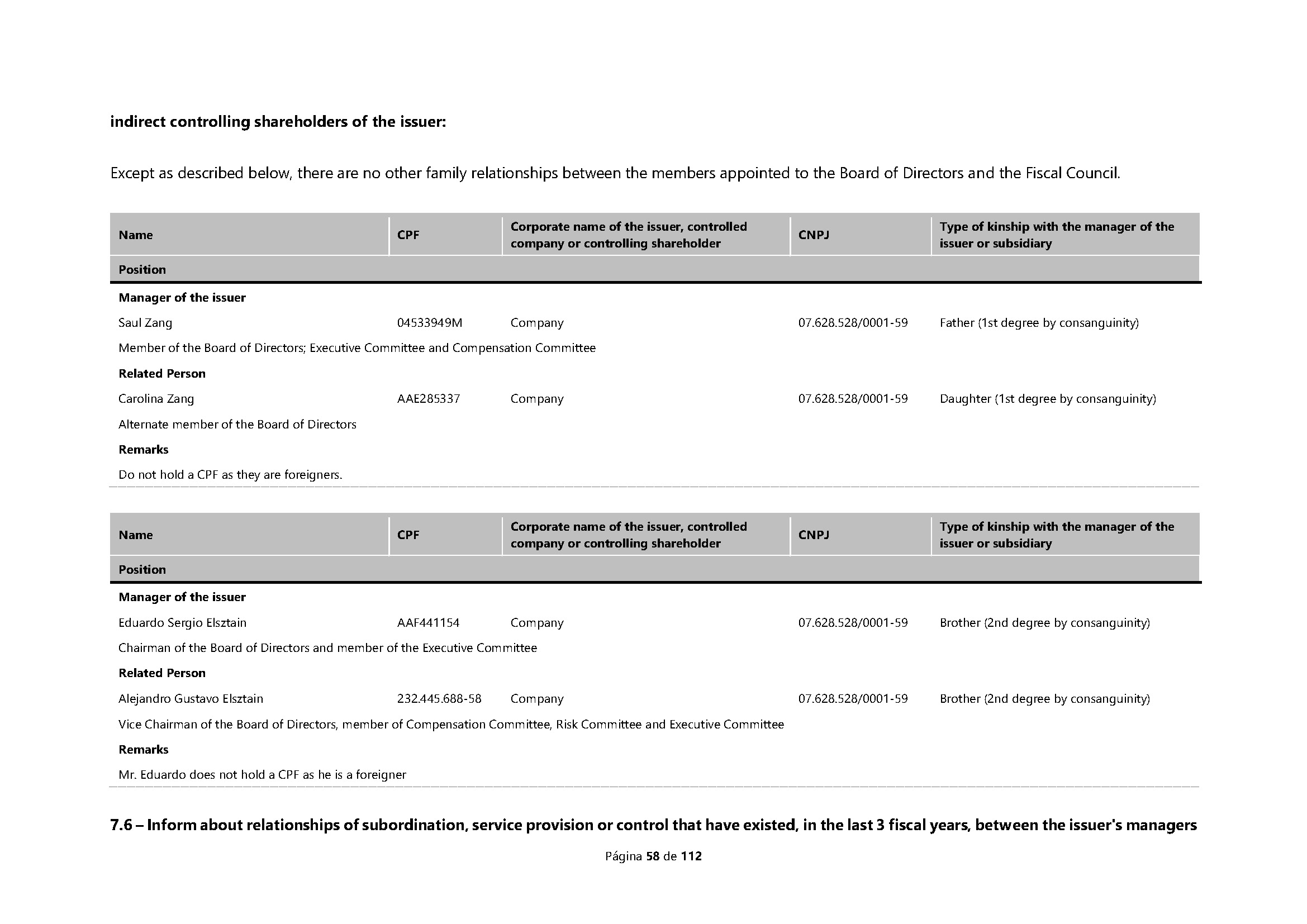 indirect controlling shareholders of the issuer: Except as described below, there are no other family relationships between the members appointed to the Board of Directors and the Fiscal Council. Type of kinship with the manager of the issuer or subsidiary CNPJ Corporate name of the issuer, controlled company or controlling shareholder CPF Name Position Manager of the issuer Saul Zang 04533949M Company Member of the Board of Directors; Executive Committee and Compensation Committee Related Person 07.628.528/0001 - 59 Father (1st degree by consanguinity) Daughter (1st degree by consanguinity) 07.628.528/0001 - 59 Company AAE285337 Carolina Zang Alternate member of the Board of Directors Remarks Do not hold a CPF as they are foreigners. Type of kinship with the manager of the issuer or subsidiary CNPJ Corporate name of the issuer, controlled company or controlling shareholder CPF Name Position Manager of the issuer Eduardo Sergio Elsztain AAF441154 Company Chairman of the Board of Directors and member of the Executive Committee Related Person Alejandro Gustavo Elsztain 232.445.688 - 58 Company Vice Chairman of the Board of Directors, member of Compensation Committee, Risk Committee and Executive Committee Remarks Mr. Eduardo does not hold a CPF as he is a foreigner 07.628.528/0001 - 59 Brother (2nd degree by consanguinity) 07.628.528/0001 - 59 Brother (2nd degree by consanguinity) 7.6 – Inform about relationships of subordination, service provision or control that have existed, in the last 3 fiscal years, between the issuer's managers Página 58 de 112