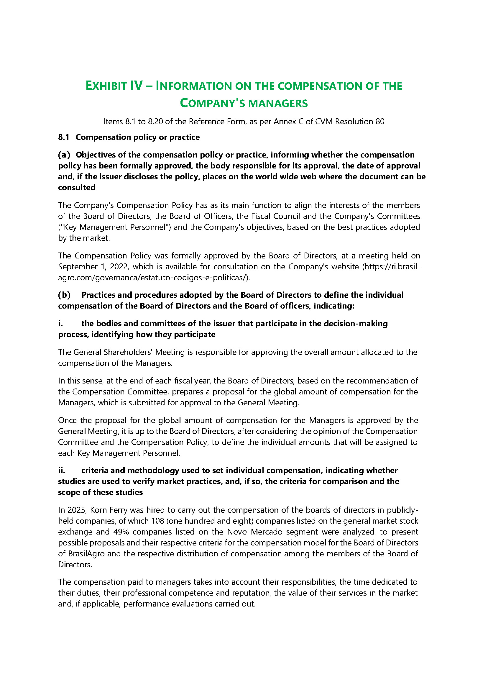 E XHIBIT IV – I NFORMATION ON THE COMPENSATION OF THE C OMPANY ' S MANAGERS Items 8.1 to 8.20 of the Reference Form, as per Annex C of CVM Resolution 80 8.1 Compensation policy or practice (a) Objectives of the compensation policy or practice, informing whether the compensation policy has been formally approved, the body responsible for its approval, the date of approval and, if the issuer discloses the policy, places on the world wide web where the document can be consulted The Company's Compensation Policy has as its main function to align the interests of the members of the Board of Directors, the Board of Officers, the Fiscal Council and the Company's Committees ("Key Management Personnel") and the Company's objectives, based on the best practices adopted by the market . The Compensation Policy was formally approved by the Board of Directors, at a meeting held on September 1 , 2022 , which is available for consultation on the Company's website (https : //ri . brasil - agro . com/governanca/estatuto - codigos - e - politicas/) . (b) Practices and procedures adopted by the Board of Directors to define the individual compensation of the Board of Directors and the Board of officers, indicating: i. the bodies and committees of the issuer that participate in the decision - making process, identifying how they participate The General Shareholders' Meeting is responsible for approving the overall amount allocated to the compensation of the Managers . In this sense, at the end of each fiscal year, the Board of Directors, based on the recommendation of the Compensation Committee, prepares a proposal for the global amount of compensation for the Managers, which is submitted for approval to the General Meeting . Once the proposal for the global amount of compensation for the Managers is approved by the General Meeting, it is up to the Board of Directors, after considering the opinion of the Compensation Committee and the Compensation Policy, to define the individual amounts that will be assigned to each Key Management Personnel . ii. criteria and methodology used to set individual compensation, indicating whether studies are used to verify market practices, and, if so, the criteria for comparison and the scope of these studies In 2025 , Korn Ferry was hired to carry out the compensation of the boards of directors in publicly - held companies, of which 108 (one hundred and eight) companies listed on the general market stock exchange and 49 % companies listed on the Novo Mercado segment were analyzed, to present possible proposals and their respective criteria for the compensation model for the Board of Directors of BrasilAgro and the respective distribution of compensation among the members of the Board of Directors . The compensation paid to managers takes into account their responsibilities, the time dedicated to their duties, their professional competence and reputation, the value of their services in the market and, if applicable, performance evaluations carried out .