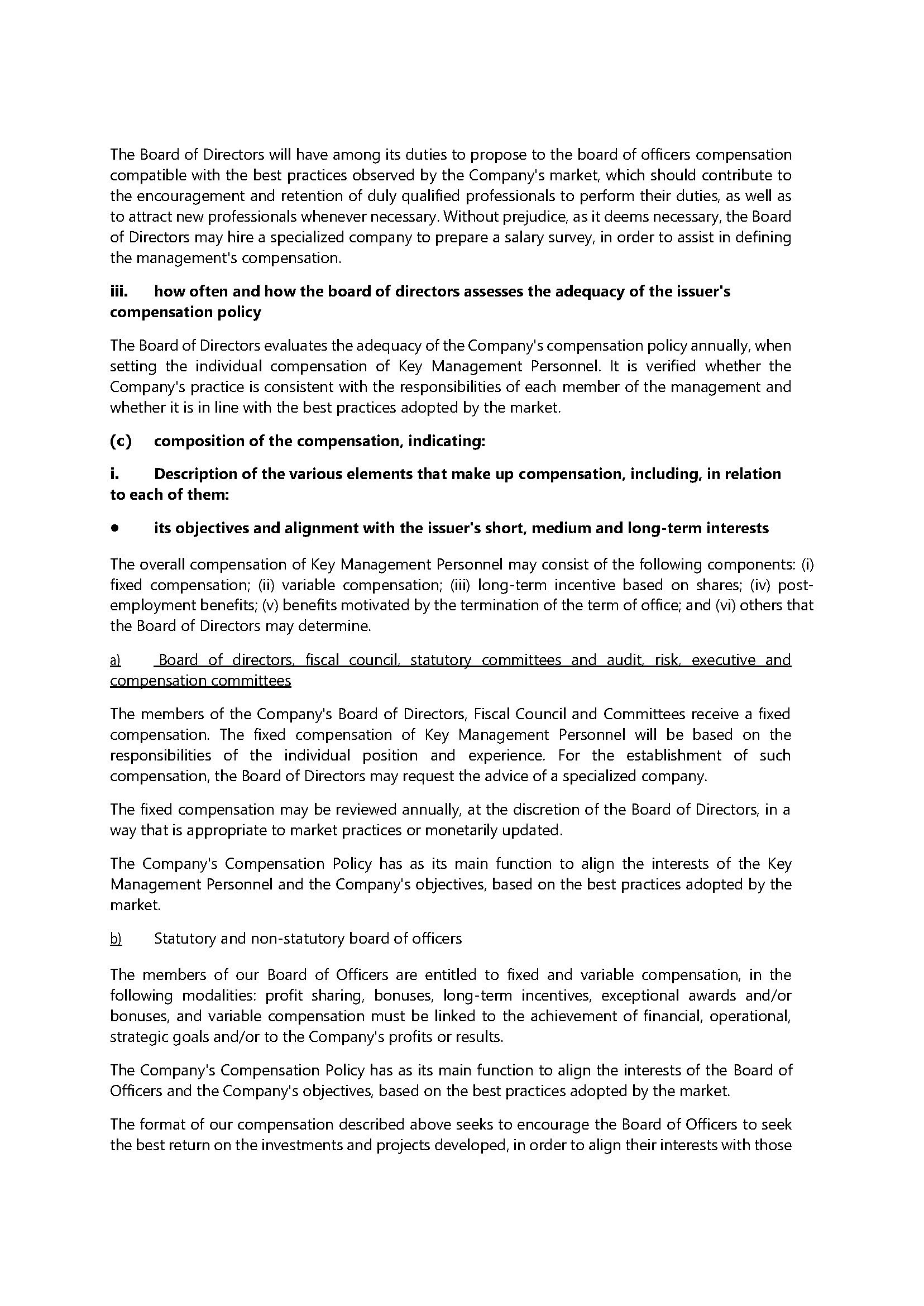 The Board of Directors will have among its duties to propose to the board of officers compensation compatible with the best practices observed by the Company's market, which should contribute to the encouragement and retention of duly qualified professionals to perform their duties, as well as to attract new professionals whenever necessary . Without prejudice, as it deems necessary, the Board of Directors may hire a specialized company to prepare a salary survey, in order to assist in defining the management's compensation . iii. how often and how the board of directors assesses the adequacy of the issuer's compensation policy The Board of Directors evaluates the adequacy of the Company's compensation policy annually, when setting the individual compensation of Key Management Personnel . It is verified whether the Company's practice is consistent with the responsibilities of each member of the management and whether it is in line with the best practices adopted by the market . (c) composition of the compensation, indicating: i. Description of the various elements that make up compensation, including, in relation to each of them: • its objectives and alignment with the issuer's short, medium and long - term interests The overall compensation of Key Management Personnel may consist of the following components : (i) fixed compensation ; (ii) variable compensation ; (iii) long - term incentive based on shares ; (iv) post - employment benefits ; (v) benefits motivated by the termination of the term of office ; and (vi) others that the Board of Directors may determine . a) Board of directors, fiscal council, statutory committees and audit, risk, executive and compensation committees The members of the Company's Board of Directors, Fiscal Council and Committees receive a fixed compensation . The fixed compensation of Key Management Personnel will be based on the responsibilities of the individual position and experience . For the establishment of such compensation, the Board of Directors may request the advice of a specialized company . The fixed compensation may be reviewed annually, at the discretion of the Board of Directors, in a way that is appropriate to market practices or monetarily updated . The Company's Compensation Policy has as its main function to align the interests of the Key Management Personnel and the Company's objectives, based on the best practices adopted by the market . b) Statutory and non - statutory board of officers The members of our Board of Officers are entitled to fixed and variable compensation, in the following modalities : profit sharing, bonuses, long - term incentives, exceptional awards and/or bonuses, and variable compensation must be linked to the achievement of financial, operational, strategic goals and/or to the Company's profits or results . The Company's Compensation Policy has as its main function to align the interests of the Board of Officers and the Company's objectives, based on the best practices adopted by the market . The format of our compensation described above seeks to encourage the Board of Officers to seek the best return on the investments and projects developed, in order to align their interests with those