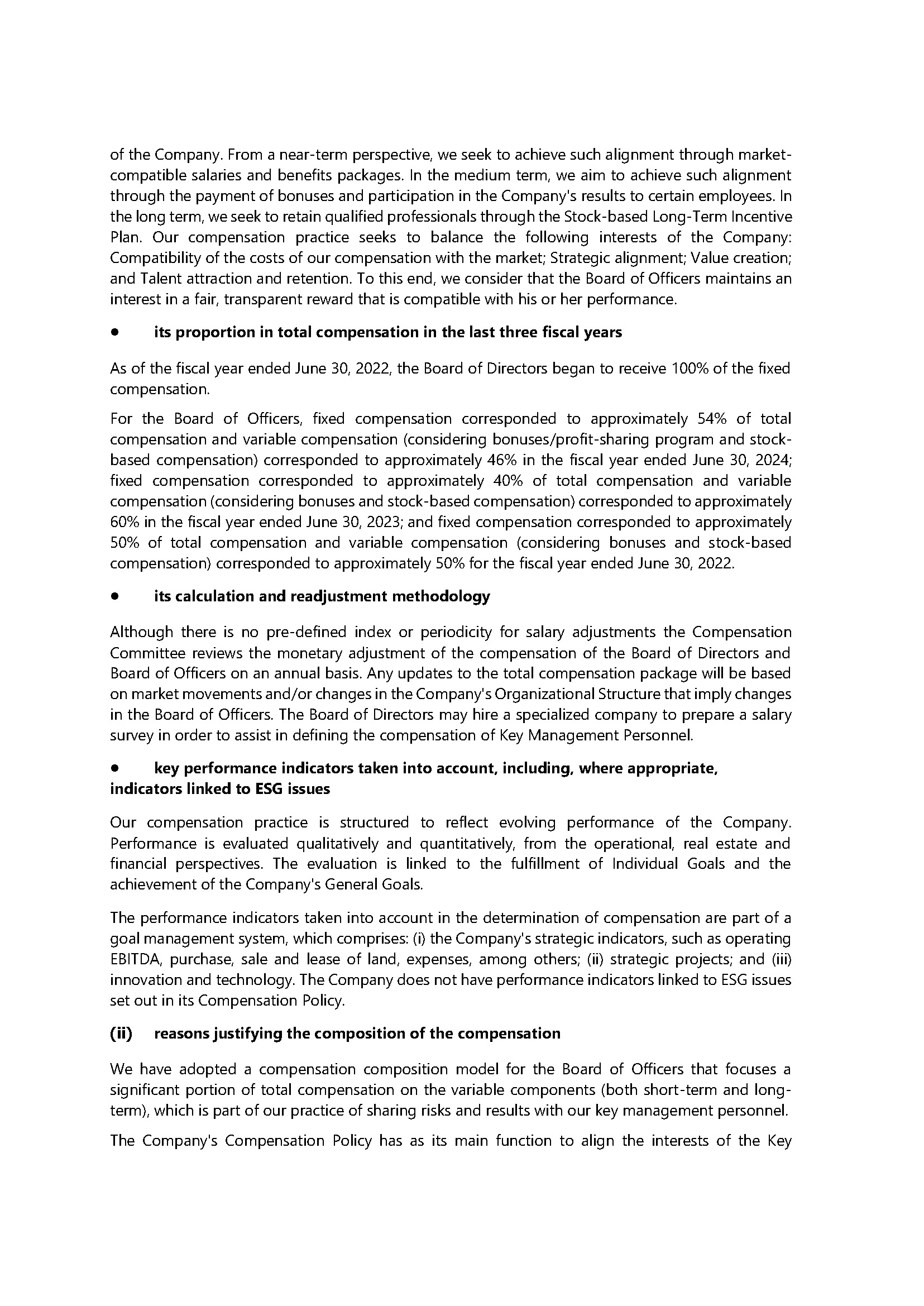 of the Company . From a near - term perspective, we seek to achieve such alignment through market - compatible salaries and benefits packages . In the medium term, we aim to achieve such alignment through the payment of bonuses and participation in the Company's results to certain employees . In the long term, we seek to retain qualified professionals through the Stock - based Long - Term Incentive Plan . Our compensation practice seeks to balance the following interests of the Company : Compatibility of the costs of our compensation with the market ; Strategic alignment ; Value creation ; and Talent attraction and retention . To this end, we consider that the Board of Officers maintains an interest in a fair, transparent reward that is compatible with his or her performance . • its proportion in total compensation in the last three fiscal years As of the fiscal year ended June 30 , 2022 , the Board of Directors began to receive 100 % of the fixed compensation . For the Board of Officers, fixed compensation corresponded to approximately 54 % of total compensation and variable compensation (considering bonuses/profit - sharing program and stock - based compensation) corresponded to approximately 46 % in the fiscal year ended June 30 , 2024 ; fixed compensation corresponded to approximately 40 % of total compensation and variable compensation (considering bonuses and stock - based compensation) corresponded to approximately 60 % in the fiscal year ended June 30 , 2023 ; and fixed compensation corresponded to approximately 50 % of total compensation and variable compensation (considering bonuses and stock - based compensation) corresponded to approximately 50 % for the fiscal year ended June 30 , 2022 . • its calculation and readjustment methodology Although there is no pre - defined index or periodicity for salary adjustments the Compensation Committee reviews the monetary adjustment of the compensation of the Board of Directors and Board of Officers on an annual basis . Any updates to the total compensation package will be based on market movements and/or changes in the Company's Organizational Structure that imply changes in the Board of Officers . The Board of Directors may hire a specialized company to prepare a salary survey in order to assist in defining the compensation of Key Management Personnel . • key performance indicators taken into account, including, where appropriate, indicators linked to ESG issues Our compensation practice is structured to reflect evolving performance of the Company . Performance is evaluated qualitatively and quantitatively, from the operational, real estate and financial perspectives . The evaluation is linked to the fulfillment of Individual Goals and the achievement of the Company's General Goals . The performance indicators taken into account in the determination of compensation are part of a goal management system, which comprises : (i) the Company's strategic indicators, such as operating EBITDA, purchase, sale and lease of land, expenses, among others ; (ii) strategic projects ; and (iii) innovation and technology . The Company does not have performance indicators linked to ESG issues set out in its Compensation Policy . (ii) reasons justifying the composition of the compensation We have adopted a compensation composition model for the Board of Officers that focuses a significant portion of total compensation on the variable components (both short - term and long - term), which is part of our practice of sharing risks and results with our key management personnel . The Company's Compensation Policy has as its main function to align the interests of the Key