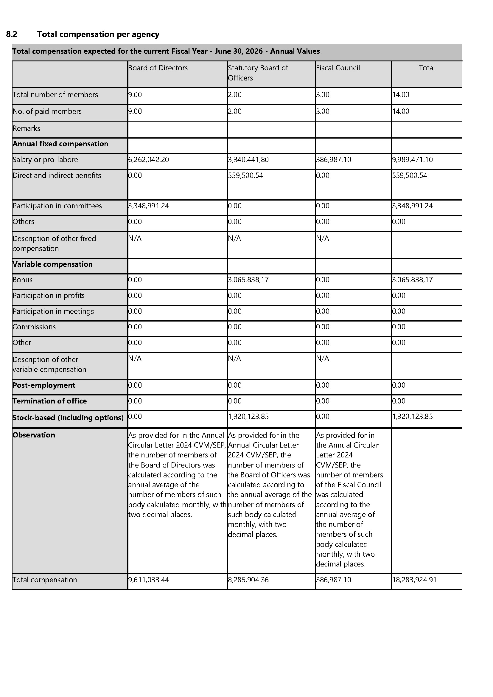8.2 Total compensation per agency Total compensation expected for the current Fiscal Year - June 30, 2026 - Annual Values Total Fiscal Council Statutory Board of Officers Board of Directors 14.00 3.00 2.00 9.00 Total number of members 14.00 3.00 2.00 9.00 No. of paid members Remarks Annual fixed compensation 9,989,471.10 386,987.10 3,340,441,80 6,262,042.20 Salary or pro - labore 559,500.54 0.00 559,500.54 0.00 Direct and indirect benefits 3,348,991.24 0.00 0.00 3,348,991.24 Participation in committees 0.00 0.00 0.00 0.00 Others N/A N/A N/A Description of other fixed compensation Variable compensation 3.065.838,17 0.00 3.065.838,17 0.00 Bonus 0.00 0.00 0.00 0.00 Participation in profits 0.00 0.00 0.00 0.00 Participation in meetings 0.00 0.00 0.00 0.00 Commissions 0.00 0.00 0.00 0.00 Other N/A N/A N/A Description of other variable compensation 0.00 0.00 0.00 0.00 Post - employment 0.00 0.00 0.00 0.00 Termination of office 1,320,123.85 0.00 1,320,123.85 0.00 Stock - based (including options) As provided for in the Annual Circular Letter 2024 CVM/SEP, the number of members of the Fiscal Council was calculated according to the annual average of the number of members of such body calculated monthly, with two decimal places. As provided for in the Annual Circular Letter 2024 CVM/SEP, the number of members of the Board of Officers was calculated according to the annual average of the number of members of such body calculated monthly, with two decimal places. As provided for in the Annual Circular Letter 2024 CVM/SEP, the number of members of the Board of Directors was calculated according to the annual average of the number of members of such body calculated monthly, with two decimal places. Observation 18,283,924.91 386,987.10 8,285,904.36 9,611,033.44 Total compensation