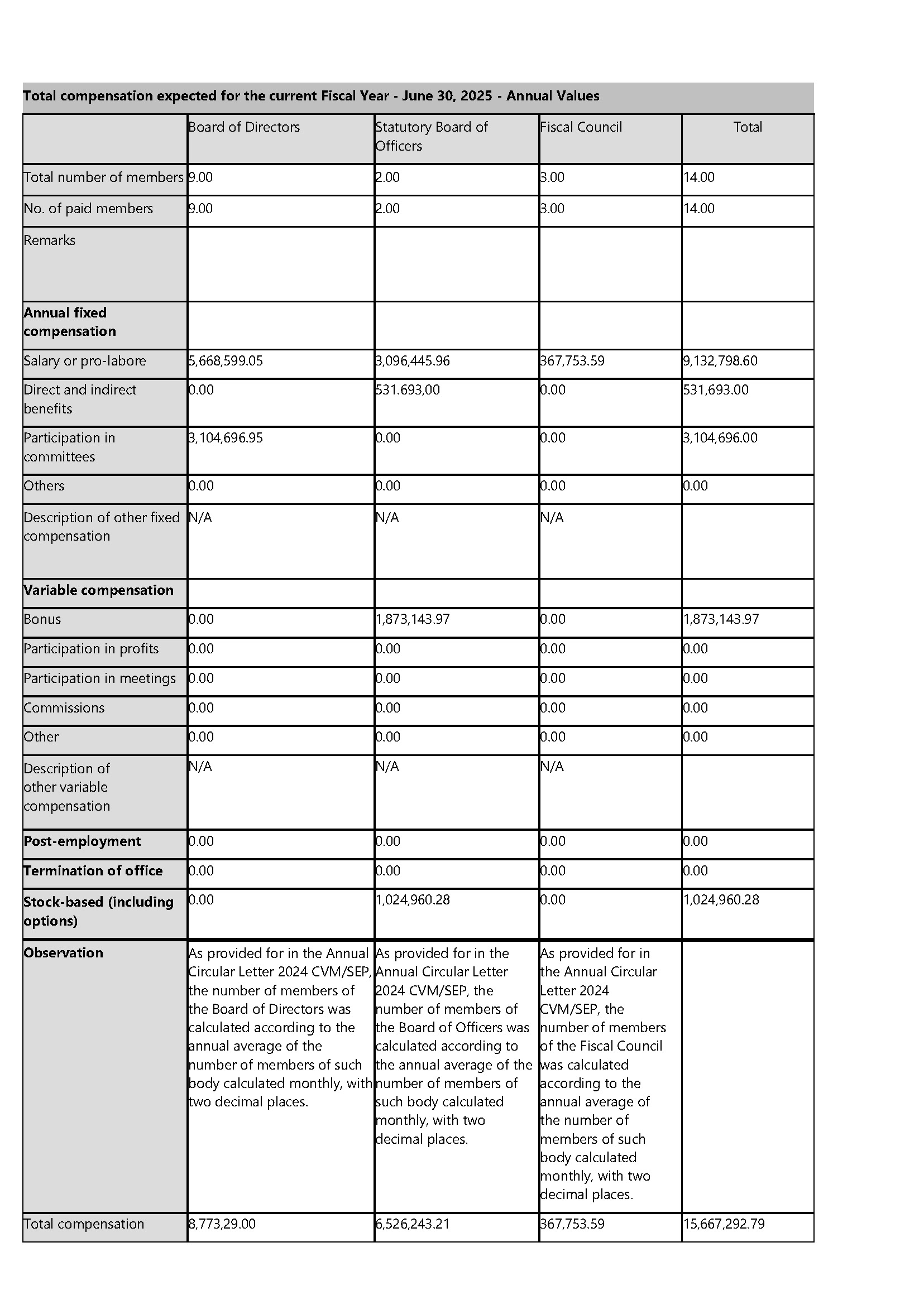 Total compensation expected for the current Fiscal Year - June 30, 2025 - Annual Values Total Fiscal Council Statutory Board of Officers Board of Directors 14.00 3.00 2.00 9.00 Total number of members 14.00 3.00 2.00 9.00 No. of paid members Remarks Annual fixed compensation 9,132,798.60 367,753.59 3,096,445.96 5,668,599.05 Salary or pro - labore 531,693.00 0.00 531.693,00 0.00 Direct and indirect benefits 3,104,696.00 0.00 0.00 3,104,696.95 Participation in committees 0.00 0.00 0.00 0.00 Others N/A N/A N/A Description of other fixed compensation Variable compensation 1,873,143.97 0.00 1,873,143.97 0.00 Bonus 0.00 0.00 0.00 0.00 Participation in profits 0.00 0.00 0.00 0.00 Participation in meetings 0.00 0.00 0.00 0.00 Commissions 0.00 0.00 0.00 0.00 Other N/A N/A N/A Description of other variable compensation 0.00 0.00 0.00 0.00 Post - employment 0.00 0.00 0.00 0.00 Termination of office 1,024,960.28 0.00 1,024,960.28 0.00 Stock - based (including options) As provided for in the Annual Circular Letter 2024 CVM/SEP, the number of members of the Fiscal Council was calculated according to the annual average of the number of members of such body calculated monthly, with two decimal places. As provided for in the Annual Circular Letter 2024 CVM/SEP, the number of members of the Board of Officers was calculated according to the annual average of the number of members of such body calculated monthly, with two decimal places. As provided for in the Annual Circular Letter 2024 CVM/SEP, the number of members of the Board of Directors was calculated according to the annual average of the number of members of such body calculated monthly, with two decimal places. Observation 15,667,292.79 367,753.59 6,526,243.21 8,773,29.00 Total compensation