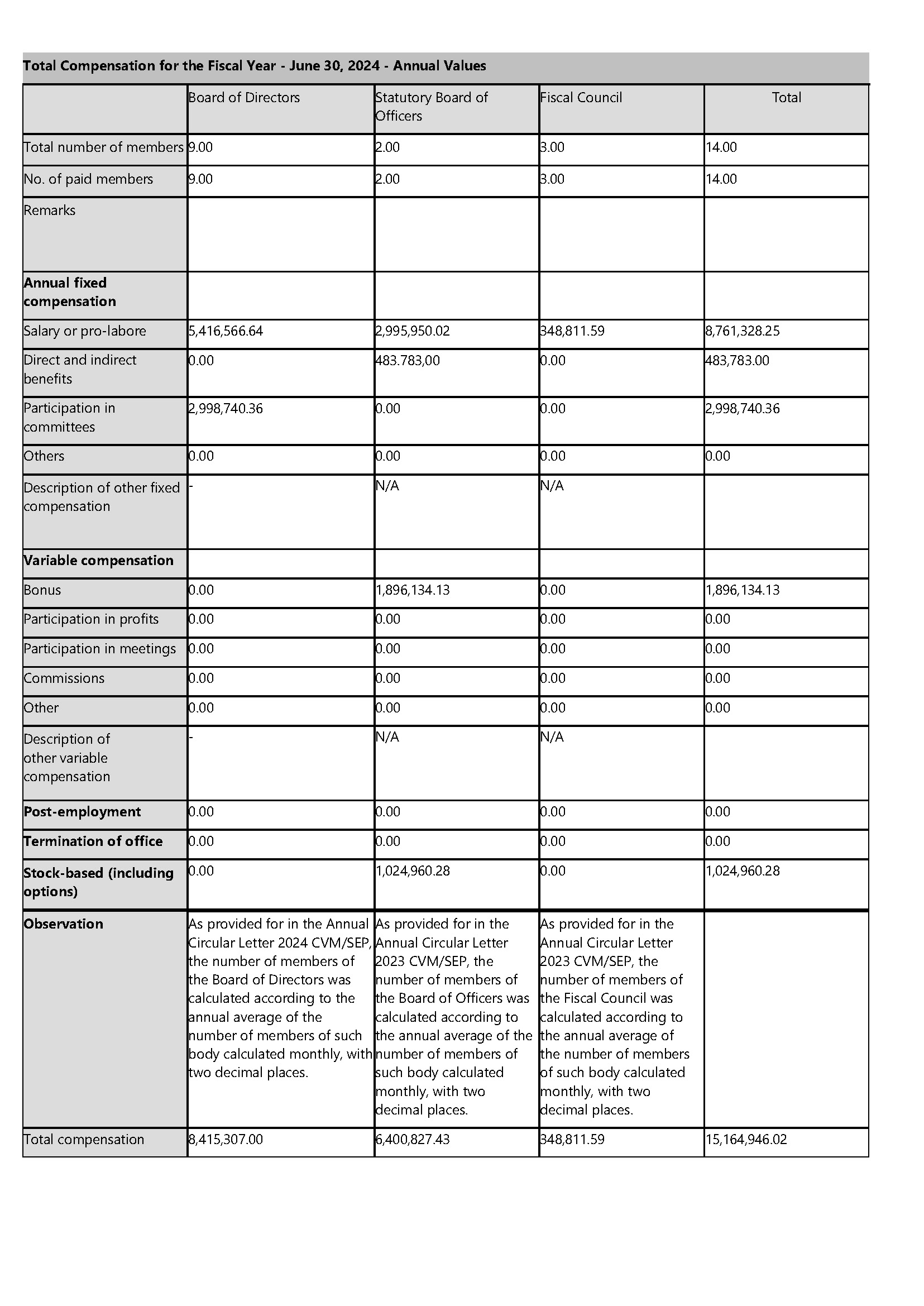 Total Compensation for the Fiscal Year - June 30, 2024 - Annual Values Total Fiscal Council Statutory Board of Officers Board of Directors 14.00 3.00 2.00 9.00 Total number of members 14.00 3.00 2.00 9.00 No. of paid members Remarks Annual fixed compensation 8,761,328.25 348,811.59 2,995,950.02 5,416,566.64 Salary or pro - labore 483,783.00 0.00 483.783,00 0.00 Direct and indirect benefits 2,998,740.36 0.00 0.00 2,998,740.36 Participation in committees 0.00 0.00 0.00 0.00 Others N/A N/A - Description of other fixed compensation Variable compensation 1,896,134.13 0.00 1,896,134.13 0.00 Bonus 0.00 0.00 0.00 0.00 Participation in profits 0.00 0.00 0.00 0.00 Participation in meetings 0.00 0.00 0.00 0.00 Commissions 0.00 0.00 0.00 0.00 Other N/A N/A - Description of other variable compensation 0.00 0.00 0.00 0.00 Post - employment 0.00 0.00 0.00 0.00 Termination of office 1,024,960.28 0.00 1,024,960.28 0.00 Stock - based (including options) As provided for in the Annual Circular Letter 2023 CVM/SEP, the number of members of the Fiscal Council was calculated according to the annual average of the number of members of such body calculated monthly, with two decimal places. As provided for in the Annual Circular Letter 2023 CVM/SEP, the number of members of the Board of Officers was calculated according to the annual average of the number of members of such body calculated monthly, with two decimal places. As provided for in the Annual Circular Letter 2024 CVM/SEP, the number of members of the Board of Directors was calculated according to the annual average of the number of members of such body calculated monthly, with two decimal places. Observation 15,164,946.02 348,811.59 6,400,827.43 8,415,307.00 Total compensation