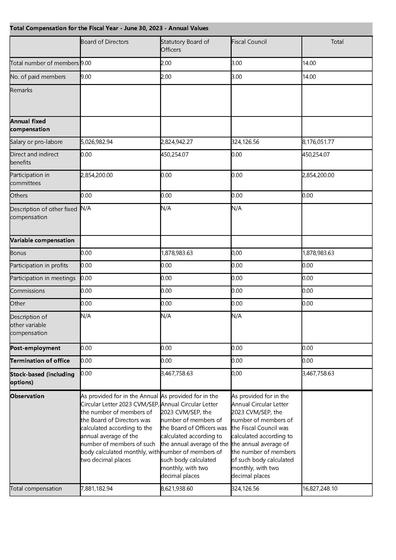 Total Compensation for the Fiscal Year - June 30, 2023 - Annual Values Total Fiscal Council Statutory Board of Officers Board of Directors 14.00 3.00 2.00 9.00 Total number of members 14.00 3.00 2.00 9.00 No. of paid members Remarks Annual fixed compensation 8,176,051.77 324,126.56 2,824,942.27 5,026,982.94 Salary or pro - labore 450,254.07 0.00 450,254.07 0.00 Direct and indirect benefits 2,854,200.00 0.00 0.00 2,854,200.00 Participation in committees 0.00 0.00 0.00 0.00 Others N/A N/A N/A Description of other fixed compensation Variable compensation 1,878,983.63 0,00 1,878,983.63 0.00 Bonus 0.00 0.00 0.00 0.00 Participation in profits 0.00 0.00 0.00 0.00 Participation in meetings 0.00 0.00 0.00 0.00 Commissions 0.00 0.00 0.00 0.00 Other N/A N/A N/A Description of other variable compensation 0.00 0.00 0.00 0.00 Post - employment 0.00 0.00 0.00 0.00 Termination of office 3,467,758.63 0,00 3,467,758.63 0.00 Stock - based (including options) As provided for in the Annual Circular Letter 2023 CVM/SEP, the number of members of the Fiscal Council was calculated according to the annual average of the number of members of such body calculated monthly, with two decimal places As provided for in the Annual Circular Letter 2023 CVM/SEP, the number of members of the Board of Officers was calculated according to the annual average of the number of members of such body calculated monthly, with two decimal places As provided for in the Annual Circular Letter 2023 CVM/SEP, the number of members of the Board of Directors was calculated according to the annual average of the number of members of such body calculated monthly, with two decimal places Observation 16,827,248.10 324,126.56 8,621,938.60 7,881,182.94 Total compensation