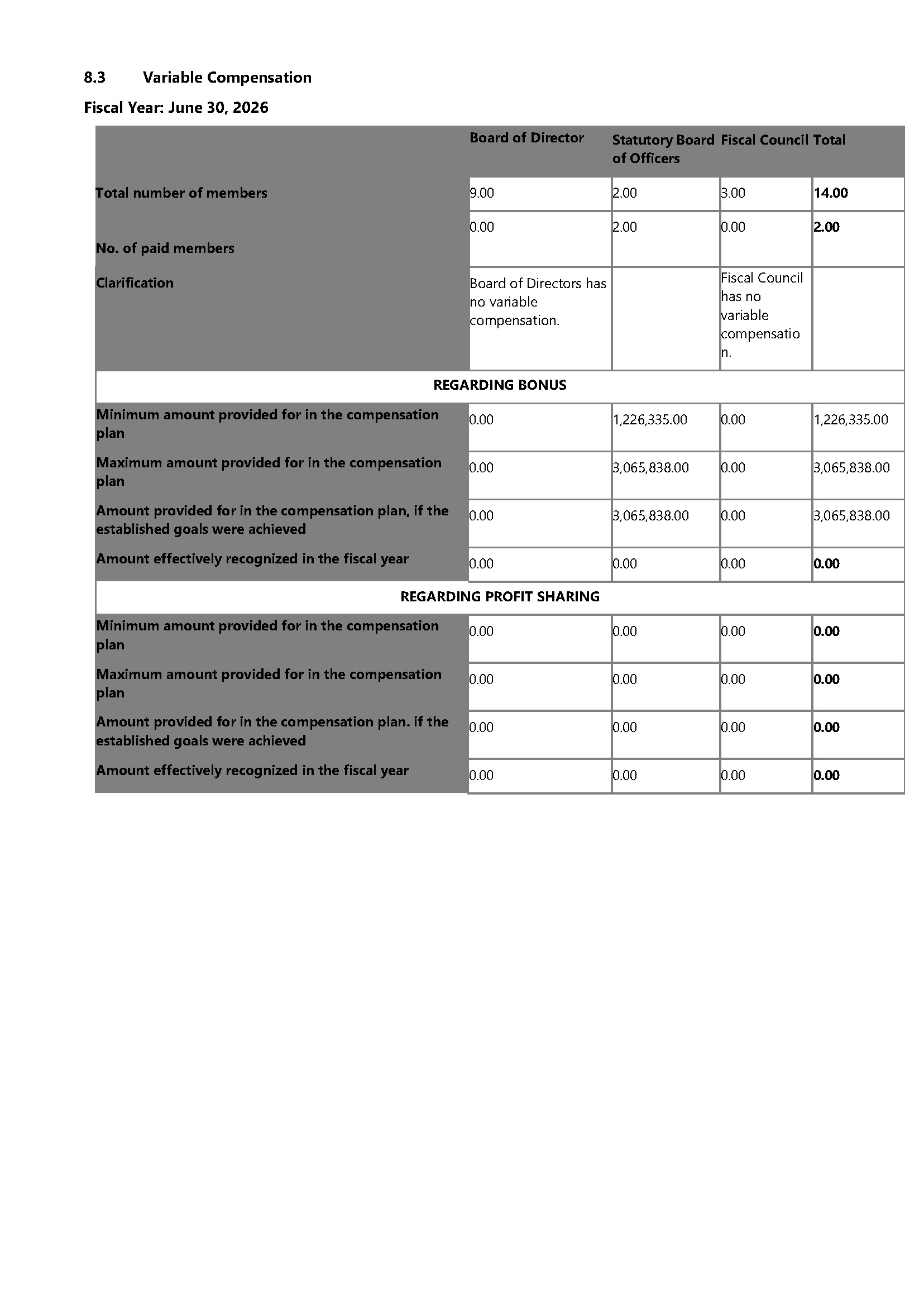 8.3 Variable Compensation Fiscal Year: June 30, 2026 Statutory Board Fiscal Council Total of Officers Board of Director 14.00 3.00 2.00 9.00 Total number of members 2.00 0.00 2.00 0.00 No. of paid members Fiscal Council has no variable compensatio n. Board of Directors has no variable compensation. Clarification REGARDING BONUS 1,226,335.00 0.00 1,226,335.00 0.00 Minimum amount provided for in the compensation plan Maximum amount provided for in the compensation plan Amount provided for in the compensation plan, if the established goals were achieved Amount effectively recognized in the fiscal year 3,065,838.00 0.00 3,065,838.00 0.00 3,065,838.00 0.00 3,065,838.00 0.00 0.00 0.00 0.00 0.00 REGARDING PROFIT SHARING 0.00 0.00 0.00 0.00 Minimum amount provided for in the compensation plan Maximum amount provided for in the compensation plan Amount provided for in the compensation plan. if the established goals were achieved Amount effectively recognized in the fiscal year 0.00 0.00 0.00 0.00 0.00 0.00 0.00 0.00 0.00 0.00 0.00 0.00