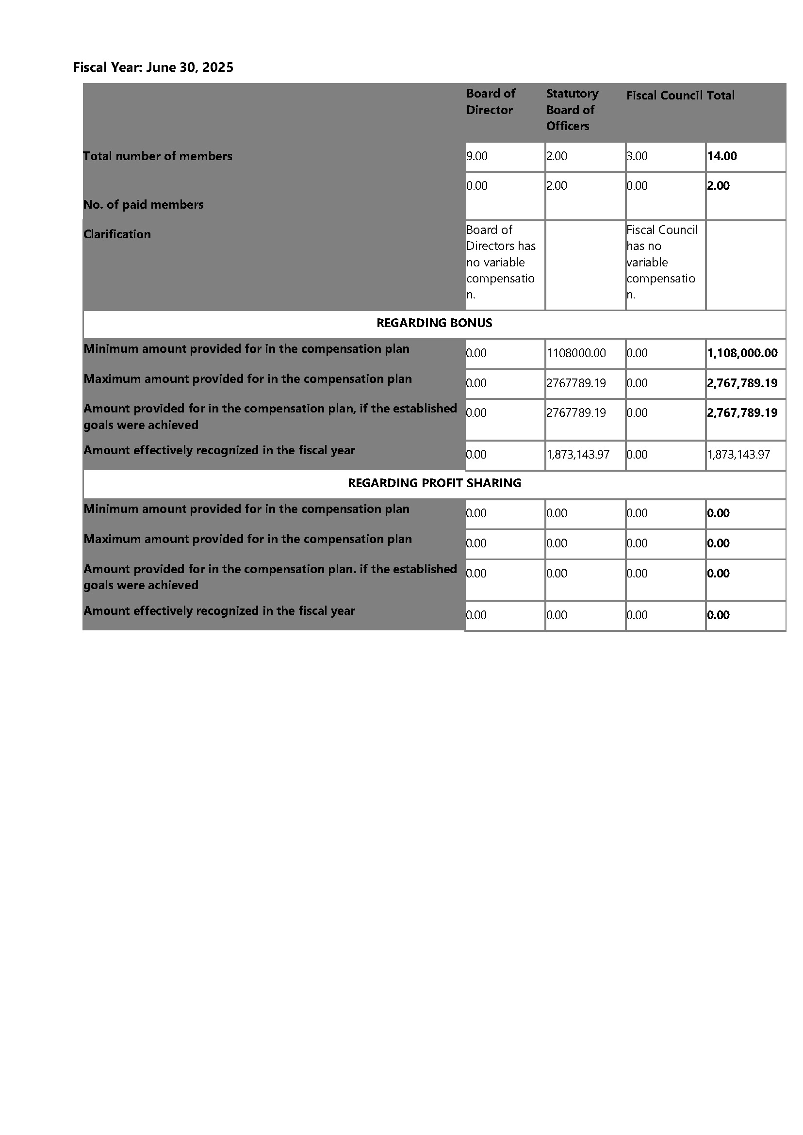 Fiscal Year: June 30, 2025 Fiscal Council Total Statutory Board of Officers Board of Director Total number of members No. of paid members Clarification 3.00 14.00 2.00 9.00 0.00 2.00 2.00 0.00 Board of Fiscal Council Directors has has no no variable variable compensatio compensatio n. n. REGARDING BONUS 1,108,000.00 0.00 1108000.00 0.00 Minimum amount provided for in the compensation plan Maximum amount provided for in the compensation plan Amount provided for in the compensation plan, if the established goals were achieved Amount effectively recognized in the fiscal year 2,767,789.19 0.00 2767789.19 0.00 2,767,789.19 0.00 2767789.19 0.00 1,873,143.97 0.00 1,873,143.97 0.00 REGARDING PROFIT SHARING 0.00 0.00 0.00 0.00 Minimum amount provided for in the compensation plan Maximum amount provided for in the compensation plan Amount provided for in the compensation plan. if the established goals were achieved Amount effectively recognized in the fiscal year 0.00 0.00 0.00 0.00 0.00 0.00 0.00 0.00 0.00 0.00 0.00 0.00