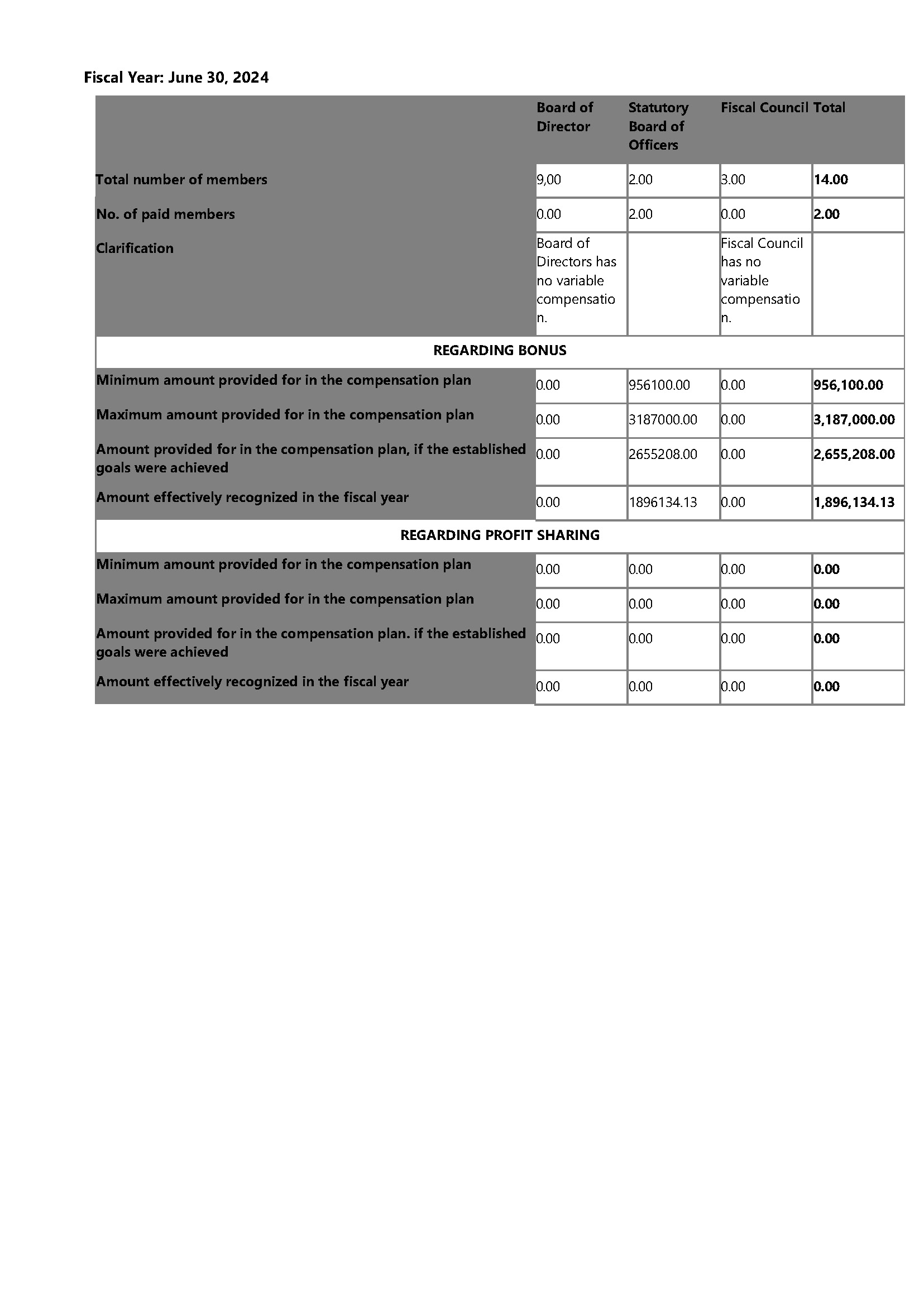 Fiscal Year: June 30, 2024 Fiscal Council Total Statutory Board of Officers Board of Director Total number of members No. of paid members Clarification 3.00 14.00 2.00 9,00 0.00 2.00 2.00 0.00 Board of Fiscal Council Directors has has no no variable variable compensatio compensatio n. n. REGARDING BONUS 956,100.00 0.00 956100.00 0.00 Minimum amount provided for in the compensation plan Maximum amount provided for in the compensation plan Amount provided for in the compensation plan, if the established goals were achieved Amount effectively recognized in the fiscal year 3,187,000.00 0.00 3187000.00 0.00 2,655,208.00 0.00 2655208.00 0.00 1,896,134.13 0.00 1896134.13 0.00 REGARDING PROFIT SHARING 0.00 0.00 0.00 0.00 Minimum amount provided for in the compensation plan Maximum amount provided for in the compensation plan Amount provided for in the compensation plan. if the established goals were achieved Amount effectively recognized in the fiscal year 0.00 0.00 0.00 0.00 0.00 0.00 0.00 0.00 0.00 0.00 0.00 0.00