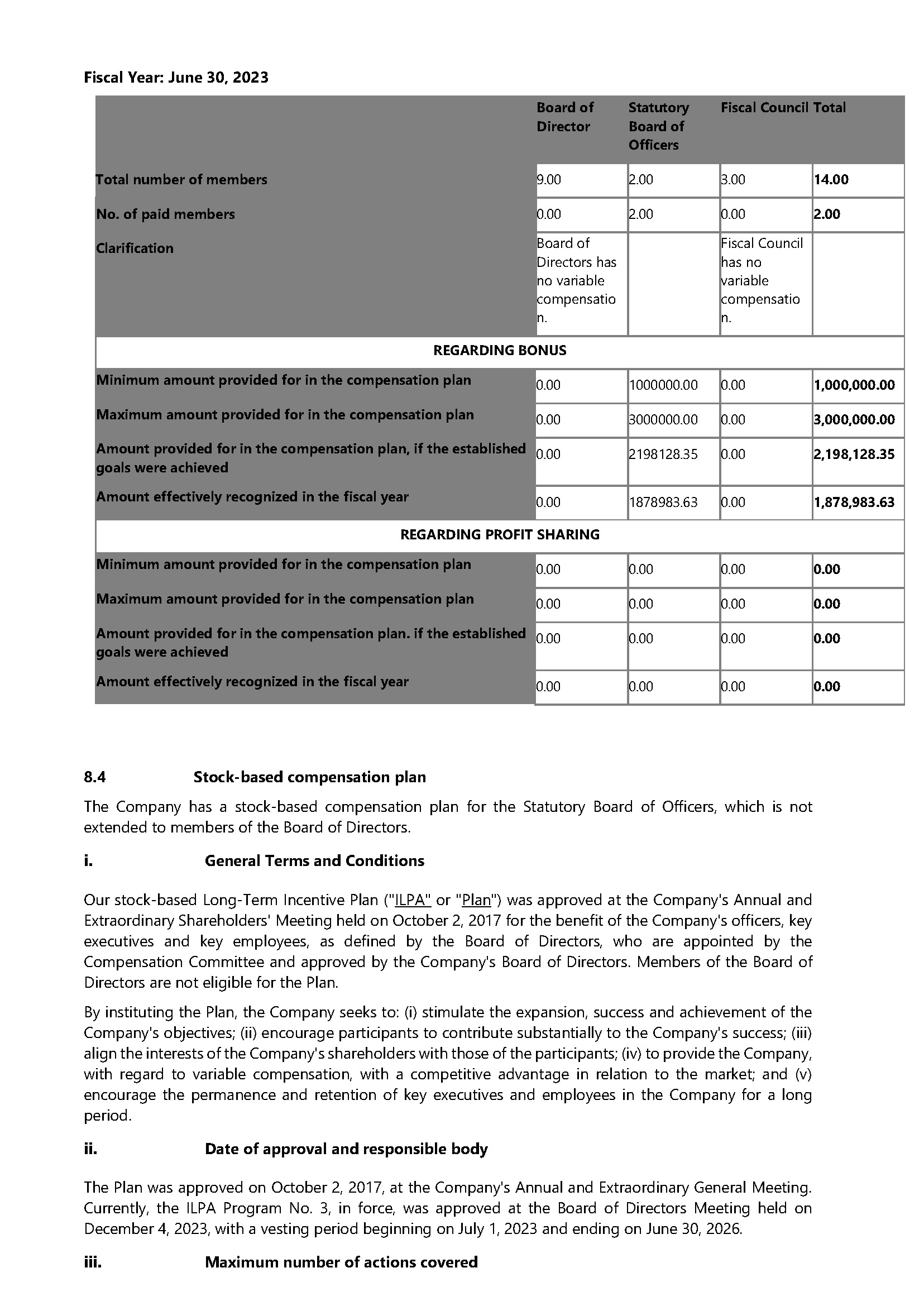 Fiscal Year: June 30, 2023 Fiscal Council Total Statutory Board of Officers Board of Director Total number of members No. of paid members Clarification 14.00 3.00 2.00 9.00 2.00 0.00 2.00 0.00 Board of Fiscal Council Directors has has no no variable variable compensatio compensatio n. n. REGARDING BONUS 1,000,000.00 0.00 1000000.00 0.00 Minimum amount provided for in the compensation plan Maximum amount provided for in the compensation plan Amount provided for in the compensation plan, if the established goals were achieved Amount effectively recognized in the fiscal year 3,000,000.00 0.00 3000000.00 0.00 2,198,128.35 0.00 2198128.35 0.00 1,878,983.63 0.00 1878983.63 0.00 REGARDING PROFIT SHARING 0.00 0.00 0.00 0.00 Minimum amount provided for in the compensation plan Maximum amount provided for in the compensation plan Amount provided for in the compensation plan. if the established goals were achieved Amount effectively recognized in the fiscal year 0.00 0.00 0.00 0.00 0.00 0.00 0.00 0.00 0.00 0.00 0.00 0.00 8.4 Stock - based compensation plan The Company has a stock - based compensation plan for the Statutory Board of Officers, which is not extended to members of the Board of Directors . i. General Terms and Conditions Our stock - based Long - Term Incentive Plan (" ILPA" or " Plan ") was approved at the Company's Annual and Extraordinary Shareholders' Meeting held on October 2 , 2017 for the benefit of the Company's officers, key executives and key employees, as defined by the Board of Directors, who are appointed by the Compensation Committee and approved by the Company's Board of Directors . Members of the Board of Directors are not eligible for the Plan . By instituting the Plan, the Company seeks to : (i) stimulate the expansion, success and achievement of the Company's objectives ; (ii) encourage participants to contribute substantially to the Company's success ; (iii) align the interests of the Company's shareholders with those of the participants ; (iv) to provide the Company, with regard to variable compensation, with a competitive advantage in relation to the market ; and (v) encourage the permanence and retention of key executives and employees in the Company for a long period . ii. Date of approval and responsible body The Plan was approved on October 2 , 2017 , at the Company's Annual and Extraordinary General Meeting . Currently, the ILPA Program No . 3 , in force, was approved at the Board of Directors Meeting held on December 4 , 2023 , with a vesting period beginning on July 1 , 2023 and ending on June 30 , 2026 . iii. Maximum number of actions covered