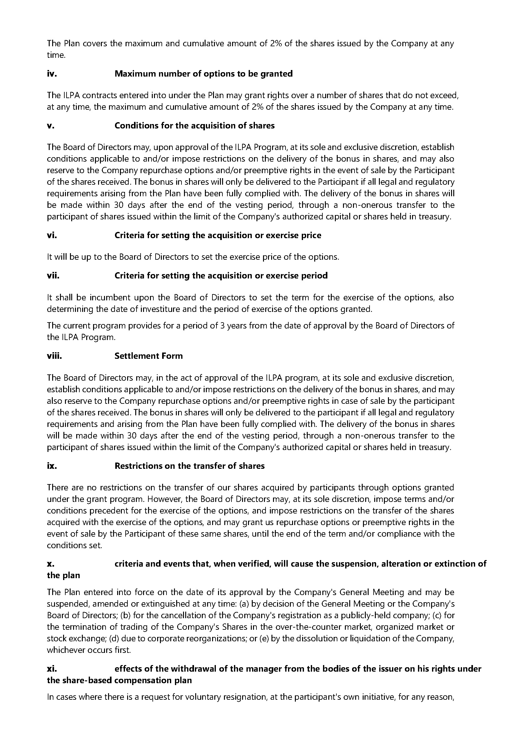The Plan covers the maximum and cumulative amount of 2 % of the shares issued by the Company at any time . iv. Maximum number of options to be granted The ILPA contracts entered into under the Plan may grant rights over a number of shares that do not exceed, at any time, the maximum and cumulative amount of 2 % of the shares issued by the Company at any time . v. Conditions for the acquisition of shares The Board of Directors may, upon approval of the ILPA Program, at its sole and exclusive discretion, establish conditions applicable to and/or impose restrictions on the delivery of the bonus in shares, and may also reserve to the Company repurchase options and/or preemptive rights in the event of sale by the Participant of the shares received . The bonus in shares will only be delivered to the Participant if all legal and regulatory requirements arising from the Plan have been fully complied with . The delivery of the bonus in shares will be made within 30 days after the end of the vesting period, through a non - onerous transfer to the participant of shares issued within the limit of the Company's authorized capital or shares held in treasury . vi. Criteria for setting the acquisition or exercise price It will be up to the Board of Directors to set the exercise price of the options . vii. Criteria for setting the acquisition or exercise period It shall be incumbent upon the Board of Directors to set the term for the exercise of the options, also determining the date of investiture and the period of exercise of the options granted . The current program provides for a period of 3 years from the date of approval by the Board of Directors of the ILPA Program . viii. Settlement Form The Board of Directors may, in the act of approval of the ILPA program, at its sole and exclusive discretion, establish conditions applicable to and/or impose restrictions on the delivery of the bonus in shares, and may also reserve to the Company repurchase options and/or preemptive rights in case of sale by the participant of the shares received . The bonus in shares will only be delivered to the participant if all legal and regulatory requirements and arising from the Plan have been fully complied with . The delivery of the bonus in shares will be made within 30 days after the end of the vesting period, through a non - onerous transfer to the participant of shares issued within the limit of the Company's authorized capital or shares held in treasury . ix. Restrictions on the transfer of shares There are no restrictions on the transfer of our shares acquired by participants through options granted under the grant program . However, the Board of Directors may, at its sole discretion, impose terms and/or conditions precedent for the exercise of the options, and impose restrictions on the transfer of the shares acquired with the exercise of the options, and may grant us repurchase options or preemptive rights in the event of sale by the Participant of these same shares, until the end of the term and/or compliance with the conditions set . x. criteria and events that, when verified, will cause the suspension, alteration or extinction of the plan The Plan entered into force on the date of its approval by the Company's General Meeting and may be suspended, amended or extinguished at any time : (a) by decision of the General Meeting or the Company's Board of Directors ; (b) for the cancellation of the Company's registration as a publicly - held company ; (c) for the termination of trading of the Company's Shares in the over - the - counter market, organized market or stock exchange ; (d) due to corporate reorganizations ; or (e) by the dissolution or liquidation of the Company, whichever occurs first . xi. effects of the withdrawal of the manager from the bodies of the issuer on his rights under the share - based compensation plan In cases where there is a request for voluntary resignation, at the participant's own initiative, for any reason,
