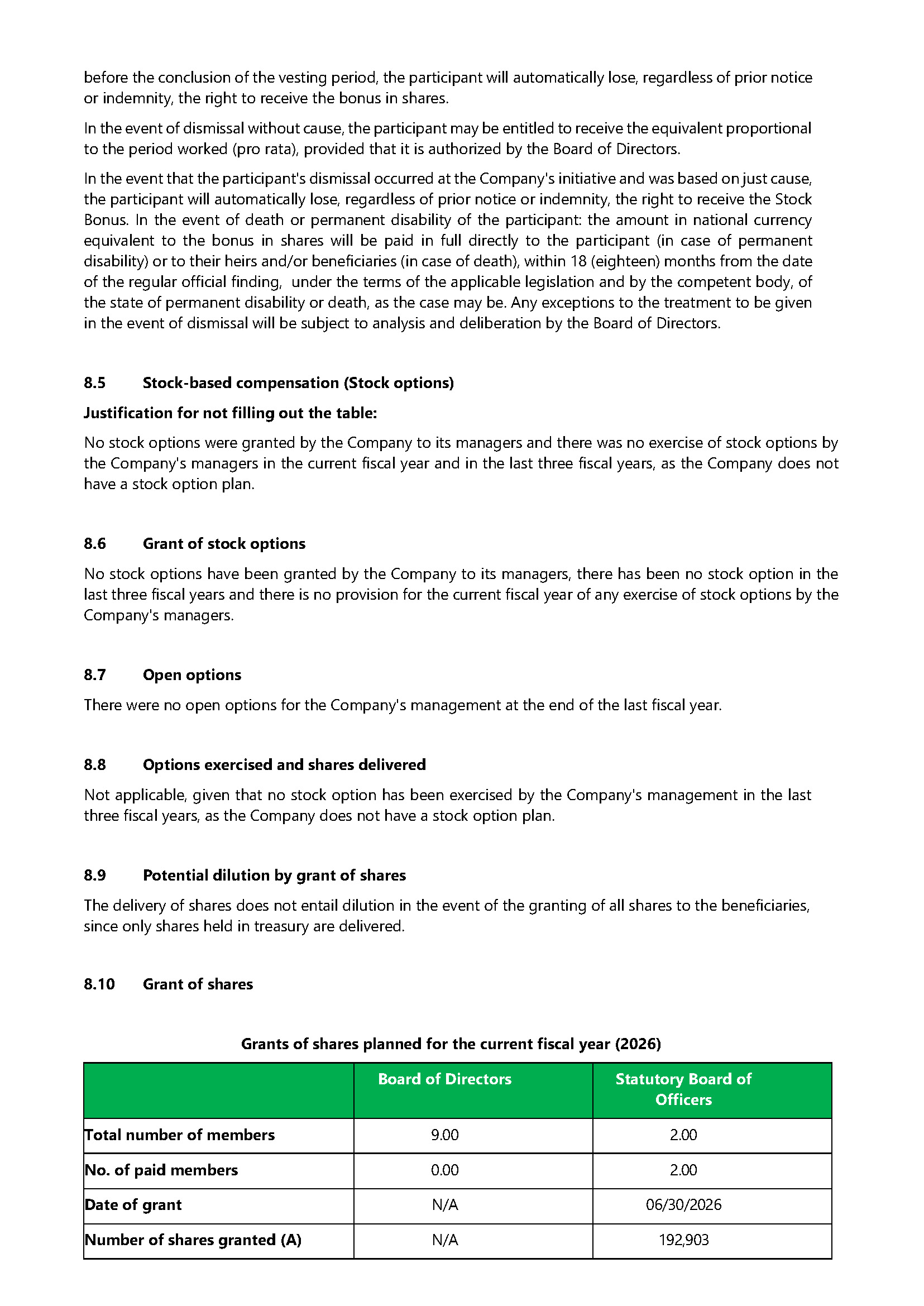 before the conclusion of the vesting period, the participant will automatically lose, regardless of prior notice or indemnity, the right to receive the bonus in shares . In the event of dismissal without cause, the participant may be entitled to receive the equivalent proportional to the period worked (pro rata), provided that it is authorized by the Board of Directors . In the event that the participant's dismissal occurred at the Company's initiative and was based on just cause, the participant will automatically lose, regardless of prior notice or indemnity, the right to receive the Stock Bonus . In the event of death or permanent disability of the participant : the amount in national currency equivalent to the bonus in shares will be paid in full directly to the participant (in case of permanent disability) or to their heirs and/or beneficiaries (in case of death), within 18 (eighteen) months from the date of the regular official finding, under the terms of the applicable legislation and by the competent body, of the state of permanent disability or death, as the case may be . Any exceptions to the treatment to be given in the event of dismissal will be subject to analysis and deliberation by the Board of Directors . 5. Stock - based compensation (Stock options) Justification for not filling out the table : No stock options were granted by the Company to its managers and there was no exercise of stock options by the Company's managers in the current fiscal year and in the last three fiscal years, as the Company does not have a stock option plan . 6. Grant of stock options No stock options have been granted by the Company to its managers, there has been no stock option in the last three fiscal years and there is no provision for the current fiscal year of any exercise of stock options by the Company's managers . 7. Open options There were no open options for the Company's management at the end of the last fiscal year . 8. Options exercised and shares delivered Not applicable, given that no stock option has been exercised by the Company's management in the last three fiscal years, as the Company does not have a stock option plan . 9. Potential dilution by grant of shares The delivery of shares does not entail dilution in the event of the granting of all shares to the beneficiaries, since only shares held in treasury are delivered . 10. Grant of shares Grants of shares planned for the current fiscal year (2026) Statutory Board of Officers Board of Directors 2.00 9.00 Total number of members 2.00 0.00 No. of paid members 06/30/2026 N/A Date of grant 192,903 N/A Number of shares granted (A)