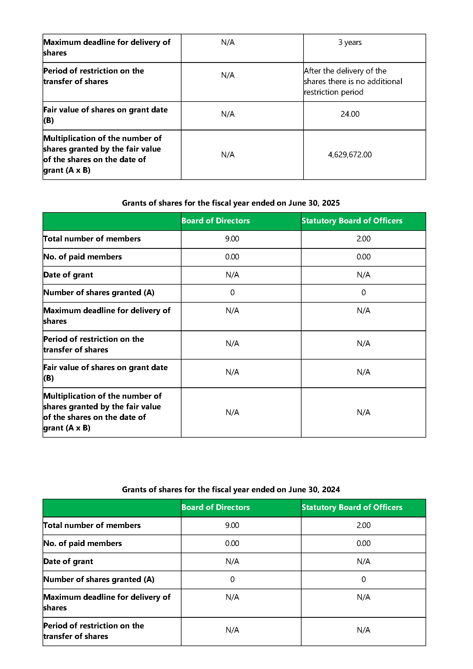 3 years N/A Maximum deadline for delivery of shares After the delivery of the shares there is no additional restriction period N/A Period of restriction on the transfer of shares 24.00 N/A Fair value of shares on grant date (B) 4,629,672.00 N/A Multiplication of the number of shares granted by the fair value of the shares on the date of grant (A x B) Grants of shares for the fiscal year ended on June 30, 2025 Statutory Board of Officers Board of Directors 2.00 9.00 Total number of members 0.00 0.00 No. of paid members N/A N/A Date of grant 0 0 Number of shares granted (A) N/A N/A Maximum deadline for delivery of shares N/A N/A Period of restriction on the transfer of shares N/A N/A Fair value of shares on grant date (B) N/A N/A Multiplication of the number of shares granted by the fair value of the shares on the date of grant (A x B) Grants of shares for the fiscal year ended on June 30, 2024 Statutory Board of Officers Board of Directors 2.00 9.00 Total number of members 0.00 0.00 No. of paid members N/A N/A Date of grant 0 0 Number of shares granted (A) N/A N/A Maximum deadline for delivery of shares N/A N/A Period of restriction on the transfer of shares