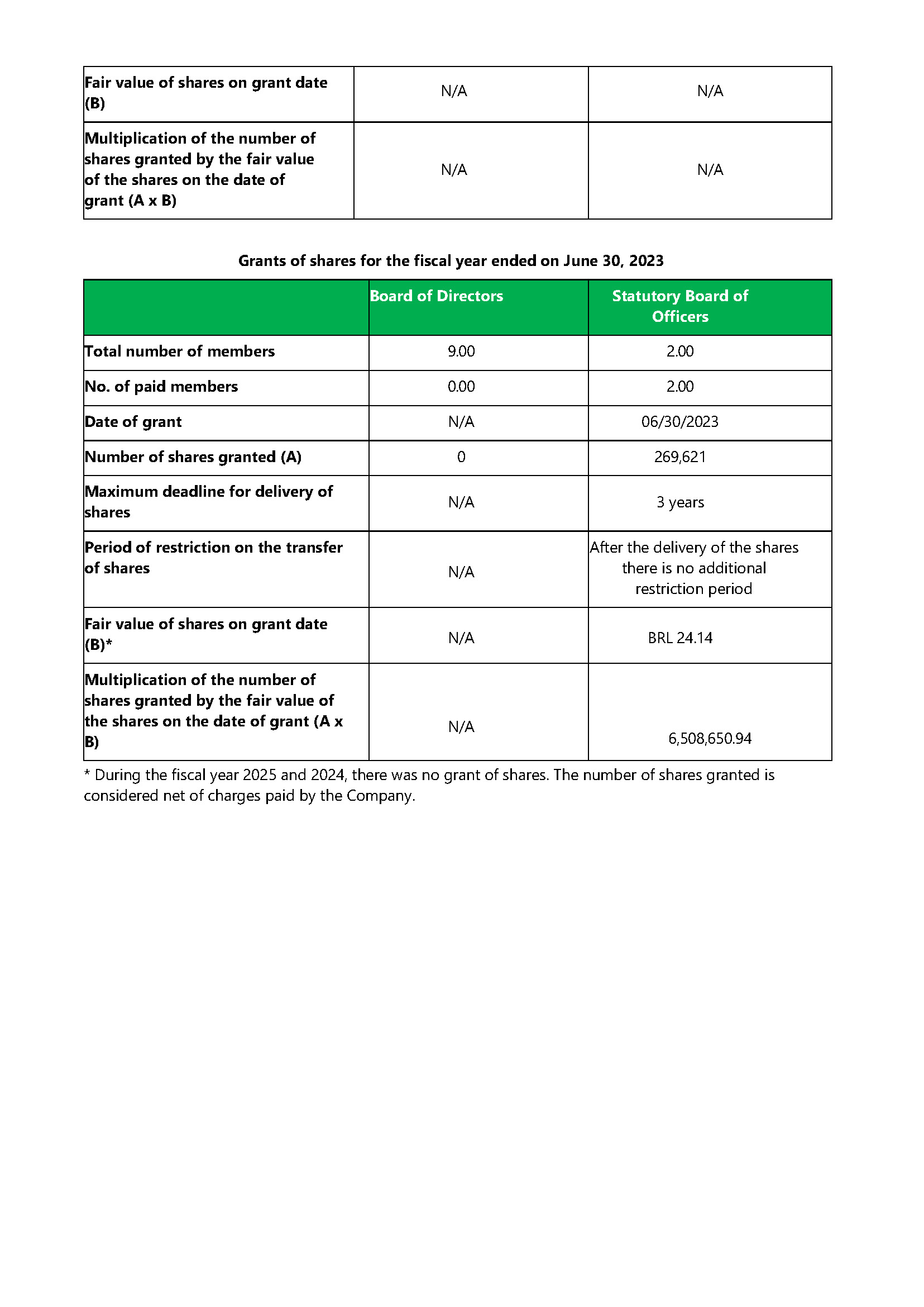 N/A N/A Fair value of shares on grant date (B) N/A N/A Multiplication of the number of shares granted by the fair value of the shares on the date of grant (A x B) Grants of shares for the fiscal year ended on June 30, 2023 Statutory Board of Officers Board of Directors 2.00 9.00 Total number of members 2.00 0.00 No. of paid members 06/30/2023 N/A Date of grant 269,621 0 Number of shares granted (A) 3 years N/A Maximum deadline for delivery of shares After the delivery of the shares there is no additional restriction period N/A Period of restriction on the transfer of shares BRL 24.14 N/A Fair value of shares on grant date (B)* 6,508,650.94 N/A Multiplication of the number of shares granted by the fair value of the shares on the date of grant (A x B) * During the fiscal year 2025 and 2024, there was no grant of shares. The number of shares granted is considered net of charges paid by the Company.