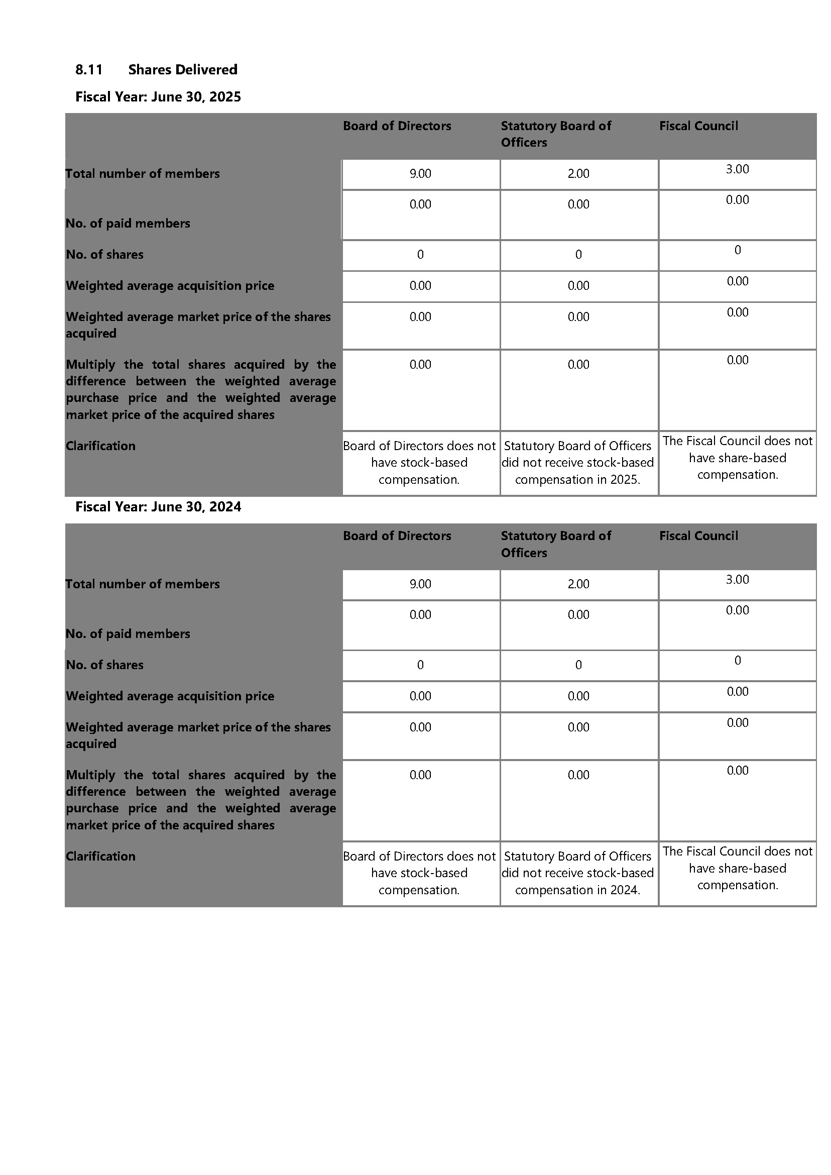 8.11 Shares Delivered Fiscal Year: June 30, 2025 Fiscal Council Statutory Board of Officers Board of Directors 3.00 2.00 9.00 Total number of members No. of paid members 0.00 0.00 0.00 0 0 0 No. of shares 0.00 0.00 0.00 Weighted average acquisition price 0.00 0.00 0.00 Weighted average market price of the shares acquired 0.00 0.00 0.00 Multiply the total shares acquired by the difference between the weighted average purchase price and the weighted average market price of the acquired shares The Fiscal Council does not have share - based compensation. Statutory Board of Officers did not receive stock - based compensation in 2025. Board of Directors does not have stock - based compensation. Clarification Fiscal Year: June 30, 2024 Fiscal Council Statutory Board of Officers Board of Directors 3.00 2.00 9.00 Total number of members No. of paid members 0.00 0.00 0.00 0 0 0 No. of shares 0.00 0.00 0.00 Weighted average acquisition price 0.00 0.00 0.00 Weighted average market price of the shares acquired 0.00 0.00 0.00 Multiply the total shares acquired by the difference between the weighted average purchase price and the weighted average market price of the acquired shares The Fiscal Council does not have share - based compensation. Statutory Board of Officers did not receive stock - based compensation in 2024. Board of Directors does not have stock - based compensation. Clarification