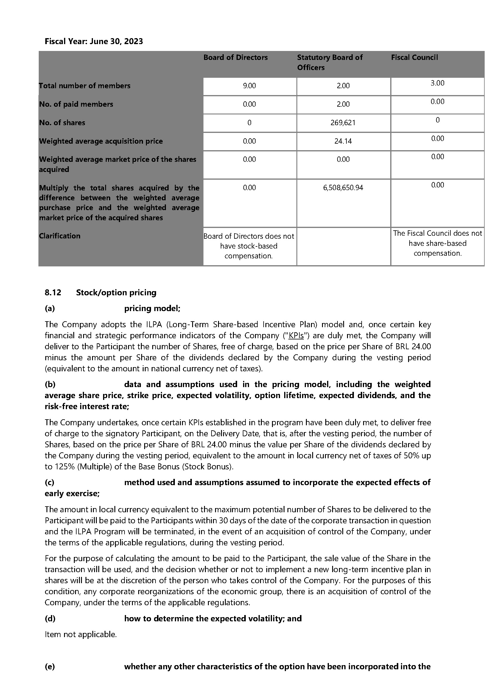Fiscal Year: June 30, 2023 Fiscal Council Statutory Board of Officers Board of Directors 3.00 2.00 9.00 Total number of members 0.00 2.00 0.00 No. of paid members 0 269,621 0 No. of shares 0.00 24.14 0.00 Weighted average acquisition price 0.00 0.00 0.00 Weighted average market price of the shares acquired 0.00 6,508,650.94 0.00 Multiply the total shares acquired by the difference between the weighted average purchase price and the weighted average market price of the acquired shares The Fiscal Council does not have share - based compensation. Board of Directors does not have stock - based compensation. Clarification 8 . 12 Stock/option pricing (a) pricing model ; The Company adopts the ILPA (Long - Term Share - based Incentive Plan) model and, once certain key financial and strategic performance indicators of the Company (" KPIs ") are duly met, the Company will deliver to the Participant the number of Shares, free of charge, based on the price per Share of BRL 24 . 00 minus the amount per Share of the dividends declared by the Company during the vesting period (equivalent to the amount in national currency net of taxes) . (b) data and assumptions used in the pricing model, including the weighted average share price, strike price, expected volatility, option lifetime, expected dividends, and the risk - free interest rate ; The Company undertakes, once certain KPIs established in the program have been duly met, to deliver free of charge to the signatory Participant, on the Delivery Date, that is, after the vesting period, the number of Shares, based on the price per Share of BRL 24 . 00 minus the value per Share of the dividends declared by the Company during the vesting period, equivalent to the amount in local currency net of taxes of 50 % up to 125 % (Multiple) of the Base Bonus (Stock Bonus) . (c) method used and assumptions assumed to incorporate the expected effects of early exercise ; The amount in local currency equivalent to the maximum potential number of Shares to be delivered to the Participant will be paid to the Participants within 30 days of the date of the corporate transaction in question and the ILPA Program will be terminated, in the event of an acquisition of control of the Company, under the terms of the applicable regulations, during the vesting period . For the purpose of calculating the amount to be paid to the Participant, the sale value of the Share in the transaction will be used, and the decision whether or not to implement a new long - term incentive plan in shares will be at the discretion of the person who takes control of the Company . For the purposes of this condition, any corporate reorganizations of the economic group, there is an acquisition of control of the Company, under the terms of the applicable regulations . (d) how to determine the expected volatility ; and Item not applicable . (e) whether any other characteristics of the option have been incorporated into the