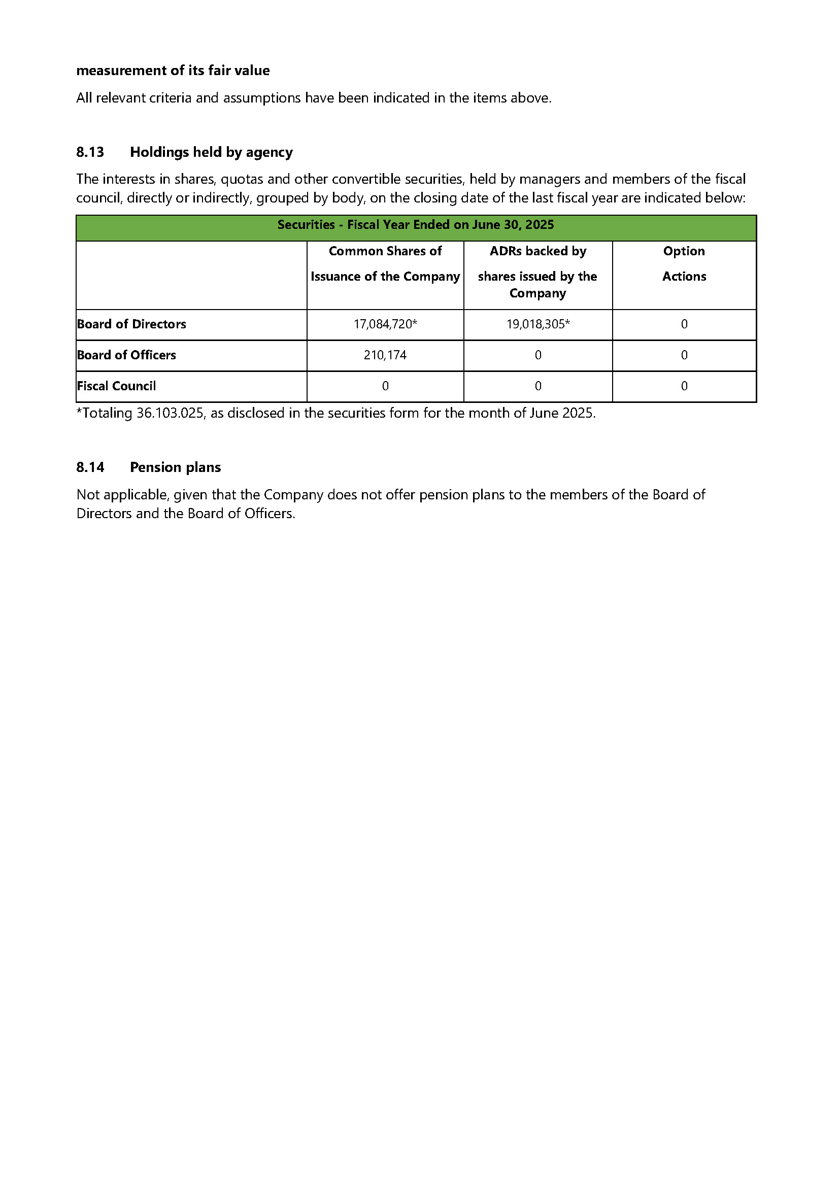 measurement of its fair value All relevant criteria and assumptions have been indicated in the items above. 8.13 Holdings held by agency The interests in shares, quotas and other convertible securities, held by managers and members of the fiscal council, directly or indirectly, grouped by body, on the closing date of the last fiscal year are indicated below: Securities - Fiscal Year Ended on June 30, 2025 Option Actions ADRs backed by shares issued by the Company Common Shares of Issuance of the Company 0 19,018,305* 17,084,720* Board of Directors 0 0 210,174 Board of Officers 0 0 0 Fiscal Council *Totaling 36.103.025, as disclosed in the securities form for the month of June 2025. 8.14 Pension plans Not applicable, given that the Company does not offer pension plans to the members of the Board of Directors and the Board of Officers.