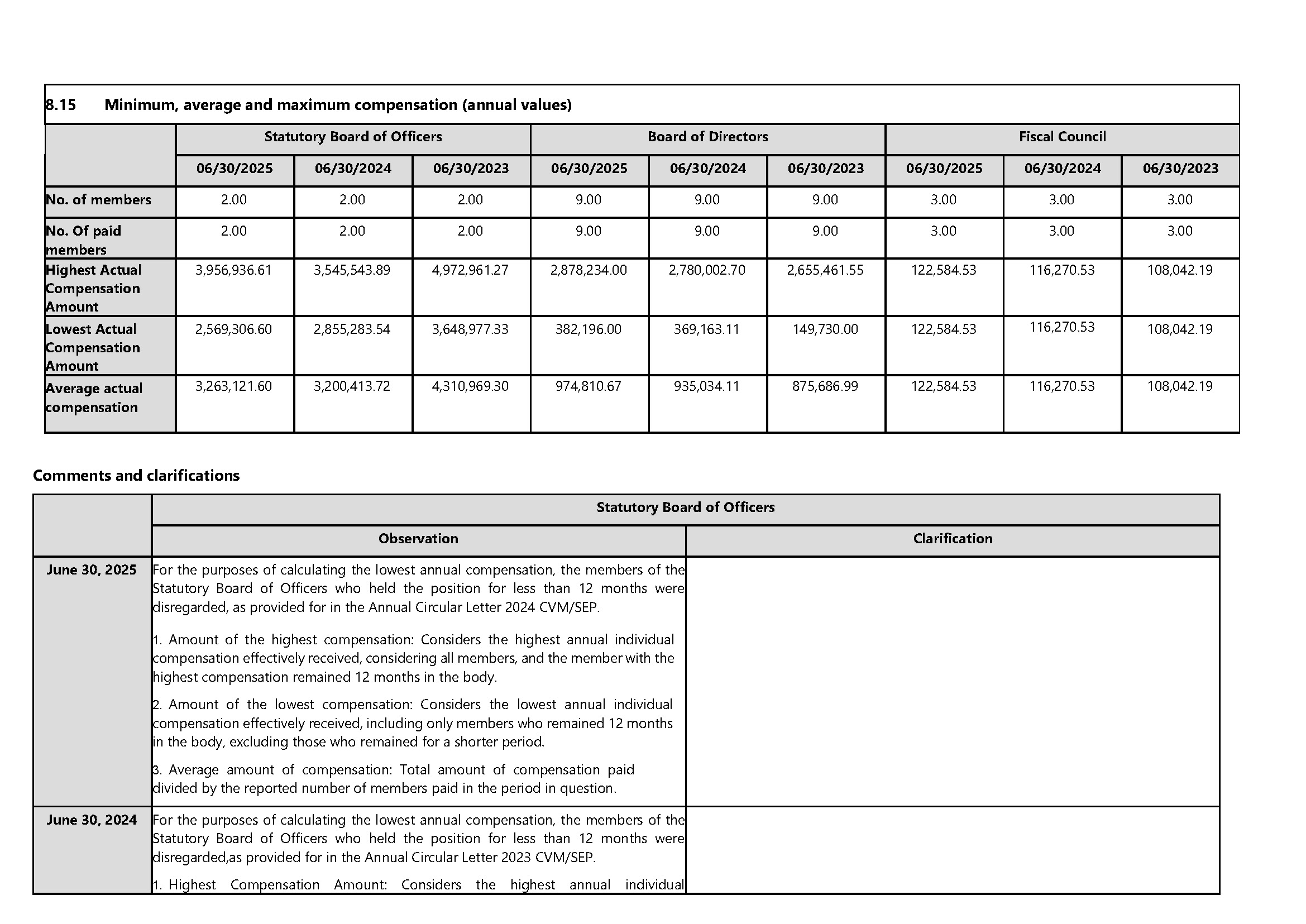 8.15 Minimum, average and maximum compensation (annual values) Fiscal Council Board of Directors Statutory Board of Officers 06/30/2023 06/30/2024 06/30/2025 06/30/2023 06/30/2024 06/30/2025 06/30/2023 06/30/2024 06/30/2025 3.00 3.00 3.00 9.00 9.00 9.00 2.00 2.00 2.00 No. of members 3.00 3.00 3.00 9.00 9.00 9.00 2.00 2.00 2.00 No. Of paid members 108,042.19 116,270.53 122,584.53 2,655,461.55 2,780,002.70 2,878,234.00 4,972,961.27 3,545,543.89 3,956,936.61 Highest Actual Compensation Amount 108,042.19 116,270.53 122,584.53 149,730.00 369,163.11 382,196.00 3,648,977.33 2,855,283.54 2,569,306.60 Lowest Actual Compensation Amount 108,042.19 116,270.53 122,584.53 875,686.99 935,034.11 974,810.67 4,310,969.30 3,200,413.72 3,263,121.60 Average actual compensation Comments and clarifications Statutory Board of Officers Clarification Observation For the purposes of calculating the lowest annual compensation, the members of the Statutory Board of Officers who held the position for less than 12 months were disregarded, as provided for in the Annual Circular Letter 2024 CVM/SEP . 1. Amount of the highest compensation : Considers the highest annual individual compensation effectively received, considering all members, and the member with the highest compensation remained 12 months in the body . 2. Amount of the lowest compensation : Considers the lowest annual individual compensation effectively received, including only members who remained 12 months in the body, excluding those who remained for a shorter period . 3. Average amount of compensation : Total amount of compensation paid divided by the reported number of members paid in the period in question . June 30, 2025 For the purposes of calculating the lowest annual compensation, the members of the Statutory Board of Officers who held the position for less than 12 months were disregarded,as provided for in the Annual Circular Letter 2023 CVM/SEP . 1. Highest Compensation Amount: Considers the highest annual individual June 30, 2024