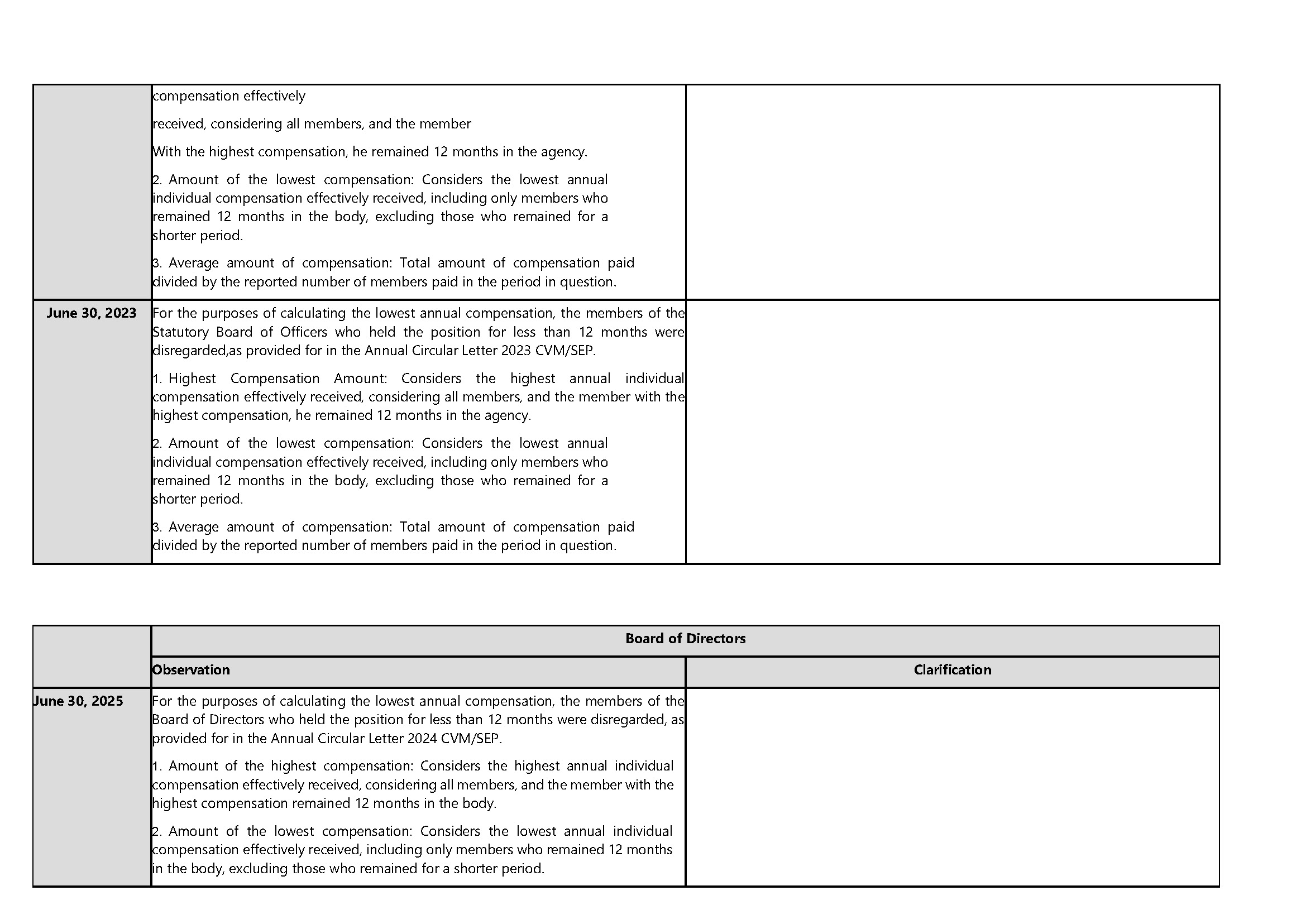 compensation effectively received, considering all members, and the member With the highest compensation, he remained 12 months in the agency . 2. Amount of the lowest compensation : Considers the lowest annual individual compensation effectively received, including only members who remained 12 months in the body, excluding those who remained for a shorter period . 3. Average amount of compensation : Total amount of compensation paid divided by the reported number of members paid in the period in question . For the purposes of calculating the lowest annual compensation, the members of the Statutory Board of Officers who held the position for less than 12 months were disregarded,as provided for in the Annual Circular Letter 2023 CVM/SEP . 1. Highest Compensation Amount : Considers the highest annual individual compensation effectively received, considering all members, and the member with the highest compensation, he remained 12 months in the agency . 2. Amount of the lowest compensation : Considers the lowest annual individual compensation effectively received, including only members who remained 12 months in the body, excluding those who remained for a shorter period . 3. Average amount of compensation : Total amount of compensation paid divided by the reported number of members paid in the period in question . June 30, 2023 Board of Directors Clarification Observation For the purposes of calculating the lowest annual compensation, the members of the Board of Directors who held the position for less than 12 months were disregarded, as provided for in the Annual Circular Letter 2024 CVM/SEP . 1. Amount of the highest compensation : Considers the highest annual individual compensation effectively received, considering all members, and the member with the highest compensation remained 12 months in the body . 2. Amount of the lowest compensation : Considers the lowest annual individual compensation effectively received, including only members who remained 12 months in the body, excluding those who remained for a shorter period . June 30, 2025