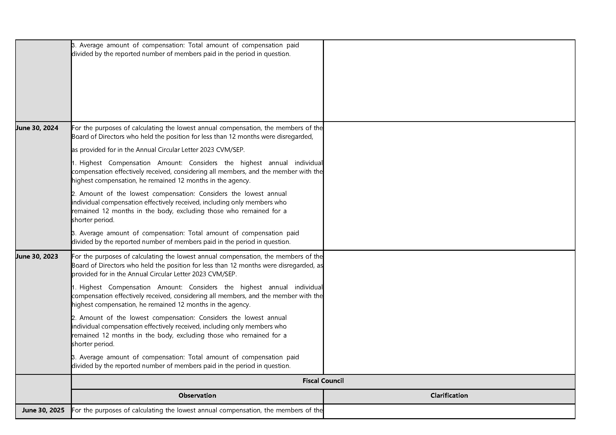 3. Average amount of compensation: Total amount of compensation paid divided by the reported number of members paid in the period in question. For the purposes of calculating the lowest annual compensation, the members of the Board of Directors who held the position for less than 12 months were disregarded, as provided for in the Annual Circular Letter 2023 CVM/SEP . 1. Highest Compensation Amount : Considers the highest annual individual compensation effectively received, considering all members, and the member with the highest compensation, he remained 12 months in the agency . 2. Amount of the lowest compensation : Considers the lowest annual individual compensation effectively received, including only members who remained 12 months in the body, excluding those who remained for a shorter period . 3. Average amount of compensation: Total amount of compensation paid divided by the reported number of members paid in the period in question. June 30, 2024 For the purposes of calculating the lowest annual compensation, the members of the Board of Directors who held the position for less than 12 months were disregarded, as provided for in the Annual Circular Letter 2023 CVM/SEP . 1. Highest Compensation Amount : Considers the highest annual individual compensation effectively received, considering all members, and the member with the highest compensation, he remained 12 months in the agency . 2. Amount of the lowest compensation : Considers the lowest annual individual compensation effectively received, including only members who remained 12 months in the body, excluding those who remained for a shorter period . 3. Average amount of compensation: Total amount of compensation paid divided by the reported number of members paid in the period in question. June 30, 2023 Fiscal Council Clarification Observation For the purposes of calculating the lowest annual compensation, the members of the June 30, 2025